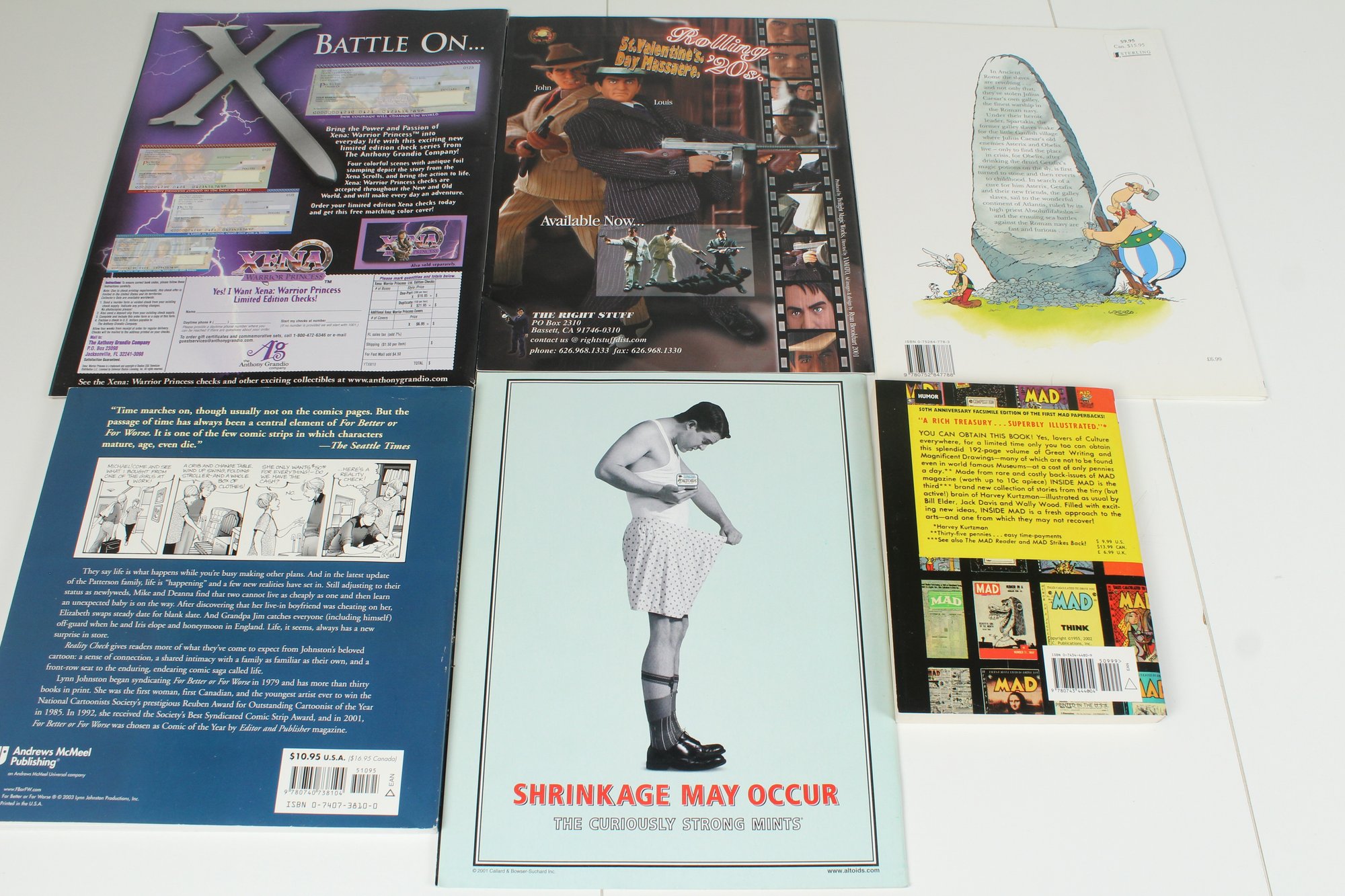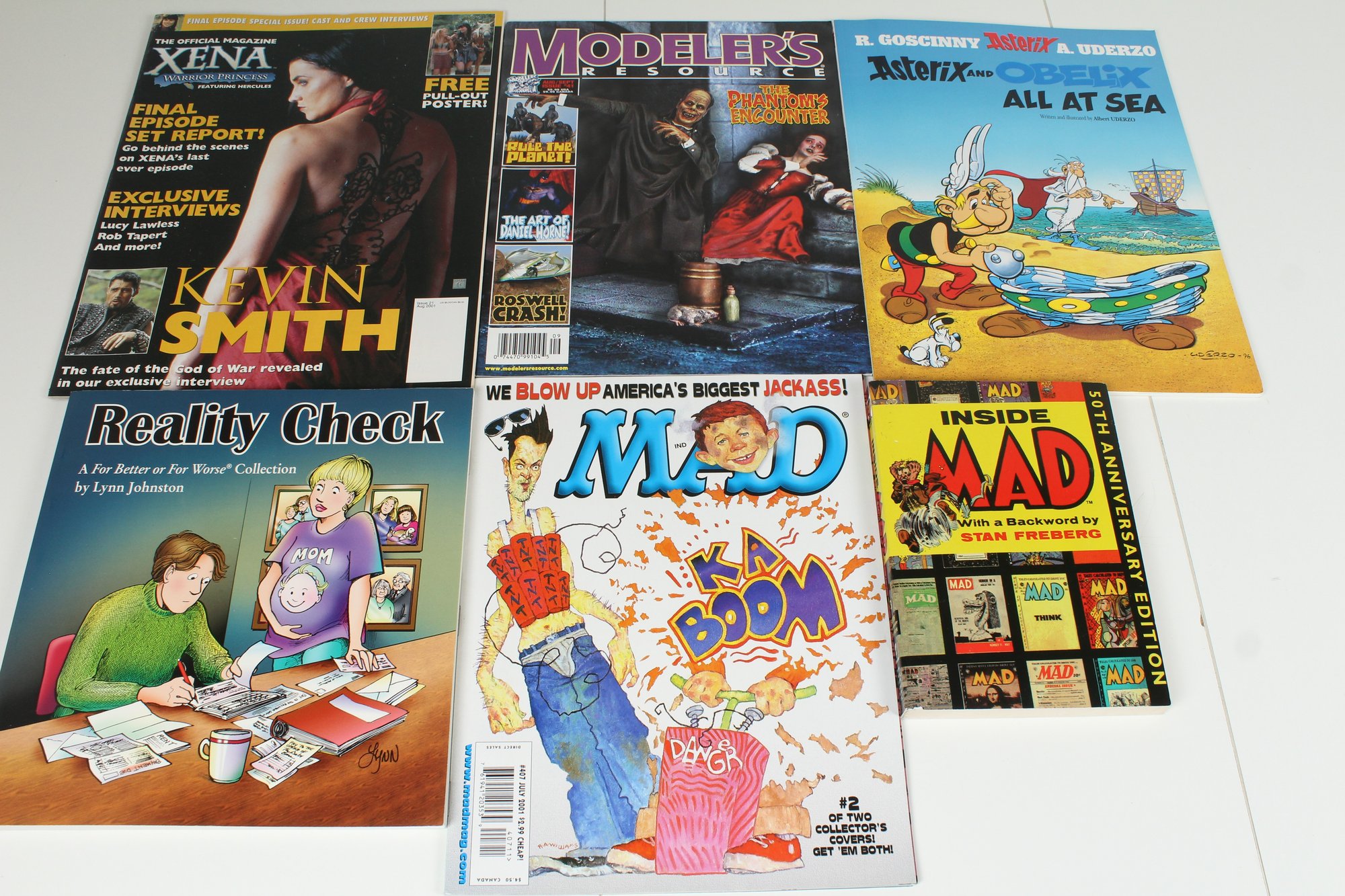 This is a lot of 6 Assorted Magazines & Books. Includes Xena, Modeler's & Mad Magazine. Asteric Graphic Novel, Reality Check Graphic "Novel Comics, Mad Magazine Paperback Book. Items are in good condition and may have some normal wear and tear. Please See photos for condition