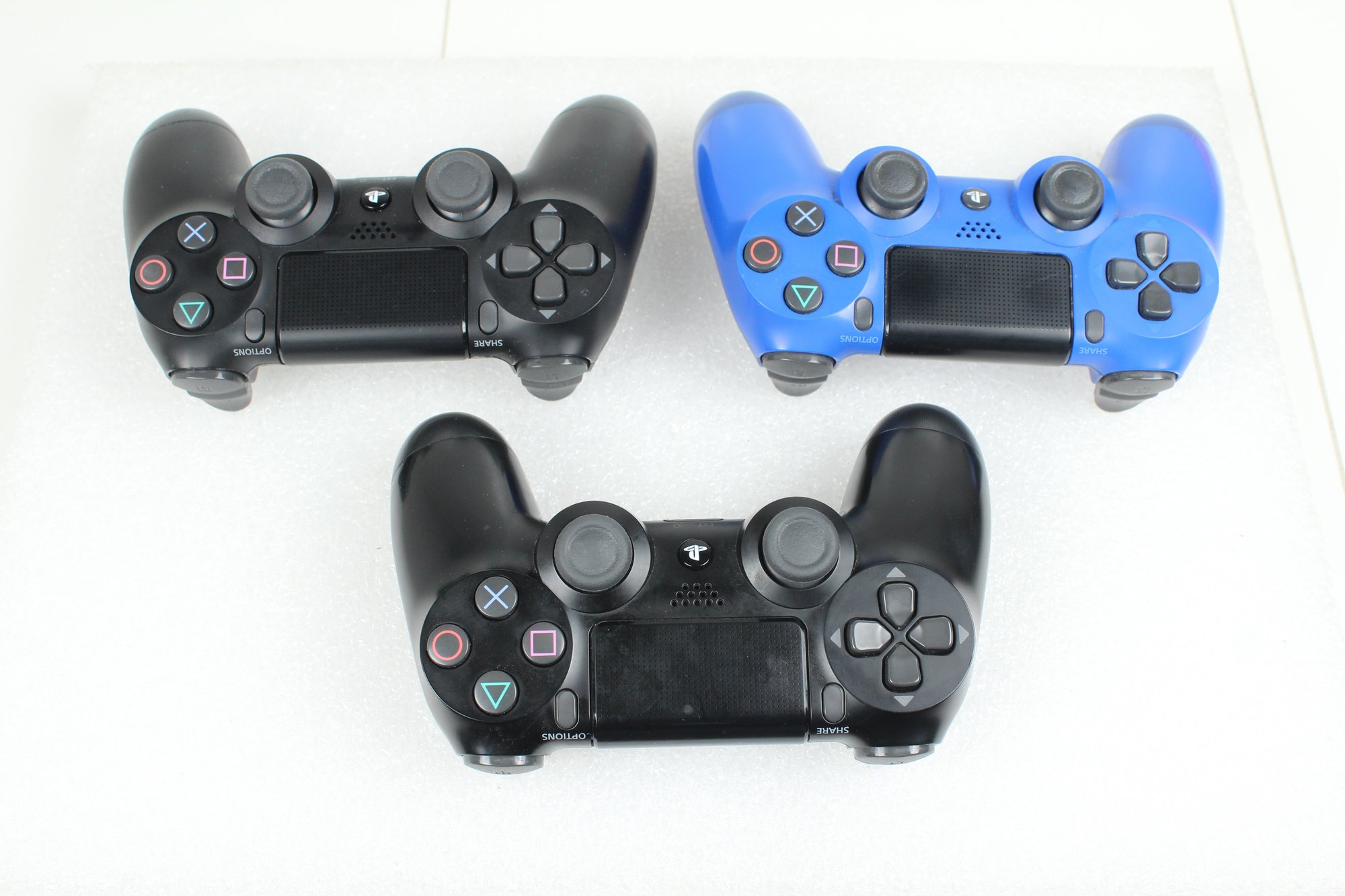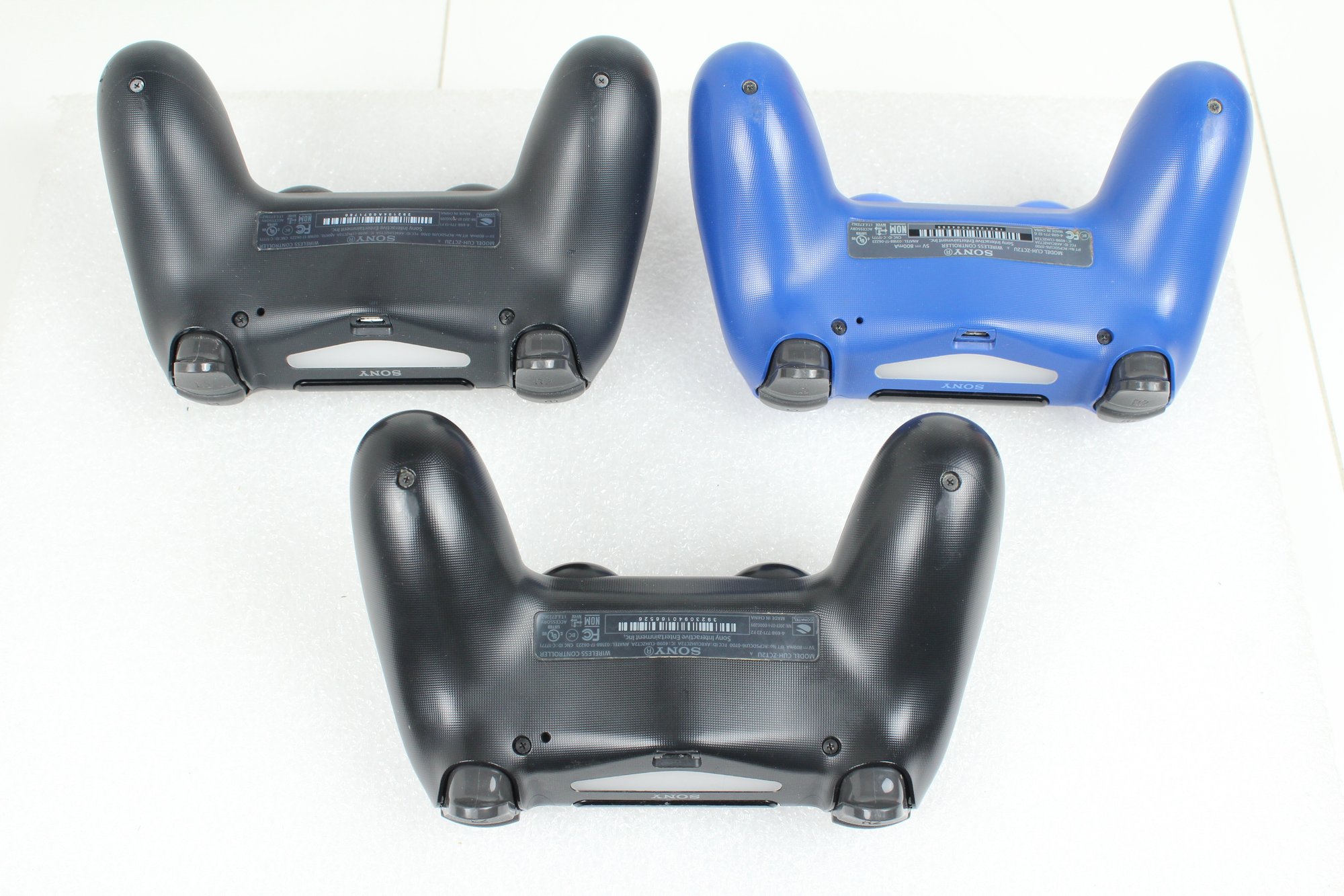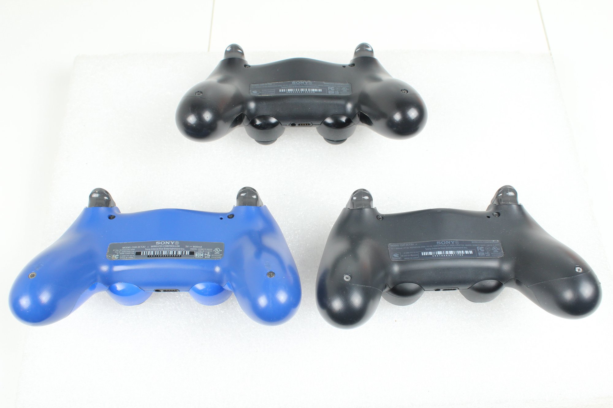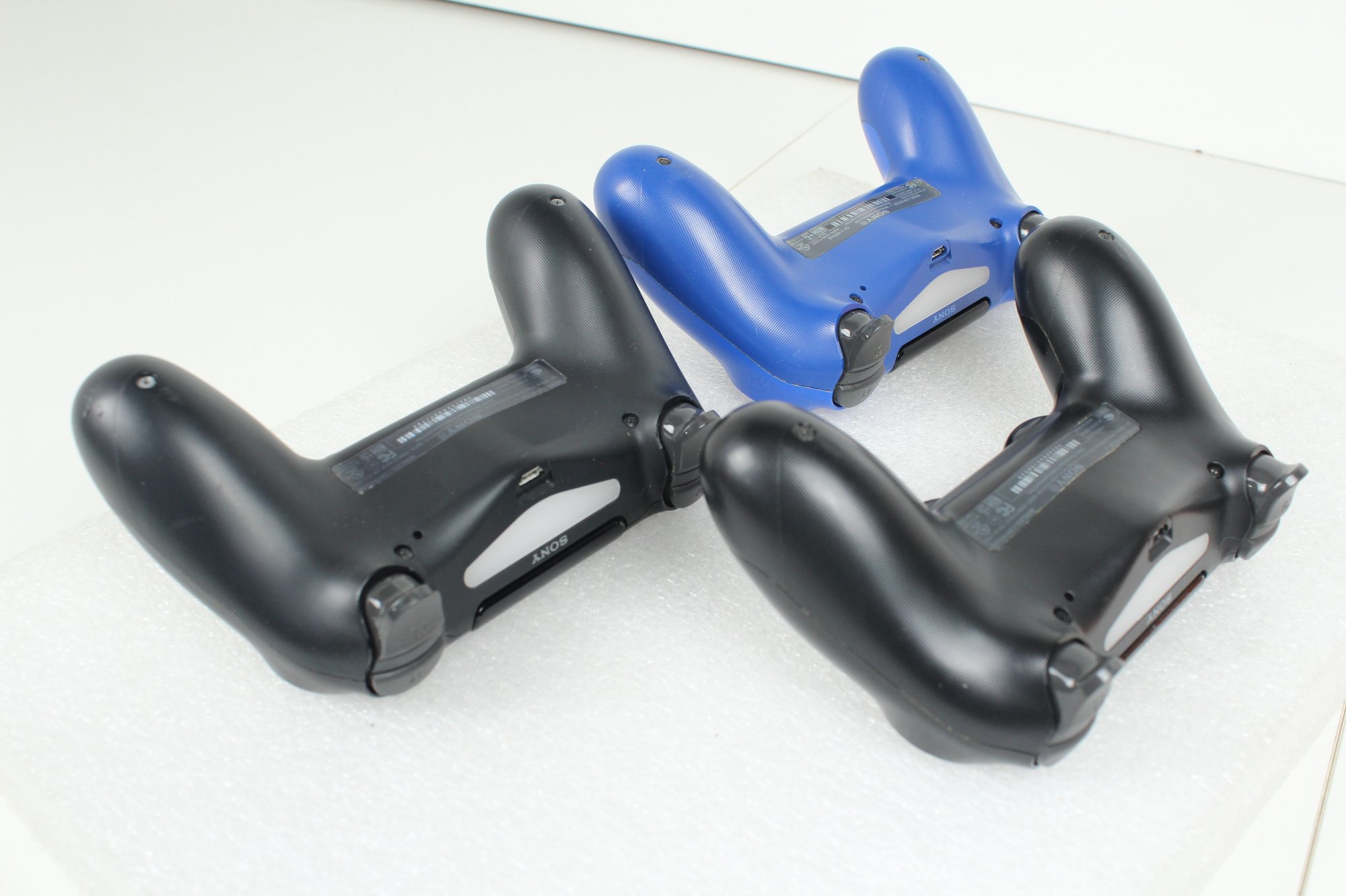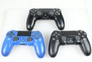 This lot includes 2 black and one blue wireless controllers for PS4. Model number CUH-ZCT2U. They all look to be in OK condition. None have been tested.
