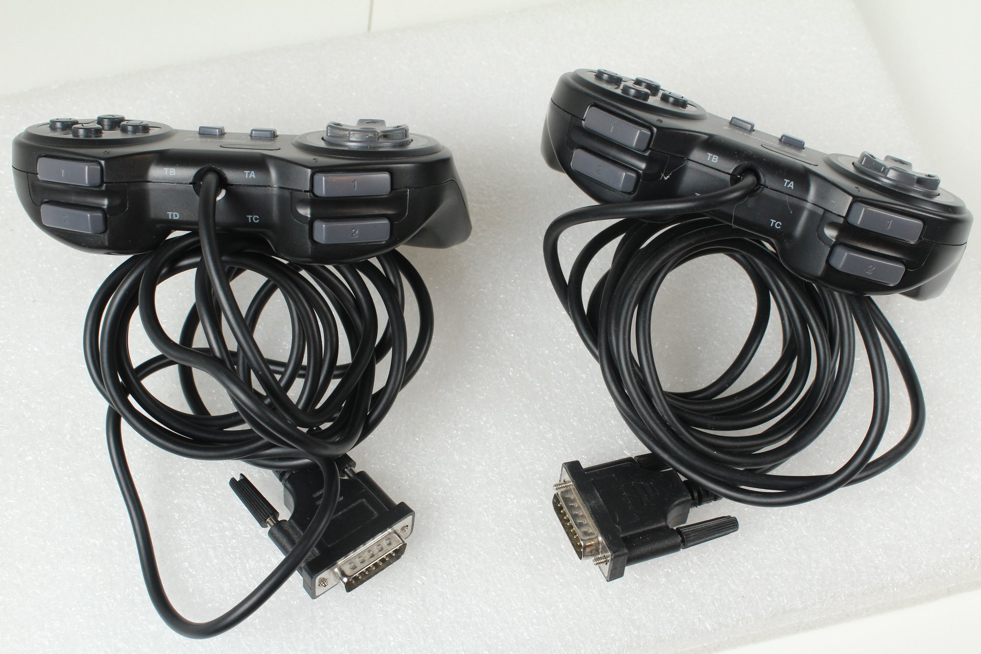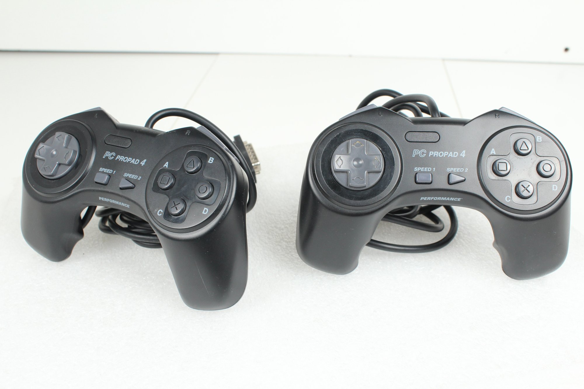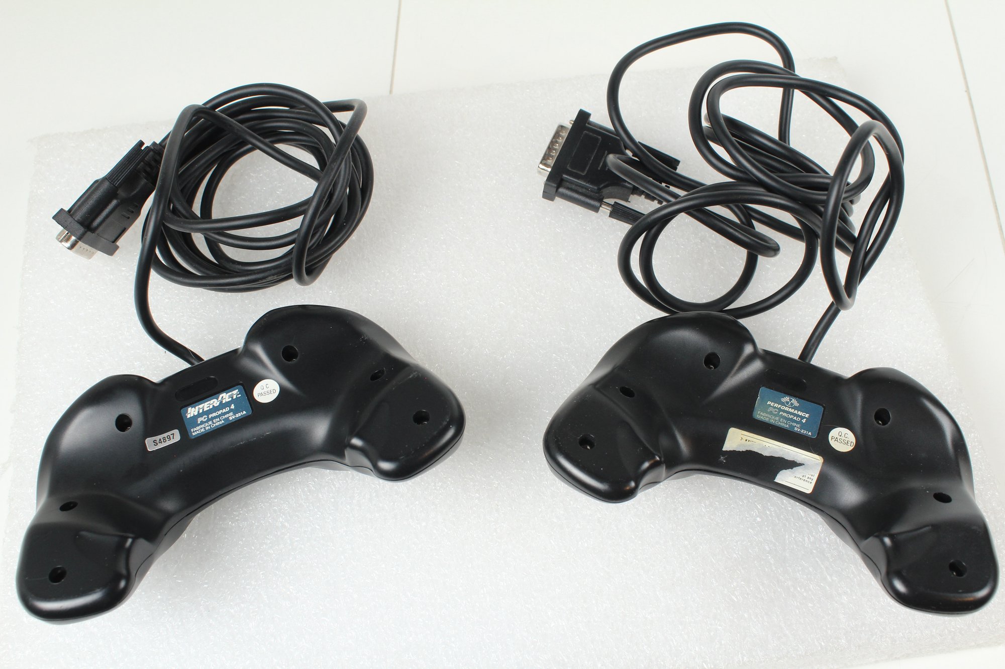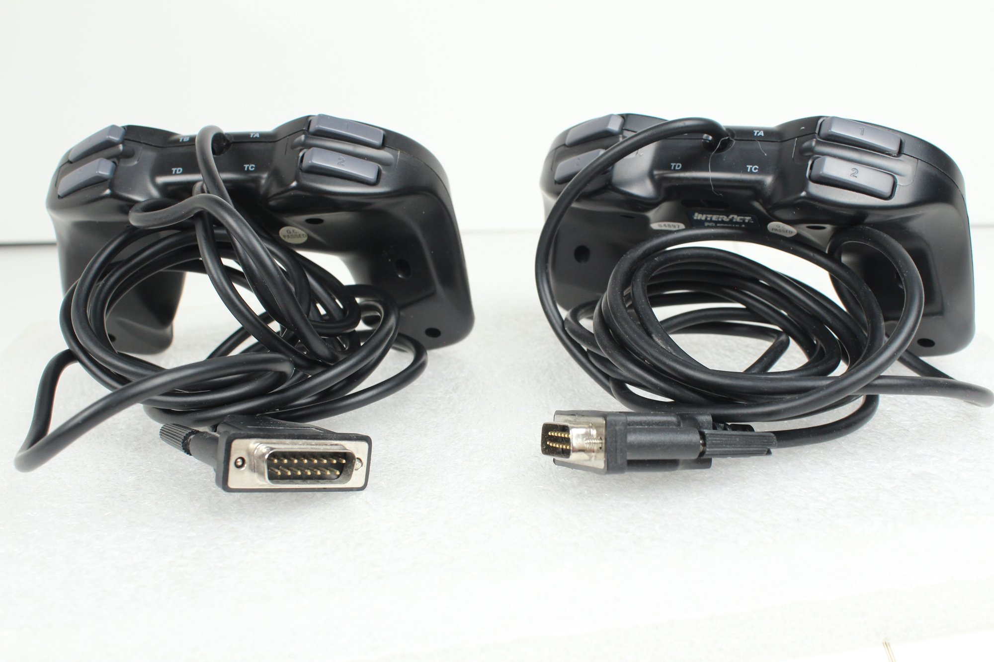 This lot has 2 black wired controllers from InterAct with 15 pin plugs for older model PCs. The ProPad 4, model number SV-231A is likely from the 1990s for use with DOS or early Windows games. These both look to be in OK condition. Neither has been tested.