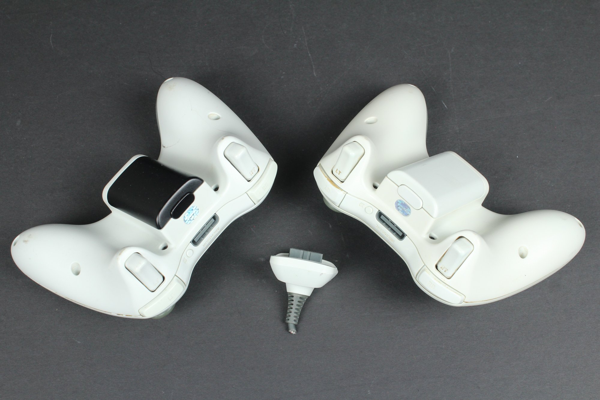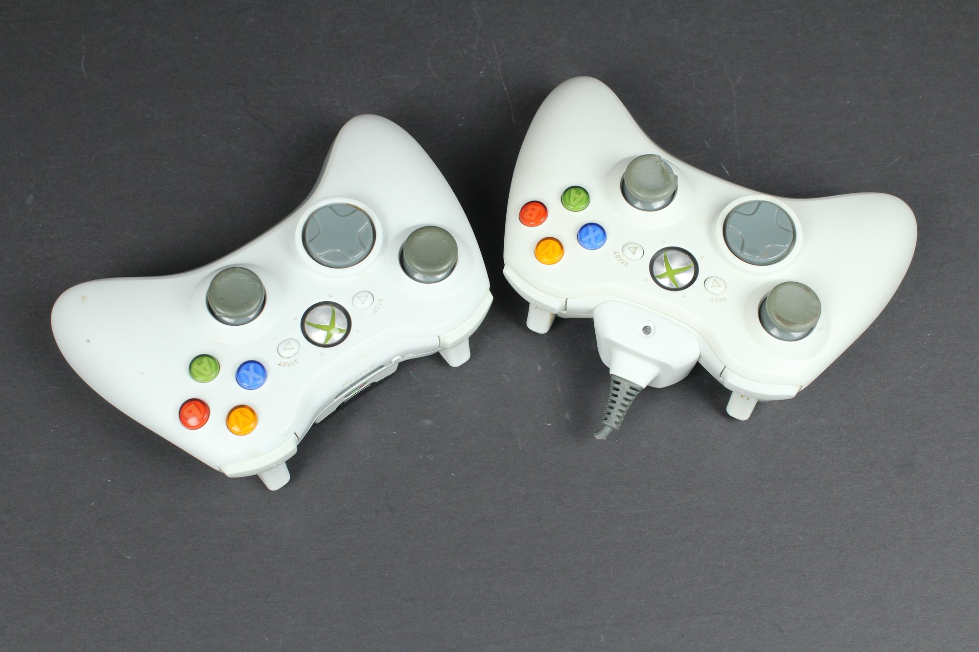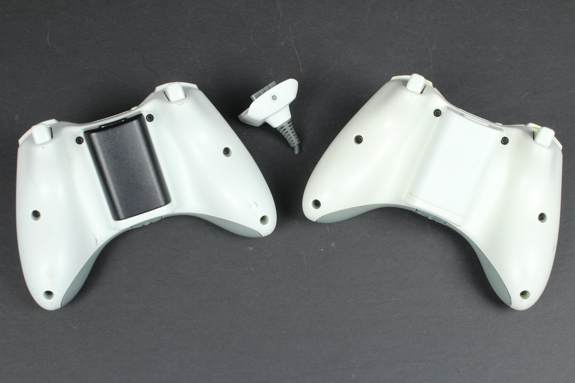 Both of these controllers have the battery pack, one of them is black though. Attached to one is the wired plugin charger, although the cord is cut. Both controllers look to be in OK condition. Neither has been tested.