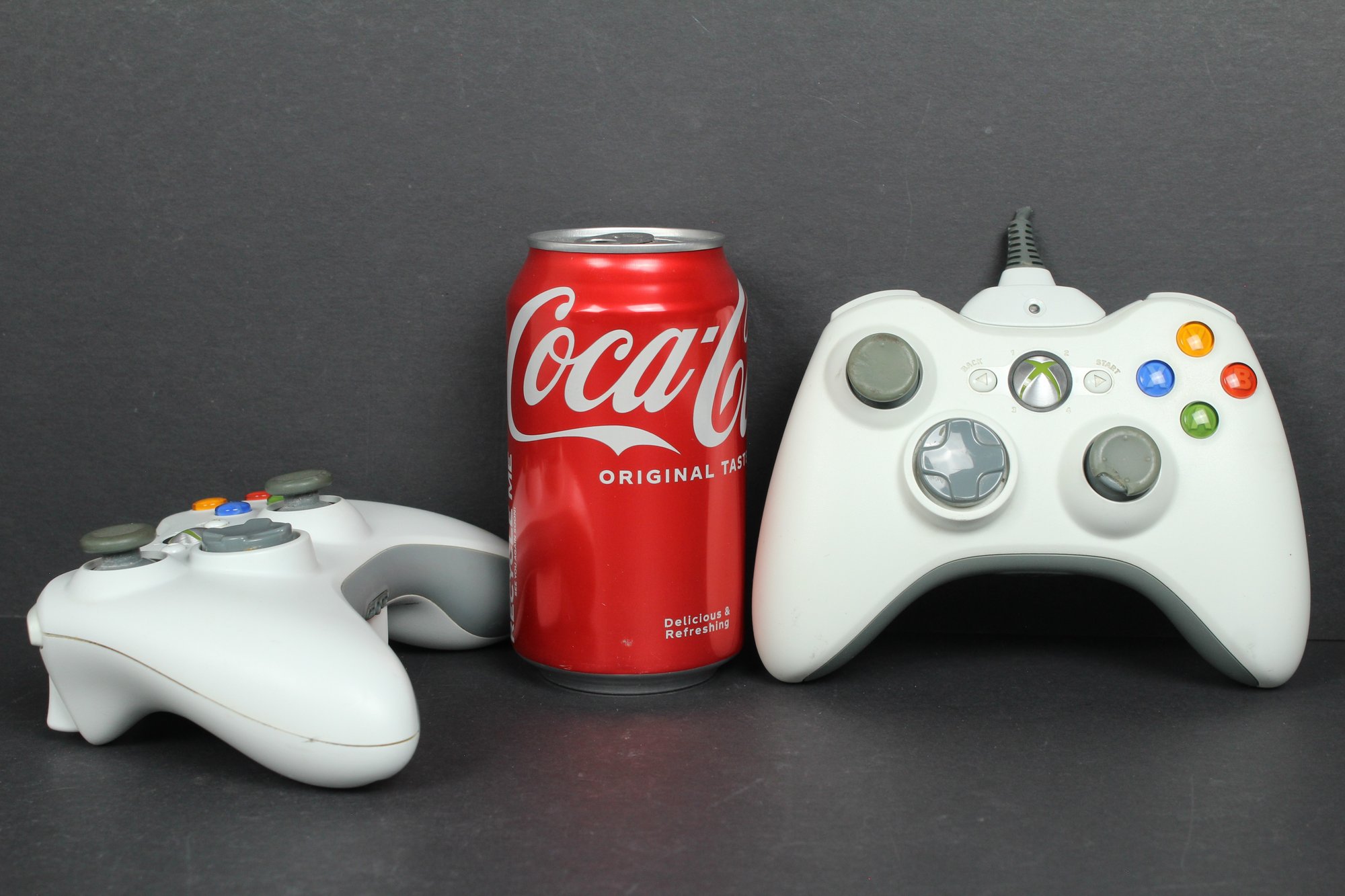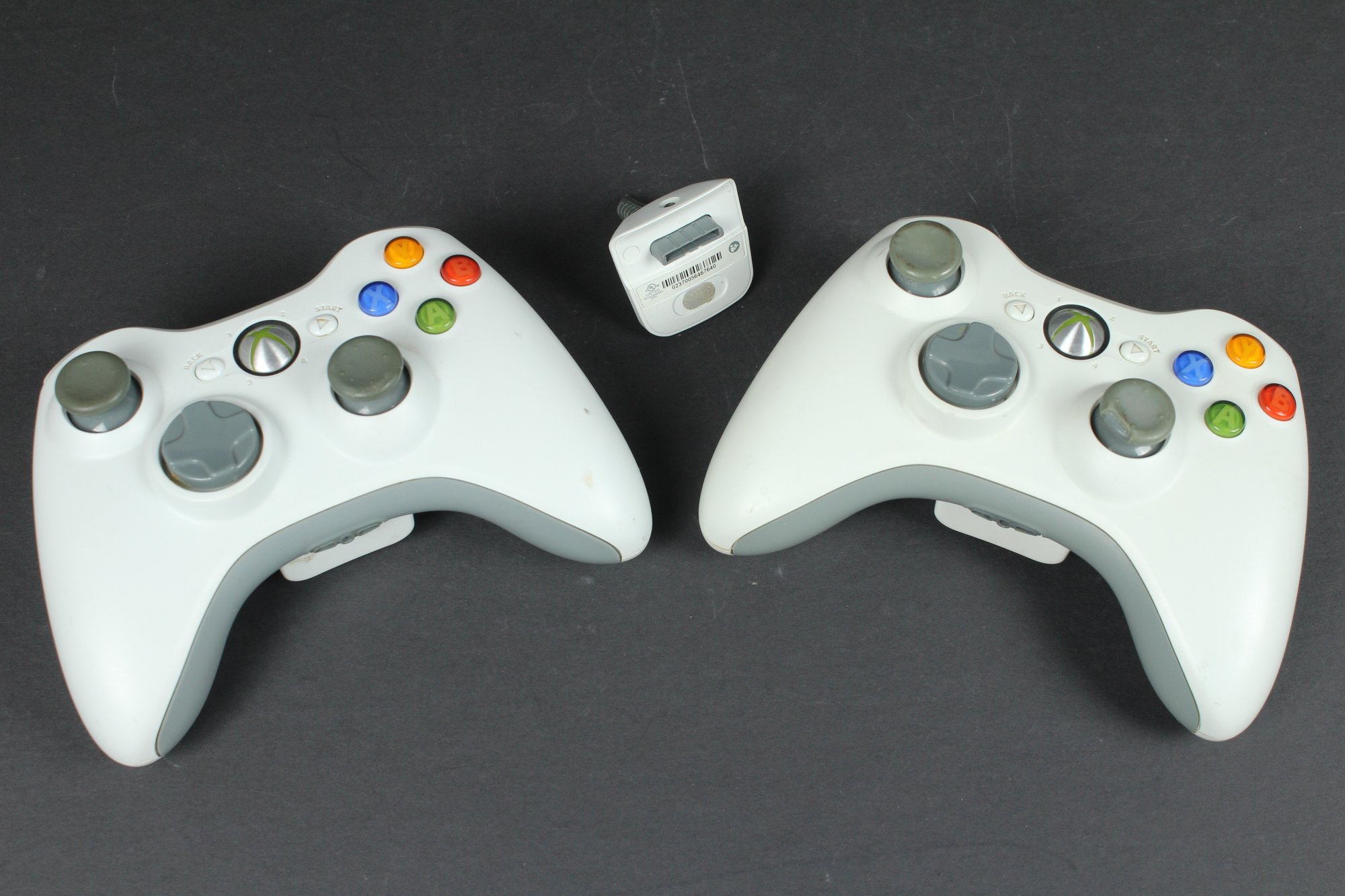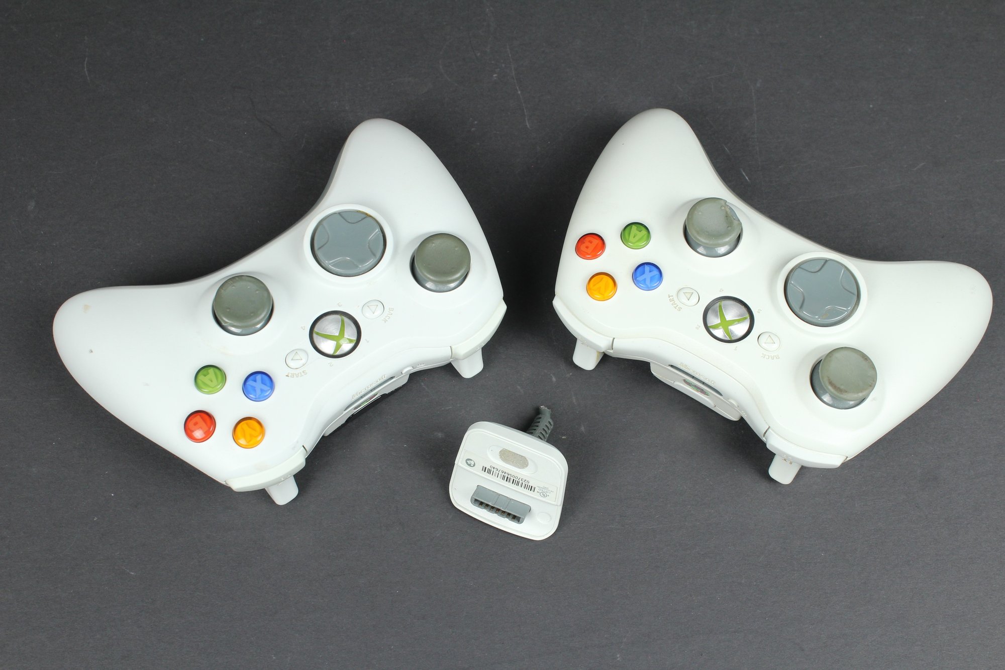Both of these controllers have the battery pack, one of them is black though. Attached to one is the wired plugin charger, although the cord is cut. Both controllers look to be in OK condition. Neither has been tested.