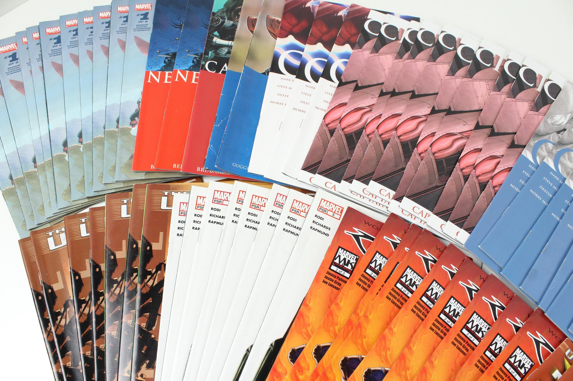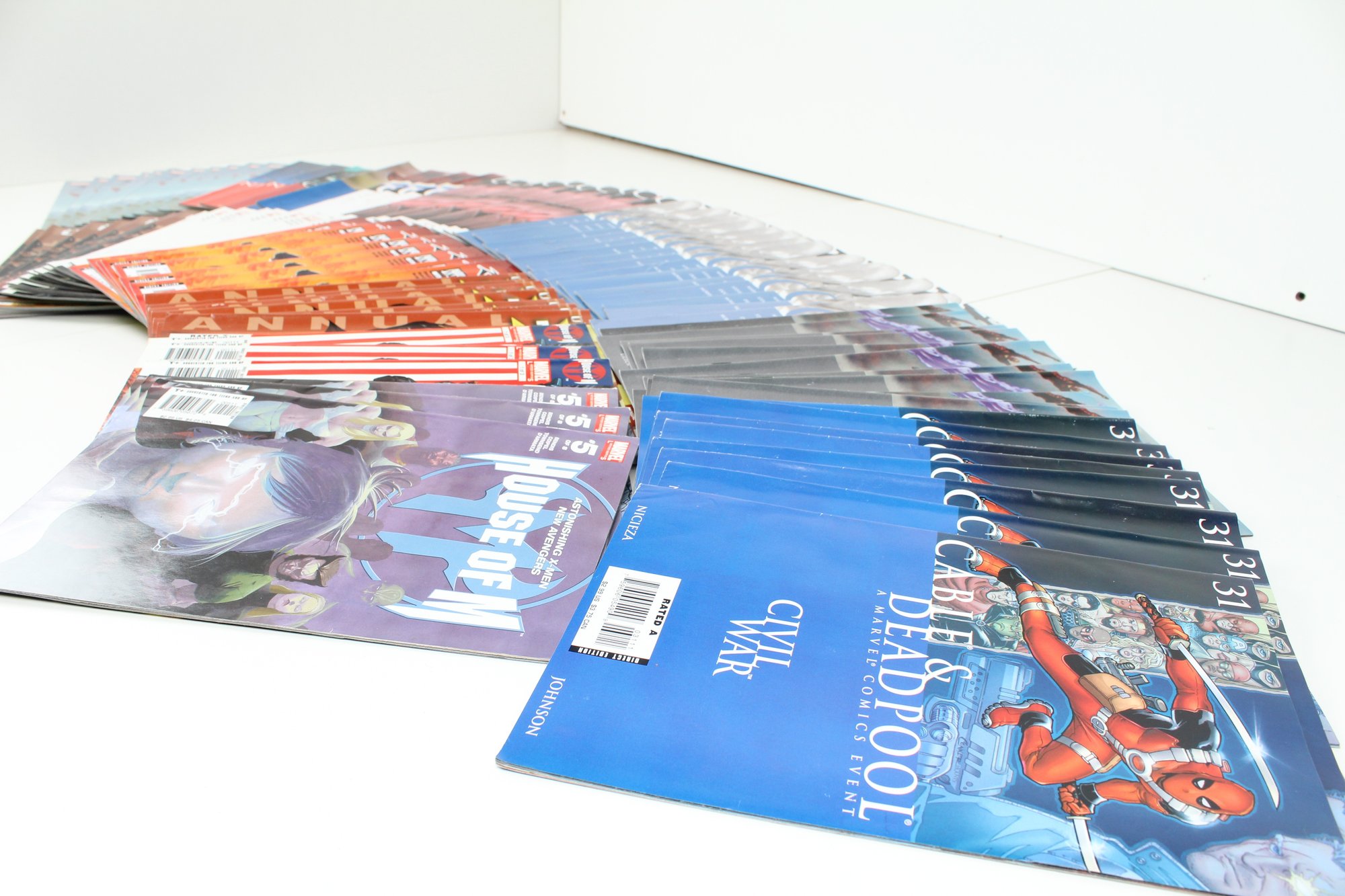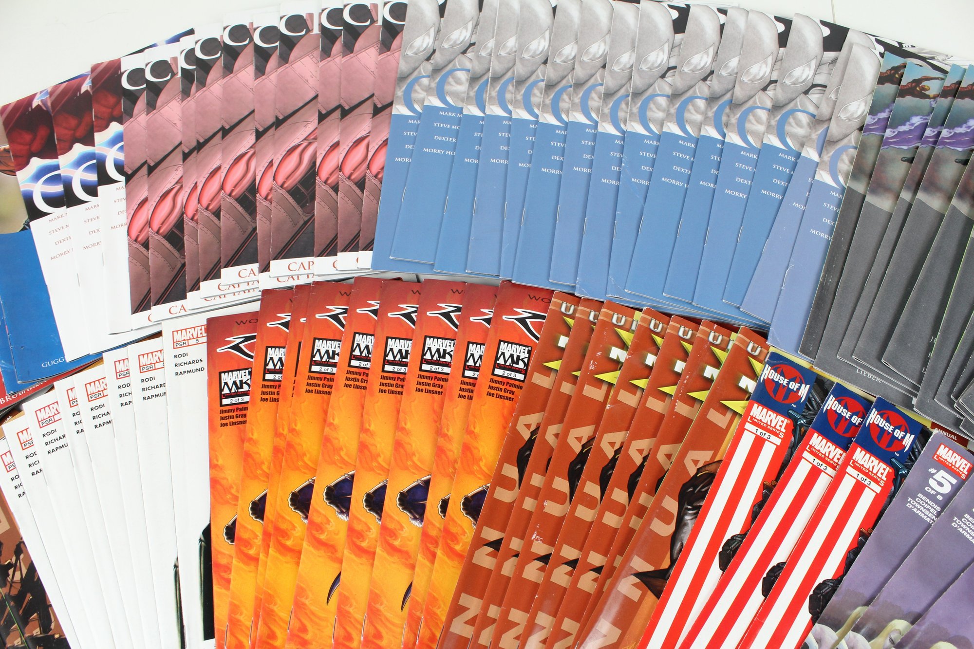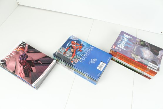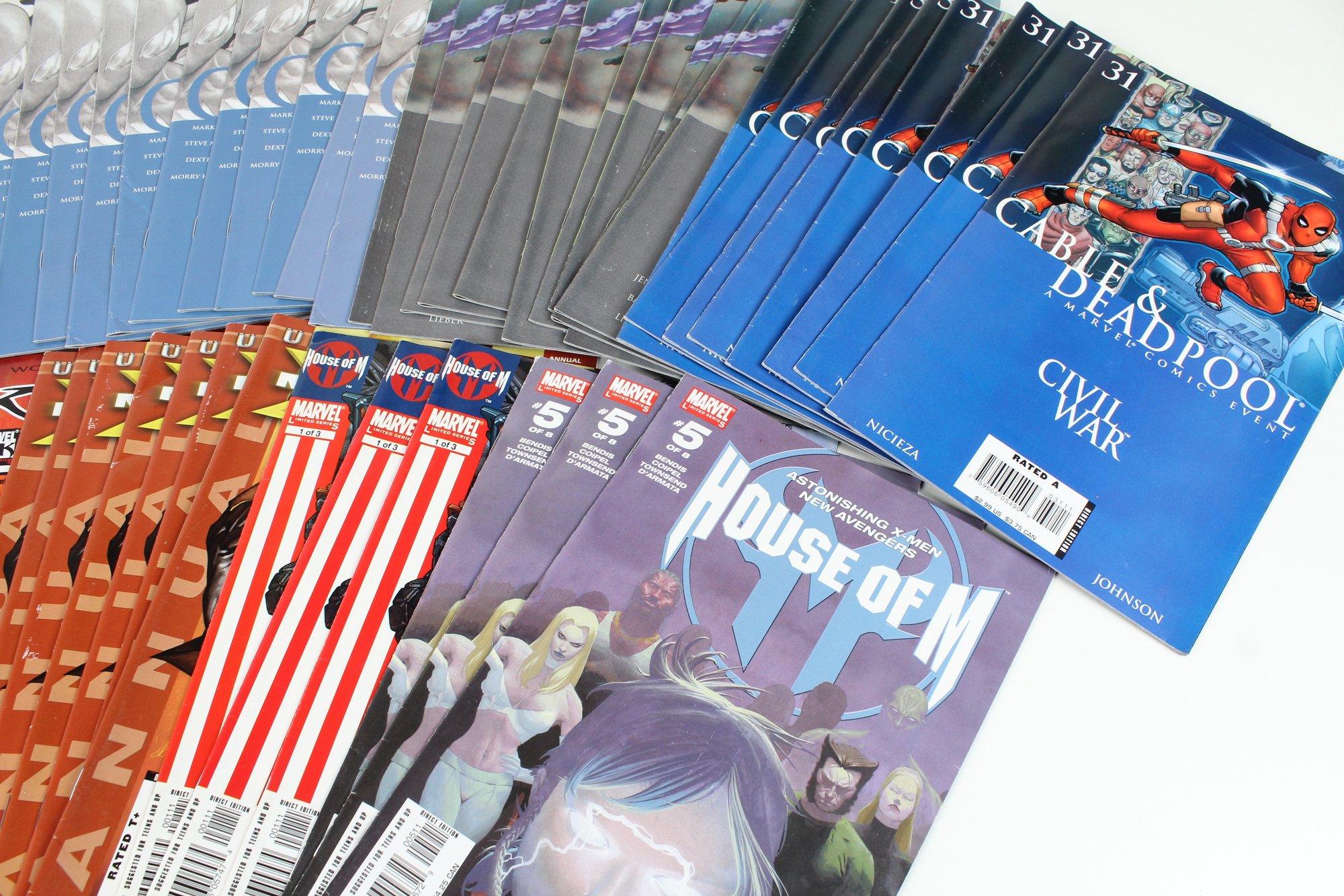 Approximatly 100 Comics are includes. This bundle includes bunches of the same comic. Includes House of M, X-Men, Deadpool, Civil War & More. All comics are in good condition, great reader copies. May have some damaged corners and wear. No Shipping