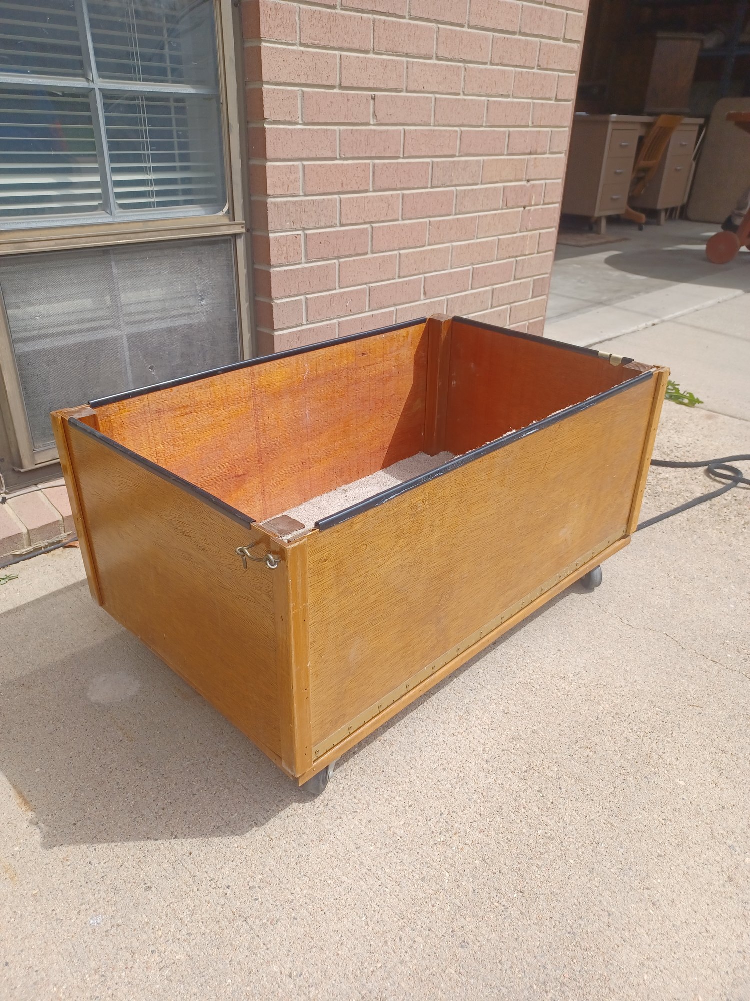 This thing should have been mass marketed because it has a little more than a million uses. Has four wheels and all of them swivel a full 360 degrees and roll very well. Has a rope handle so you can pull it! It is carpeted inside to protect the precious things that you are transporting or to lure cats into it for super fun cat time. Probably home made because I tried to look it up on Ebay and there weren't any. One of a kind! 15 1/2 inches high, 30 inches long and 18 inches wide.