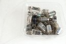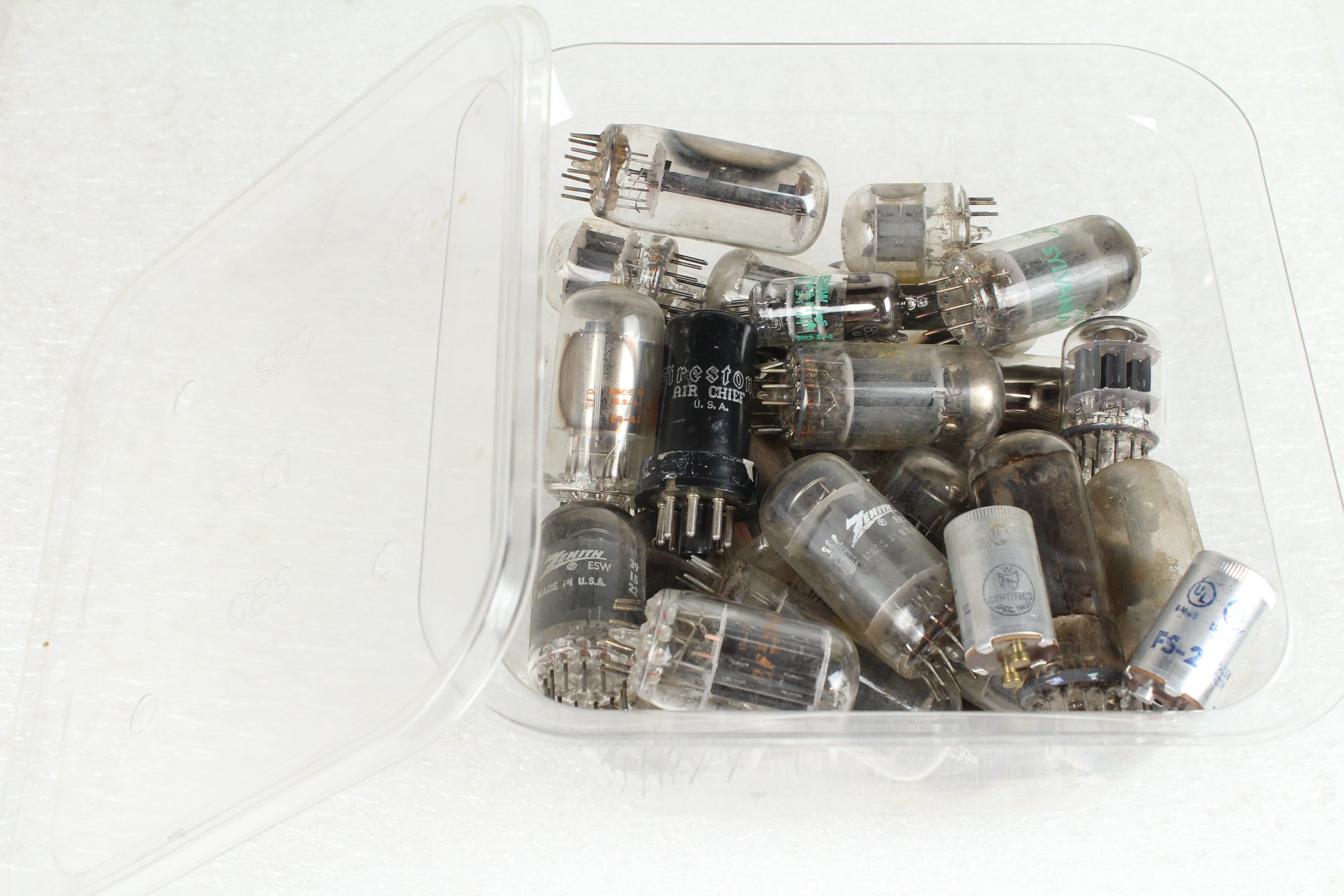 Small tub full of vacuum tubes. Did not count how many were in there but the tub measures roughly 8 x 8 x 5. None of the tubes have been tested and there are a few small flourescent ballasts in there too. No Shipping