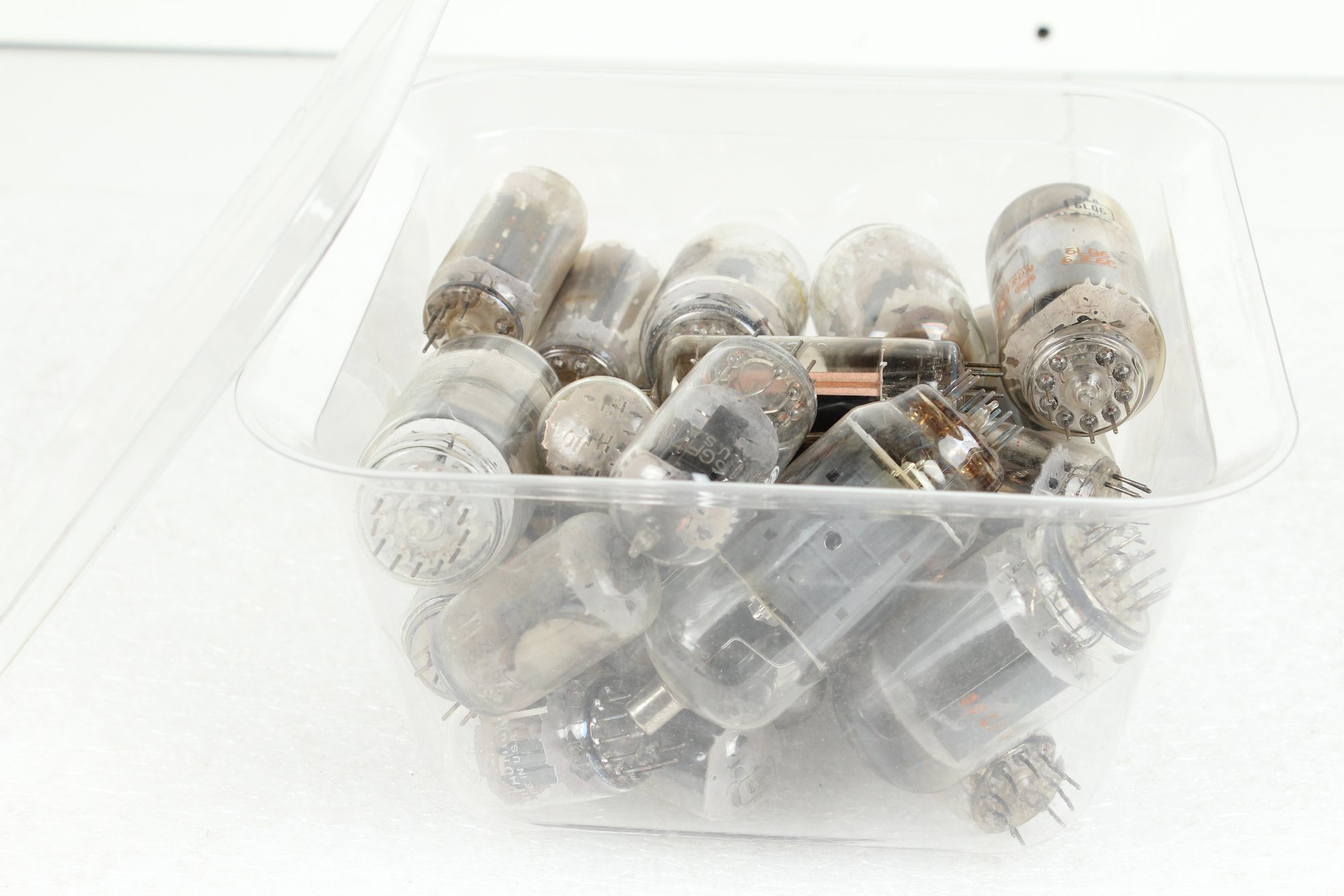 Small tub full of vacuum tubes. Did not count how many were in there but the tub measures roughly 8 x 8 x 5. None of the tubes have been tested. No Shipping.
