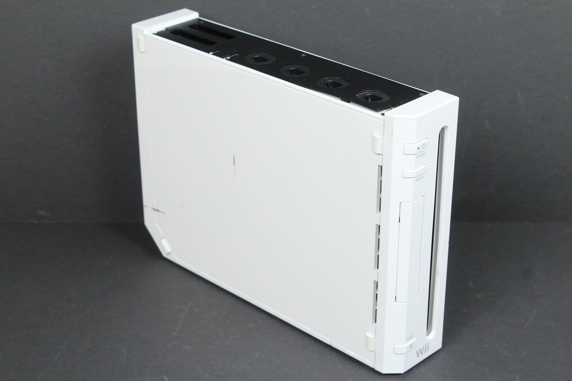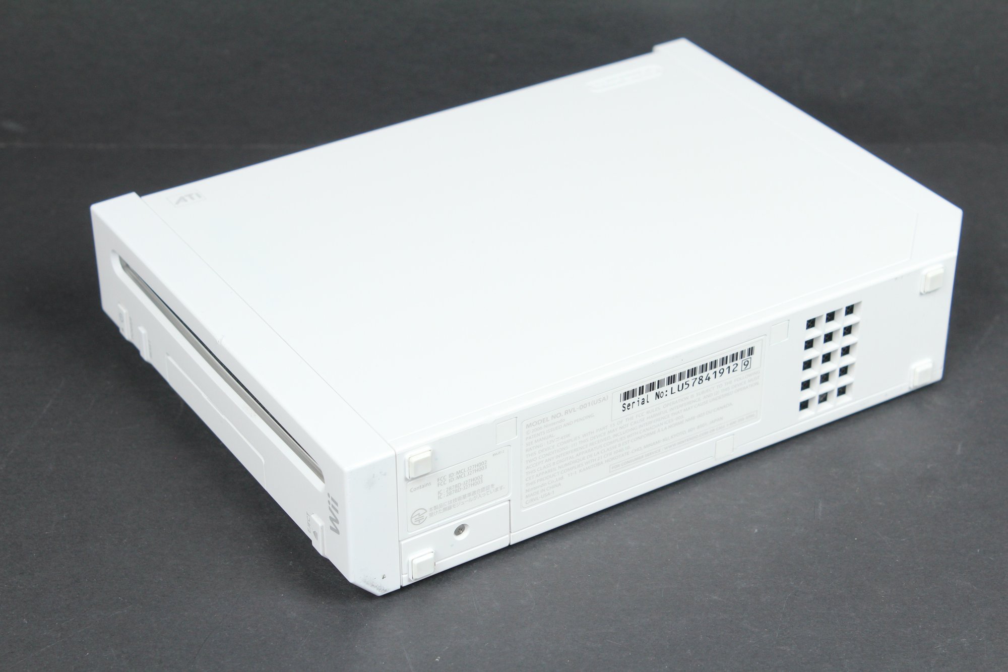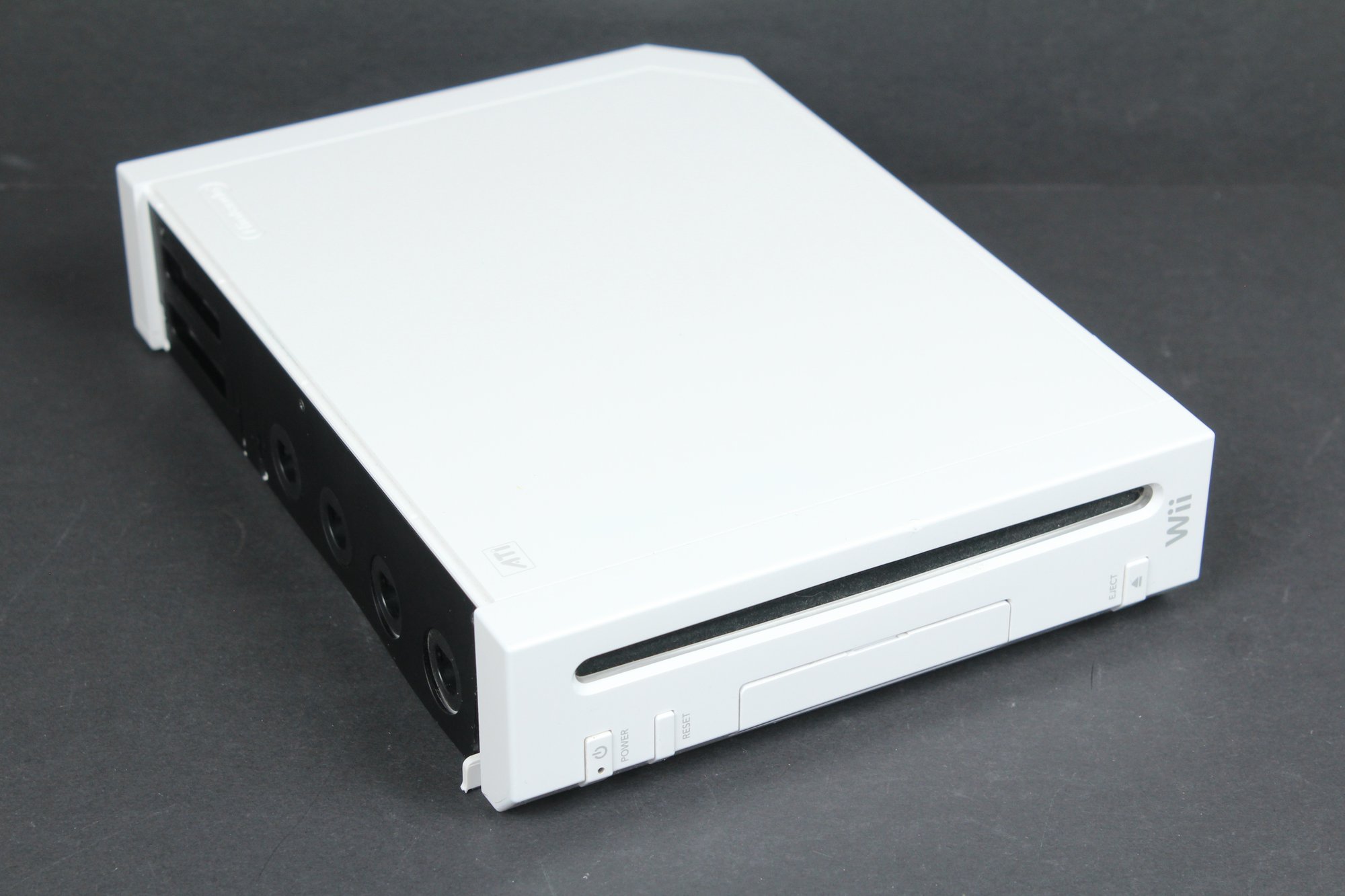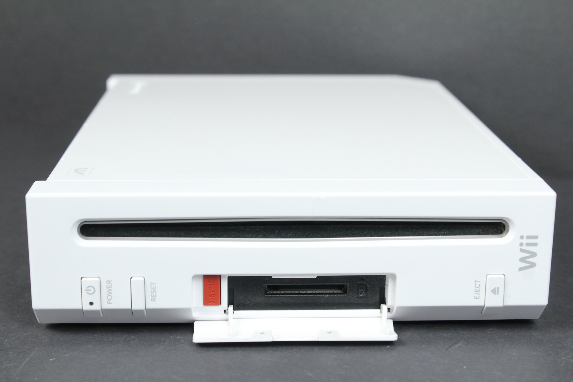 White Nintendo Wii. Powers on, connects to controllers. Does play games, sometime you have to press the eject a few times to eject. Cosmetic condition is fair with scuffs and missing two door covers. Does not include and cables, cords or accessories