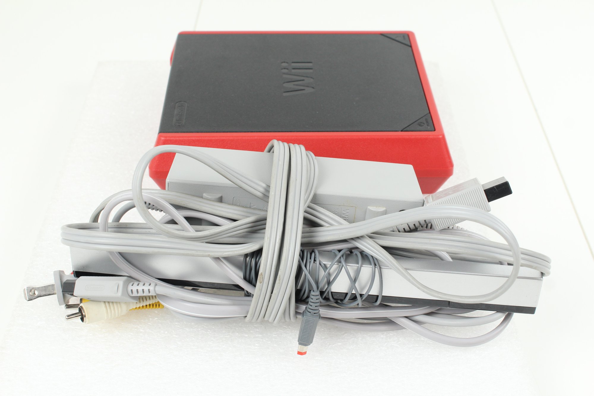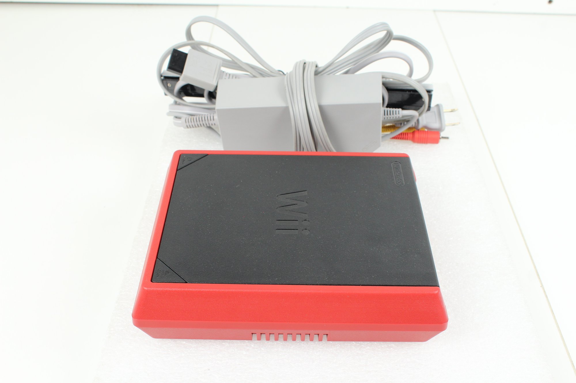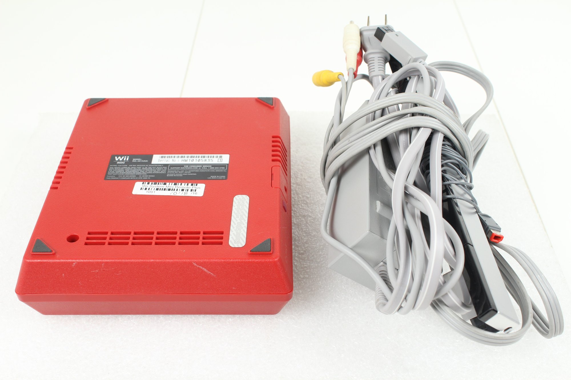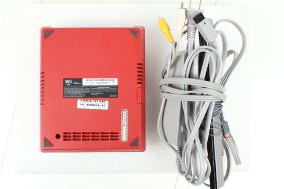 Red and Black Nintendo Wii. Plays games, connects to controllers. The disc drive is a little noisy but it does play games fine. Includes AV, power and sensor bar. Does not include any controllers