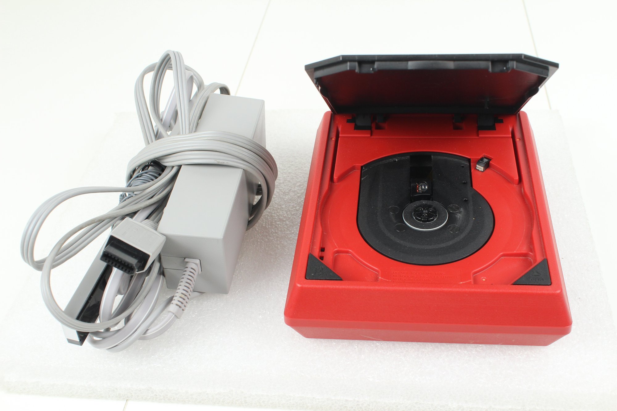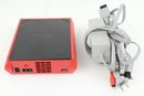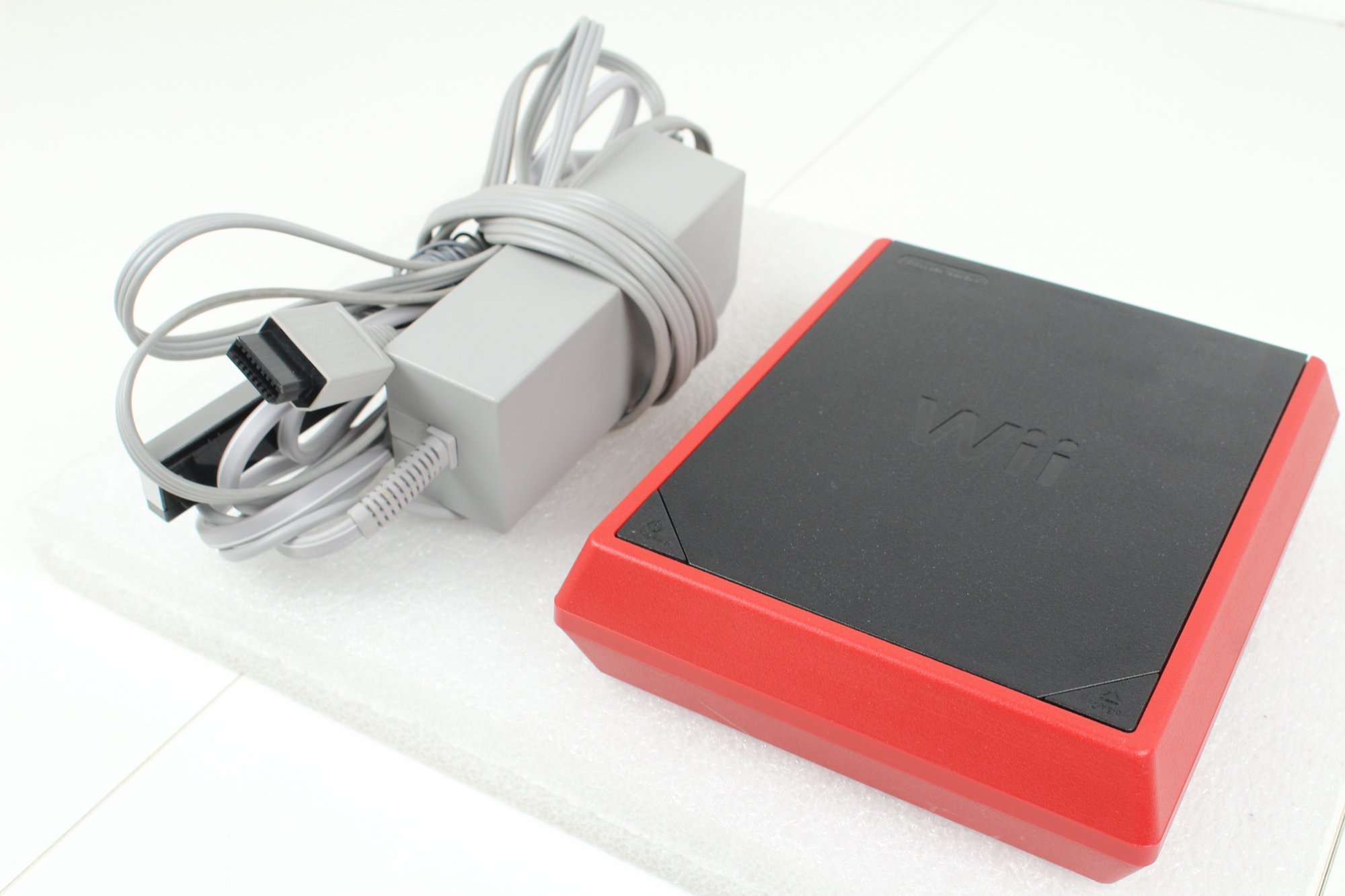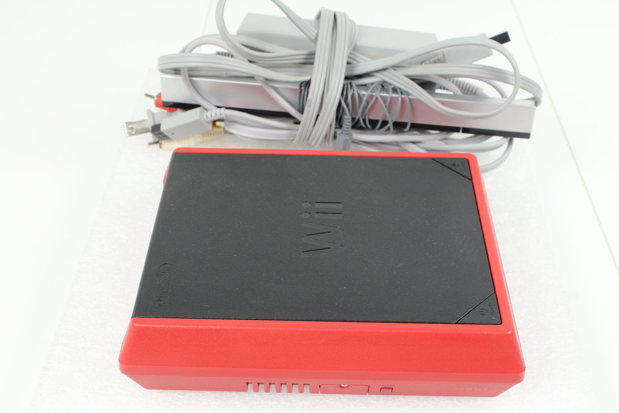 Red and Black Nintendo Wii. Plays games, connects to controllers. The disc drive is a little noisy but it does play games fine. Includes AV, power and sensor bar. Does not include any controllers