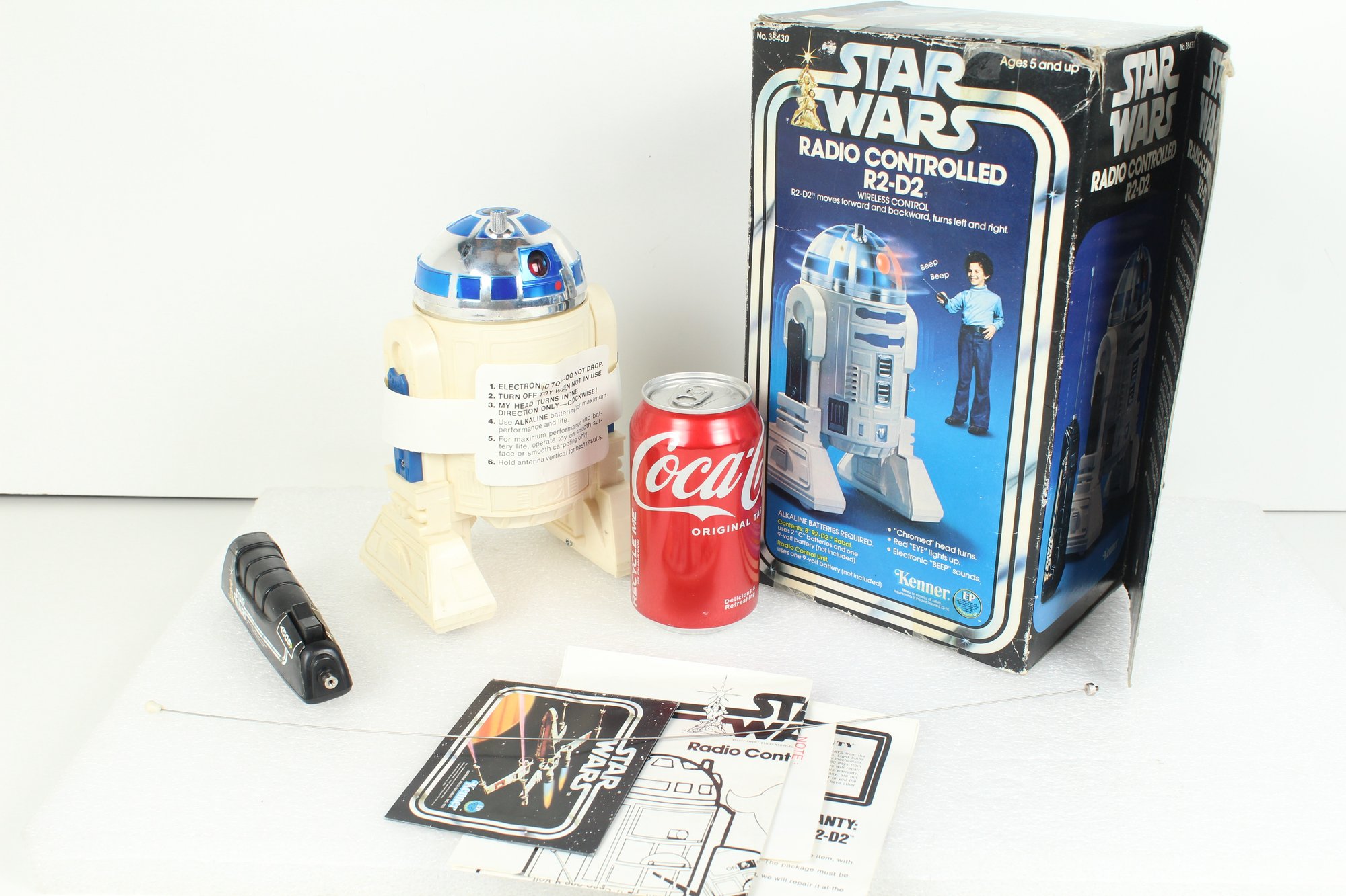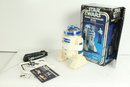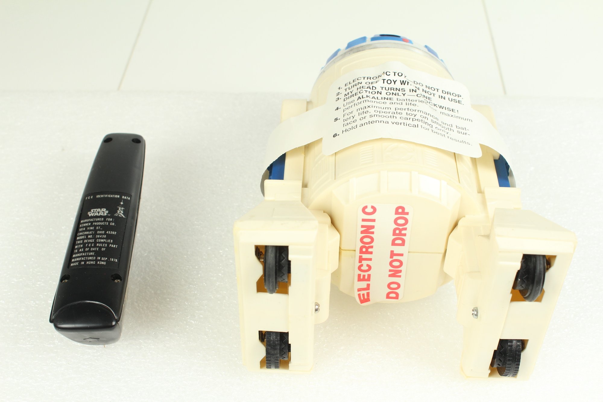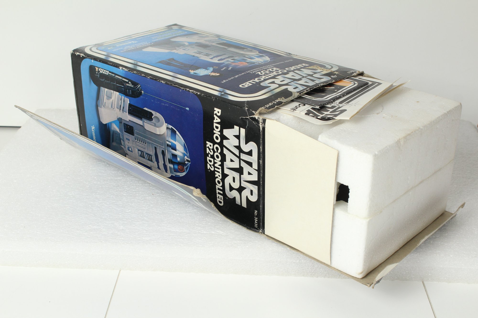 This R2-D2 comes in the original box and Styrofoam packaging. The robot still has the original stickers and band around the middle as well. All contents seem to be here including the remote, antenna, and instructions. The box is a little beat up, but the R2-D2 seems ok. Was not tested.