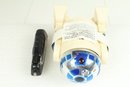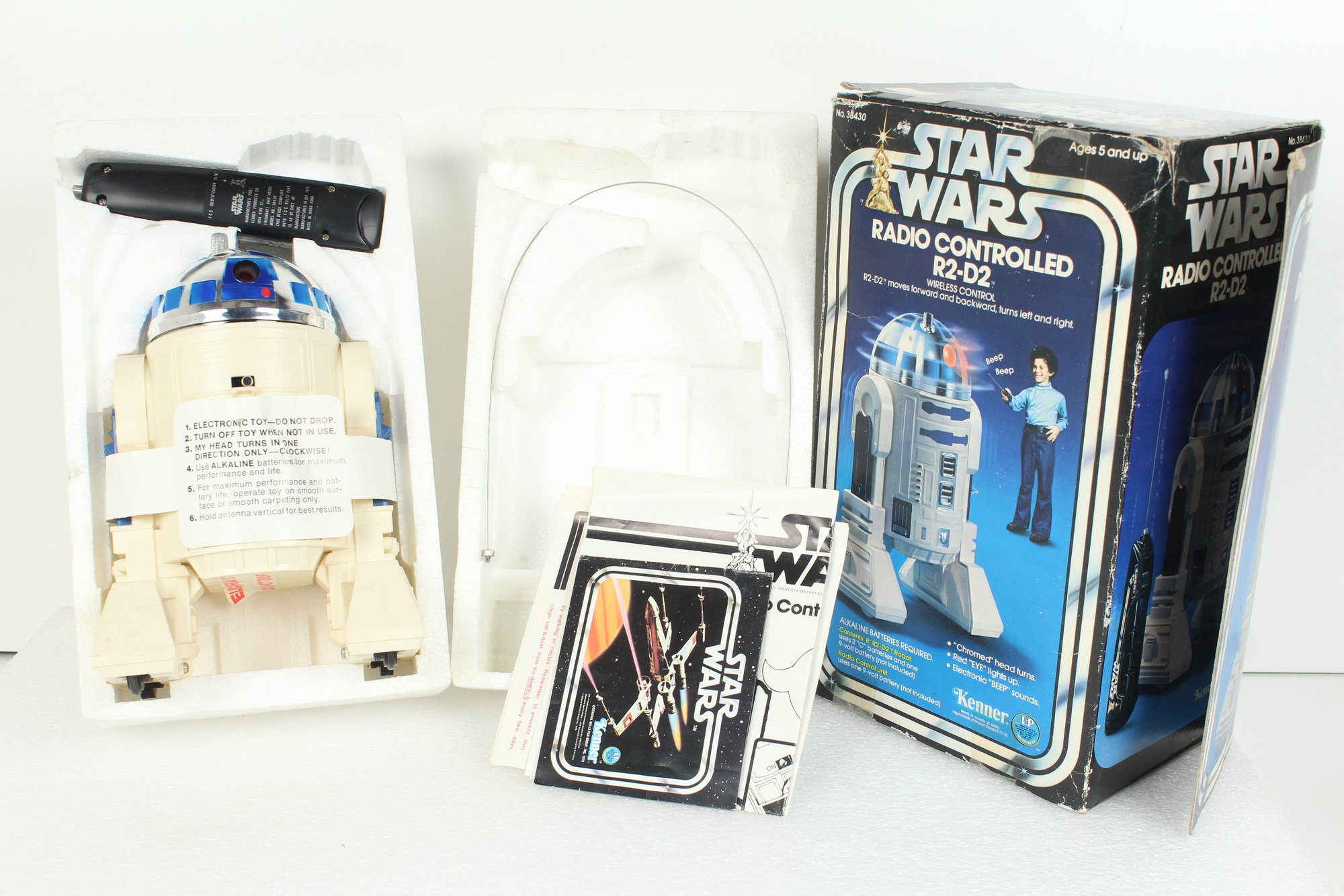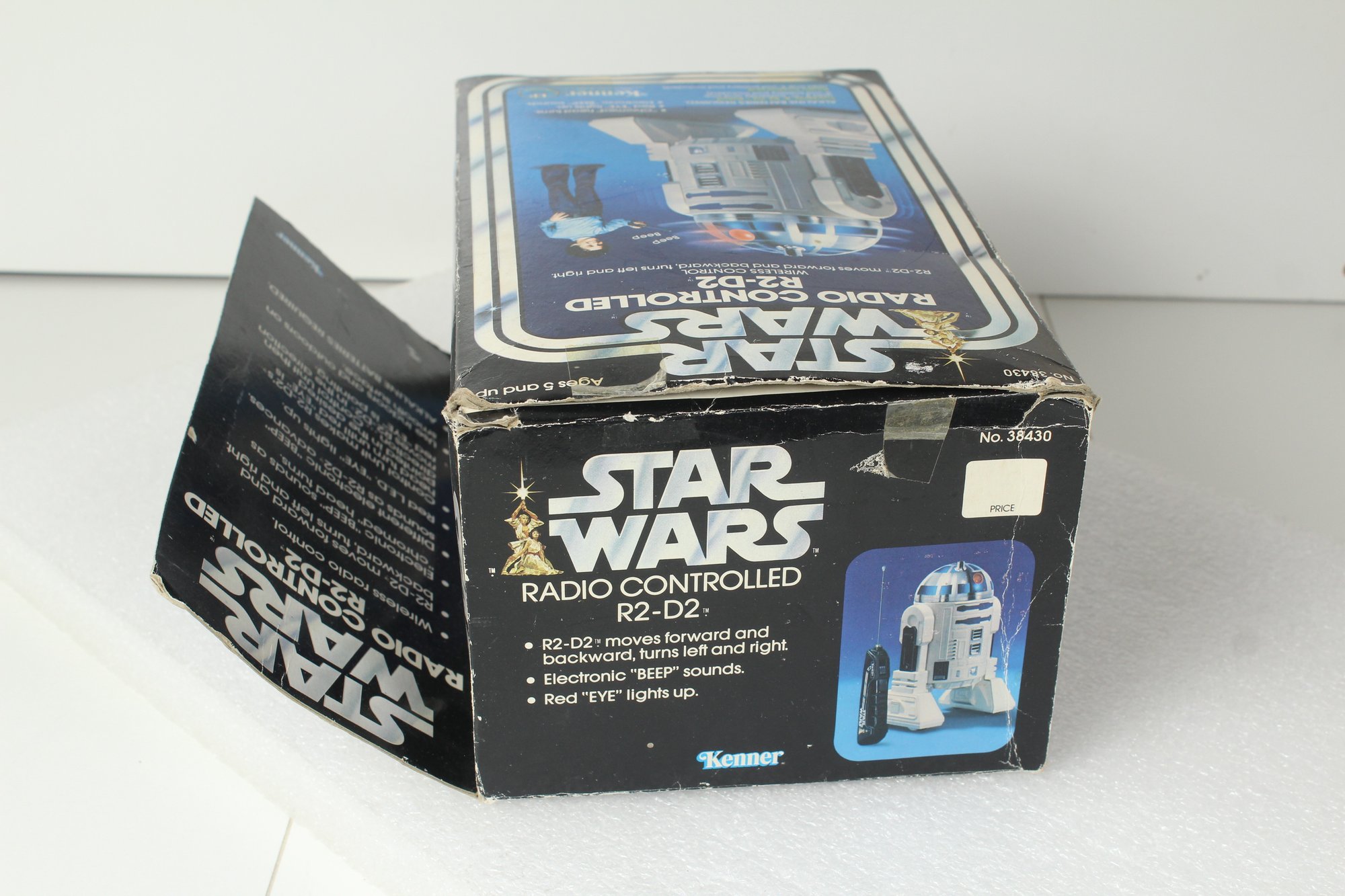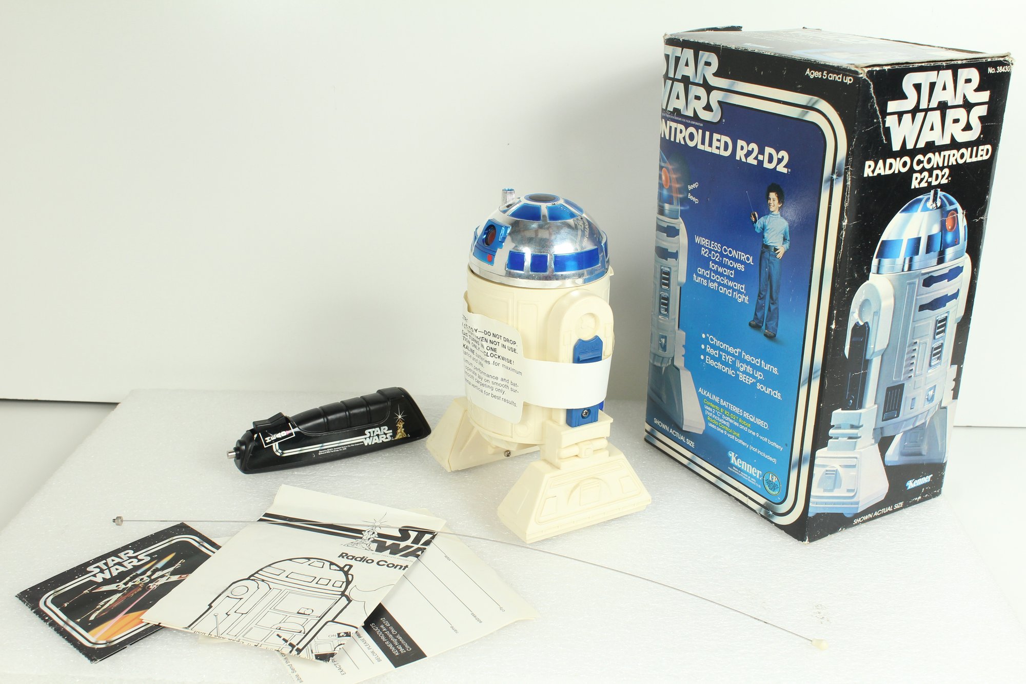 This R2-D2 comes in the original box and Styrofoam packaging. The robot still has the original stickers and band around the middle as well. All contents seem to be here including the remote, antenna, and instructions. The box is a little beat up, but the R2-D2 seems ok. Was not tested.