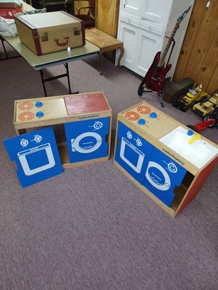 I am sure almost everyone looking at this remembers these. Wasn't it fun pretending to cook dinner and do laundry just to grow up and have to do these things for real? Well your kids, grandkids or neighbor kids will enjoy this. One of these is in really good condition and the other one is not. The good one is for playing with and the not good one is for parts when your kids break the good one. Winning bid comes with both. Each one measures 24 inches high, 29 inches wide and 12 inches deep.