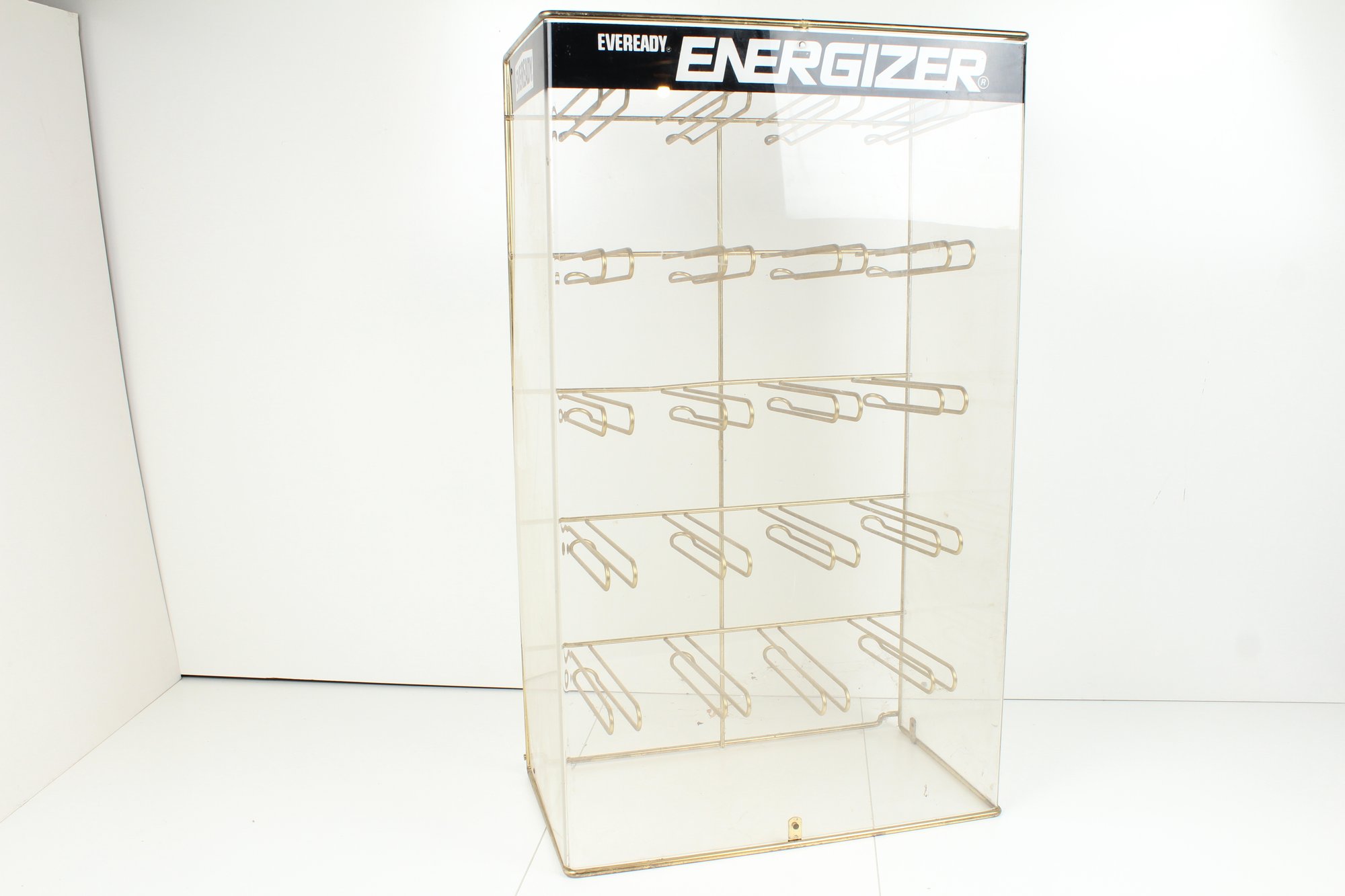 Remember when the batteries were not locked up and on display for you to freely grab as many as you want? Relive the glory days of battery advertising with this fine vintage piece. 5 tier display rack with three plastic sides. The back, top and bottom are open. Measures 16 1/2 inches wide, 9 inches deep and 27 1/2 inches tall.