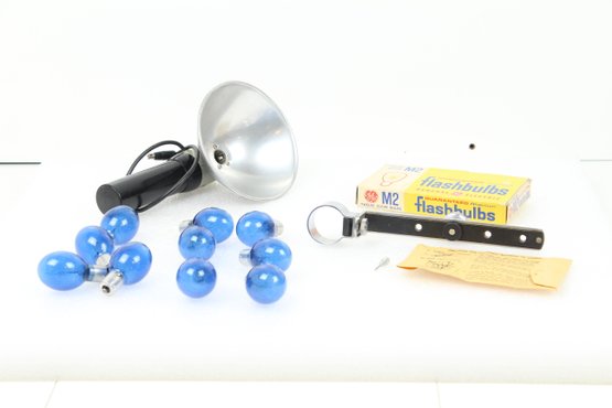 Comes with Movielite bracket with instructions, 10 large blue flash bulbs, 1 box of 12 clear small flash bulbs(GE M2) and one pin that goes into the camera. Untested.