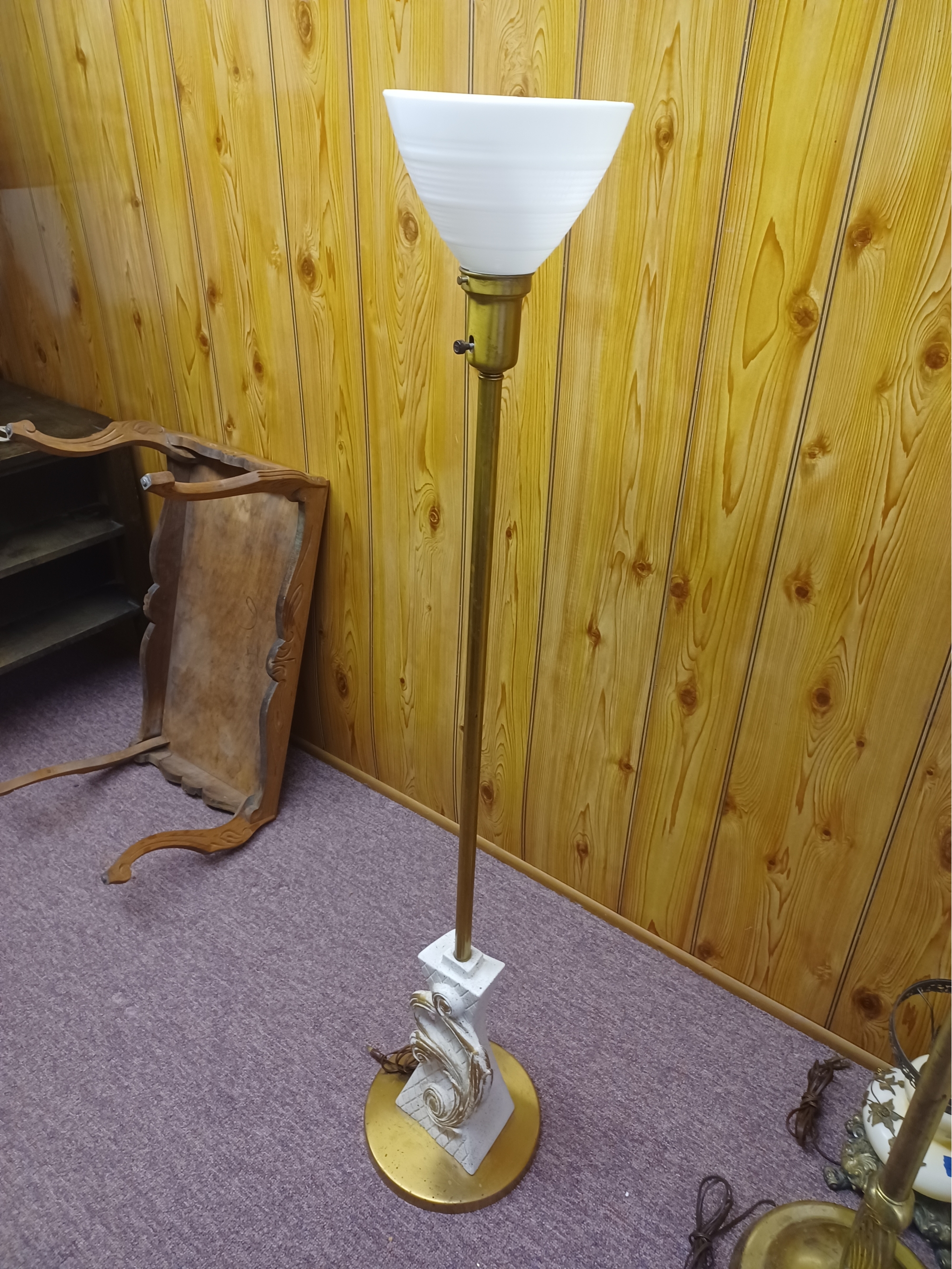 Here we have a pretty sweet mid century floor lamp that is complete and actually works. No need to get your lamp fixing skills on point because it works just fine. Ready to provide extra light for your dark corner and extra awesomeness for your home decor. 56 inches high and 11 inches for the base.