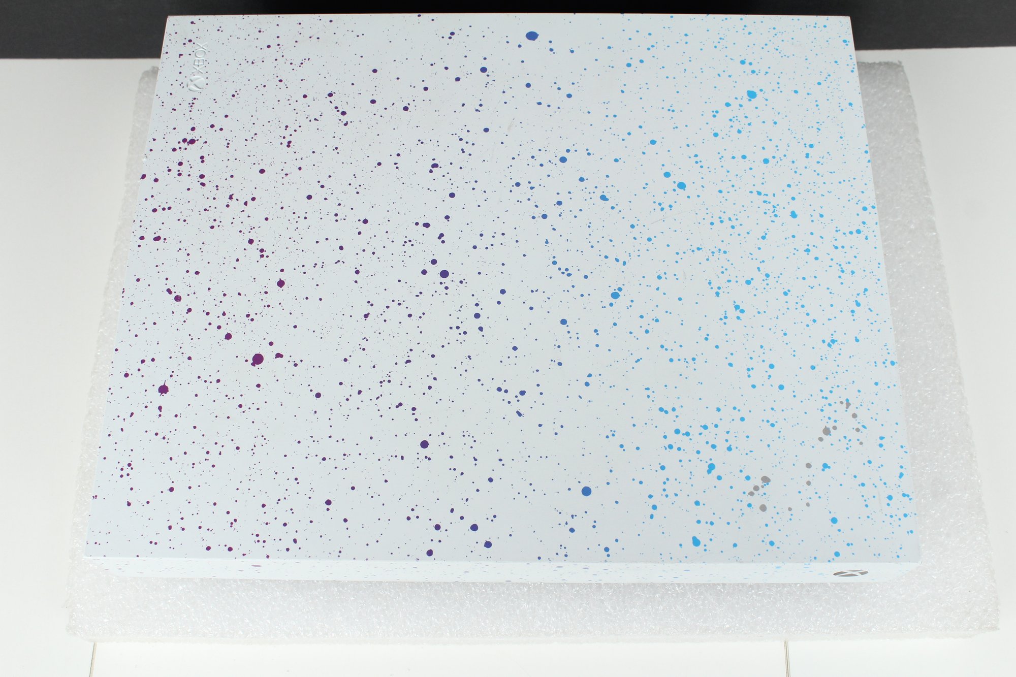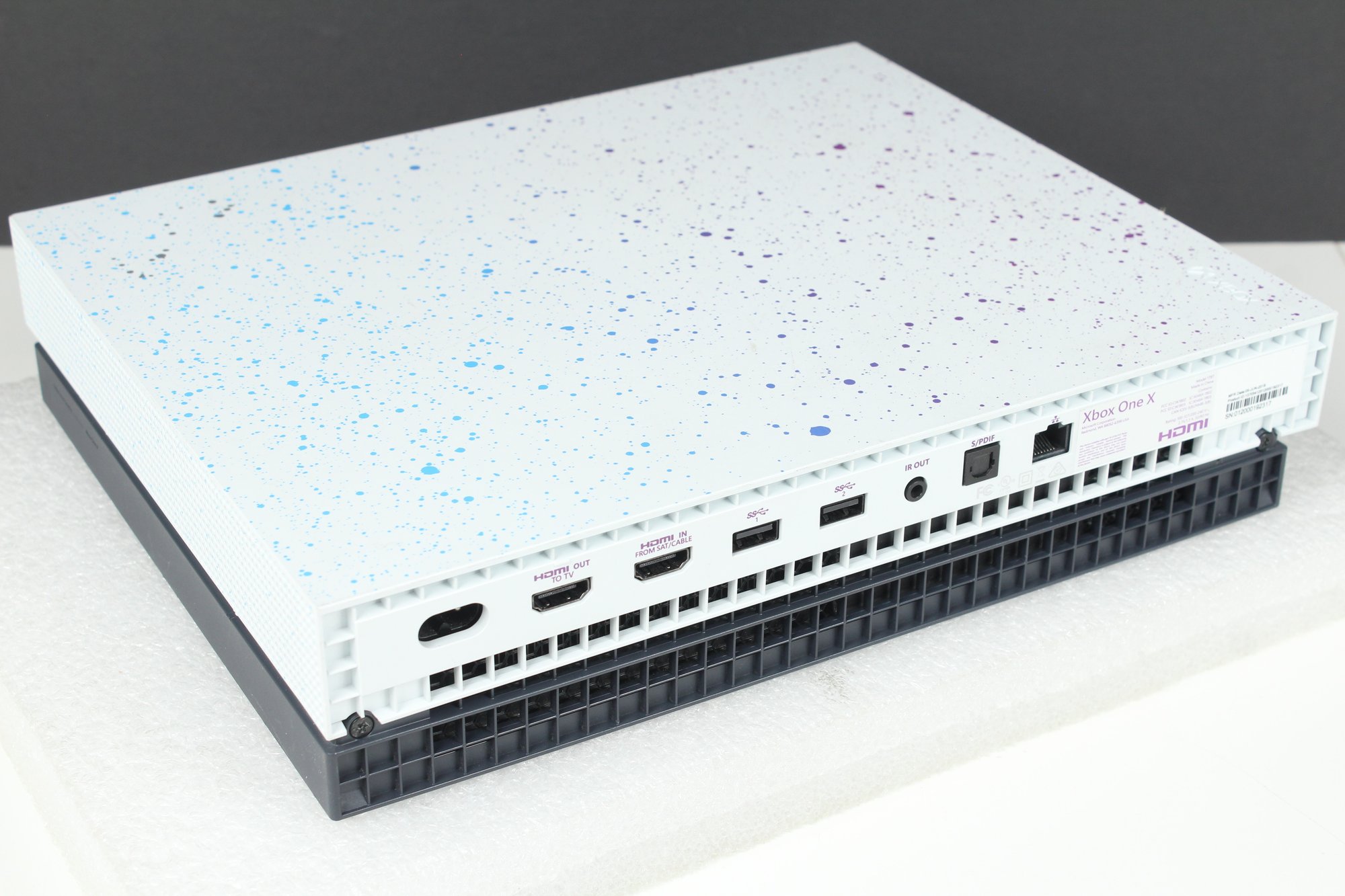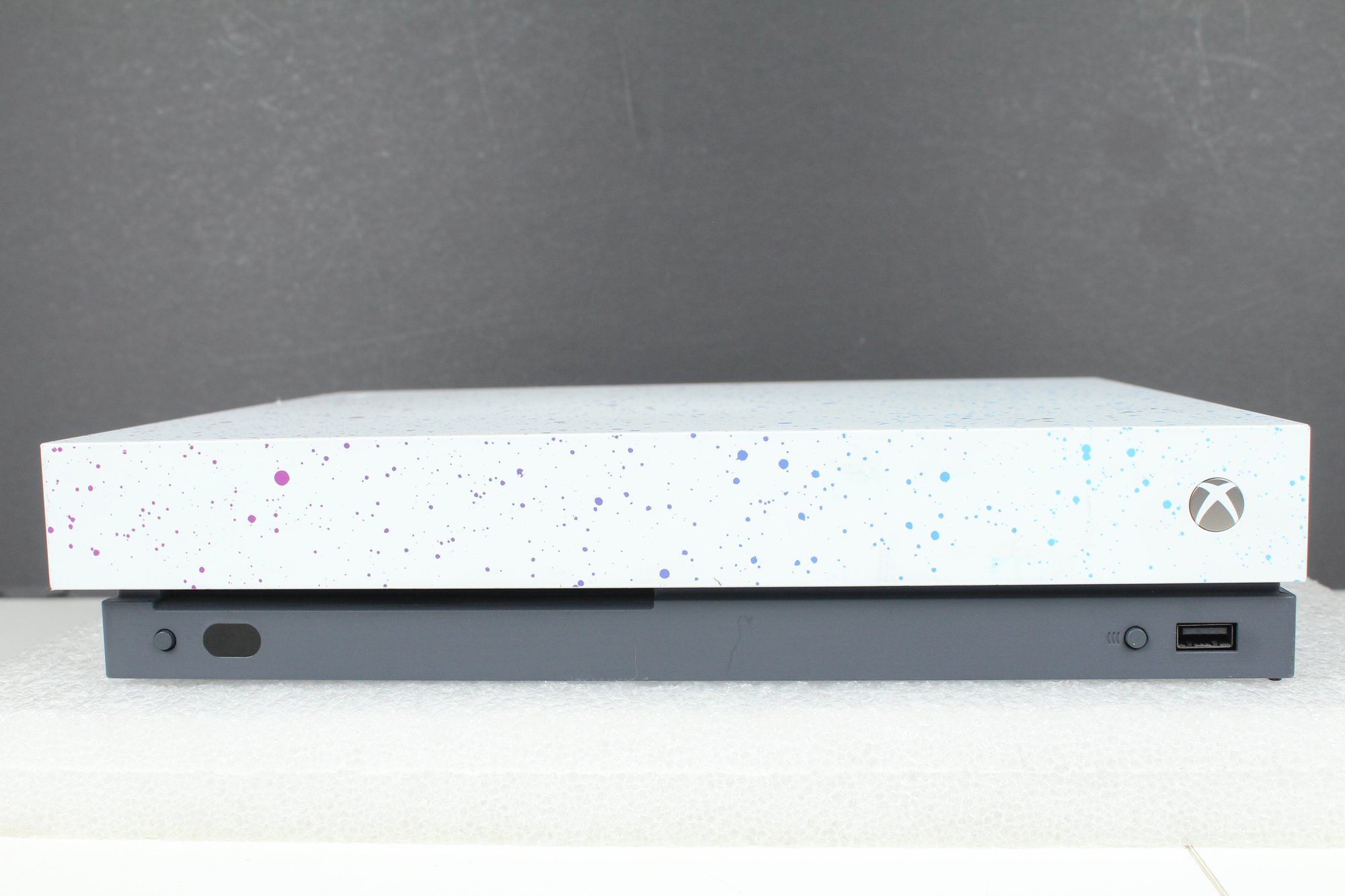 This is a Xbox One - Model 1787 from 2019. This is the Hyperspace Special Edition with a Blue, Purple and Silver paint splatter pattern. Good cosmetic condition with some minor dings on edge and corner. Console is tested and working, connects to controllers. Hard drive has been removed after testing. Does not include cords, cables or any other accessories