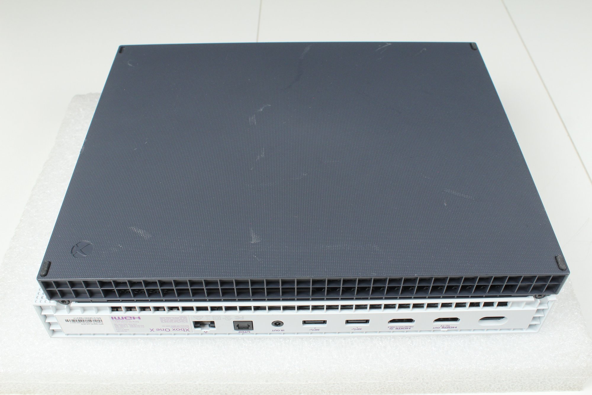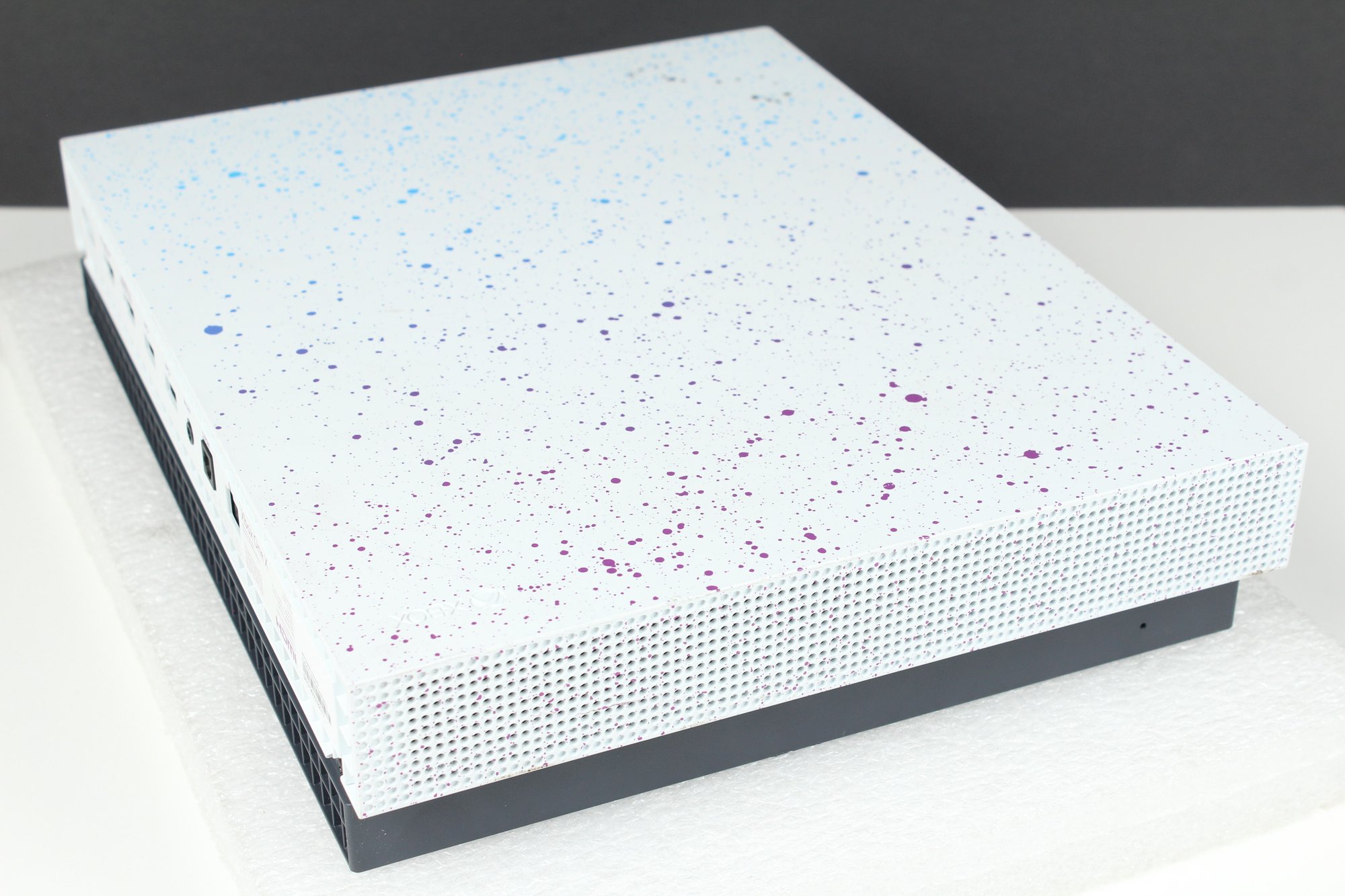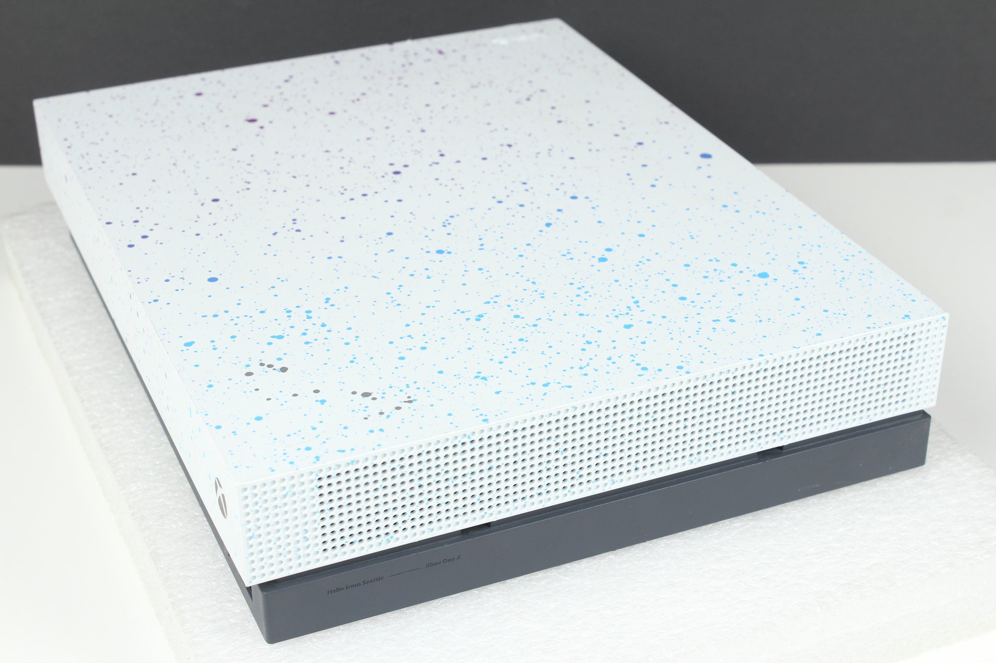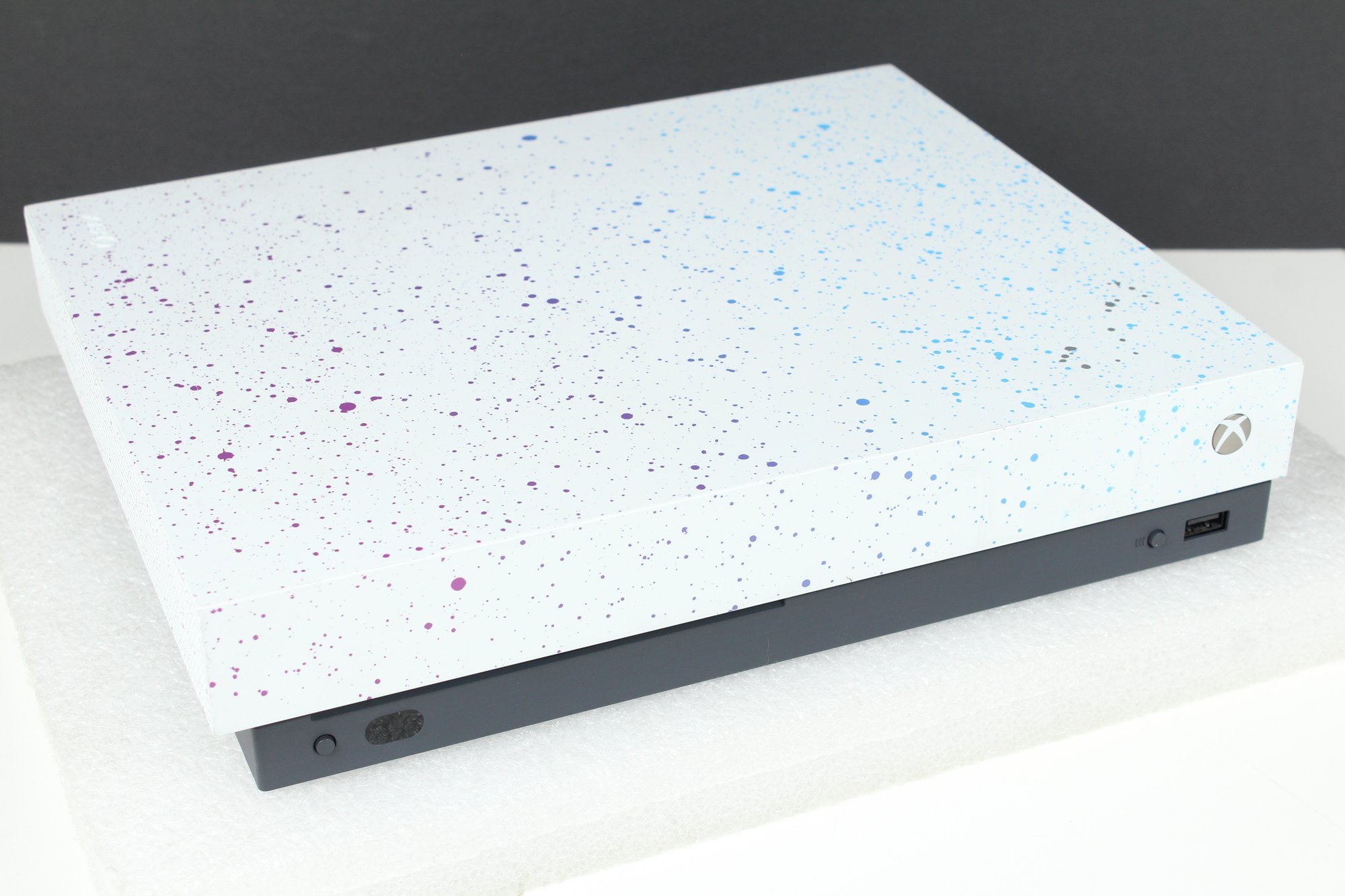 This is a Xbox One - Model 1787 from 2019. This is the Hyperspace Special Edition with a Blue, Purple and Silver paint splatter pattern. Good cosmetic condition with some minor dings on edge and corner. Console is tested and working, connects to controllers. Hard drive has been removed after testing. Does not include cords, cables or any other accessories