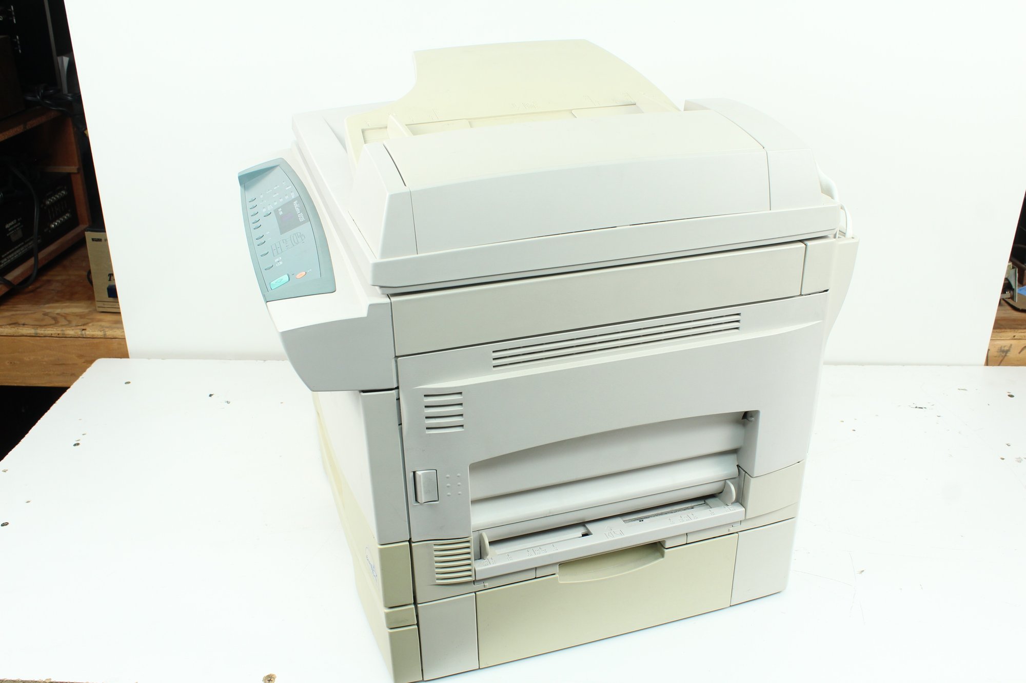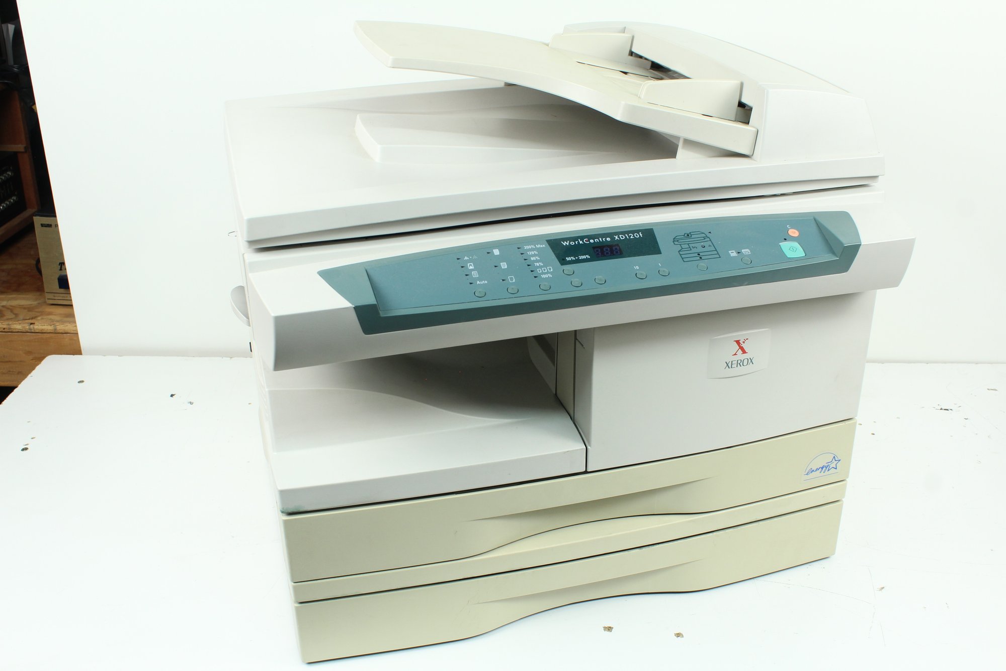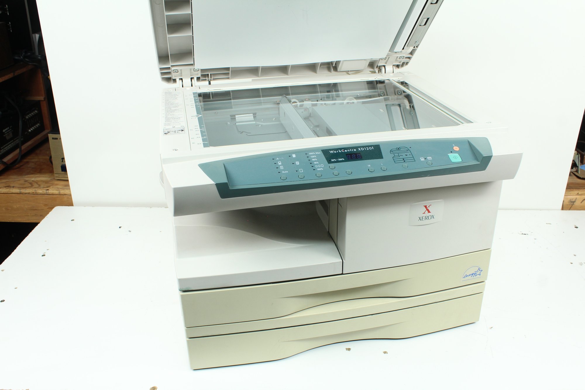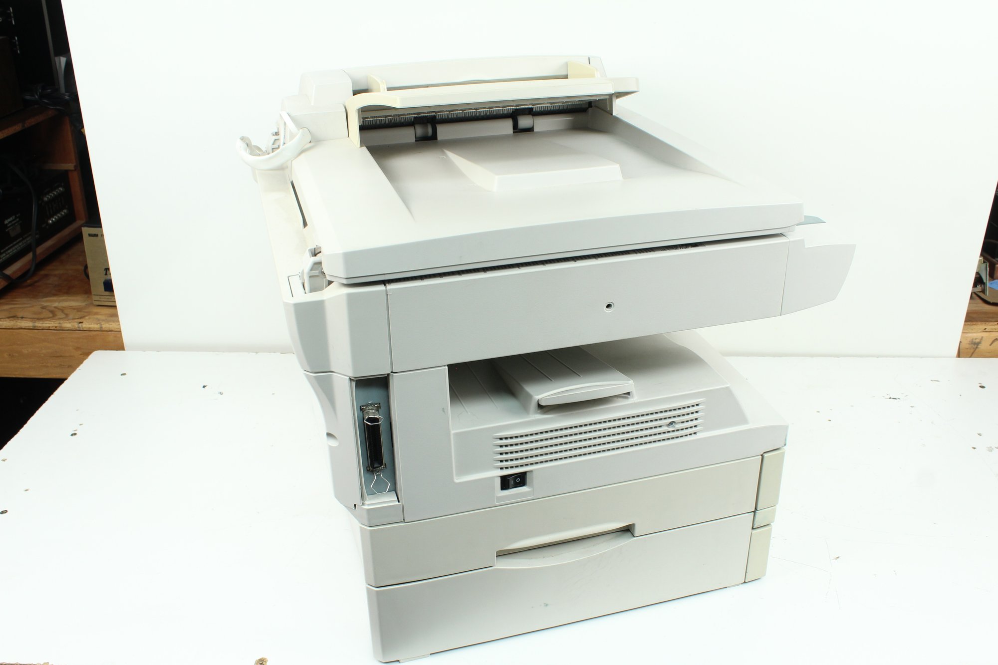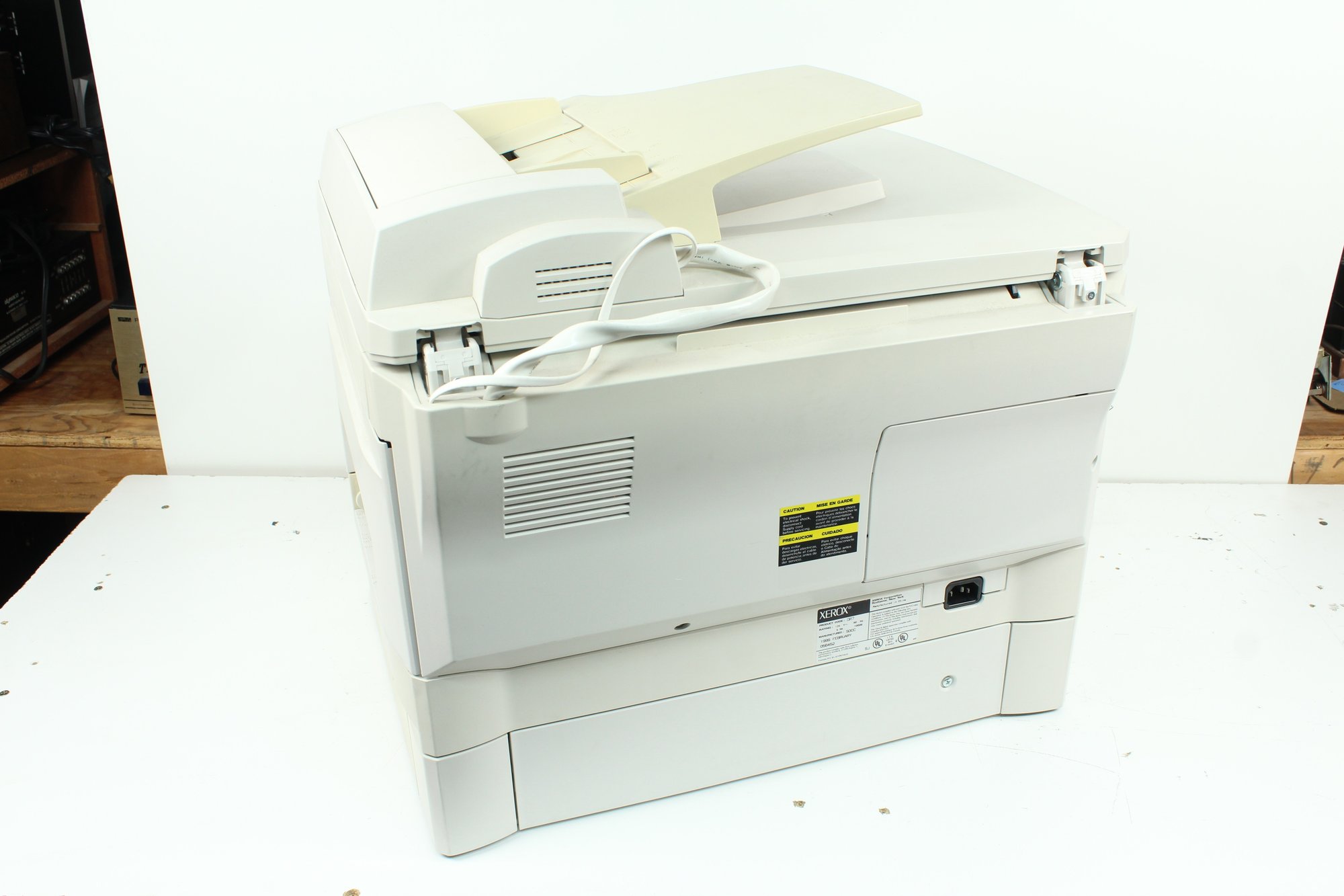 Copier does work and copies from the flatbed using the side manual feed tray. Paper trays do not work and document feeder does not work. No power cord but it's the common IEC cord that everything uses. Measures roughly 20 inches wide, 19 inches deep and 19 inches high.