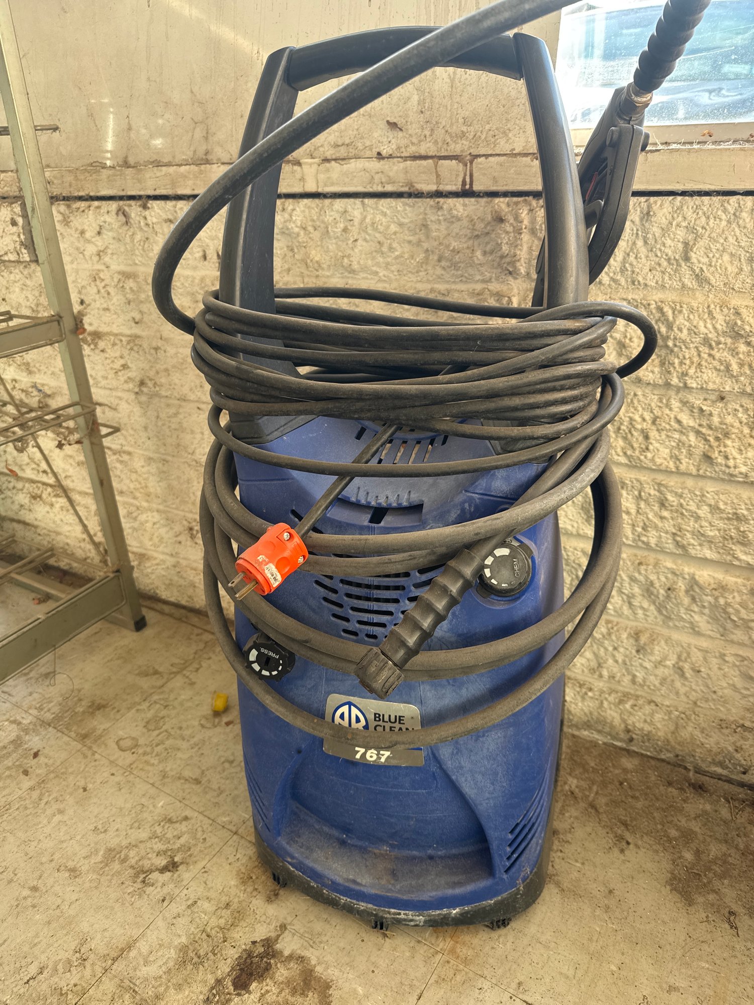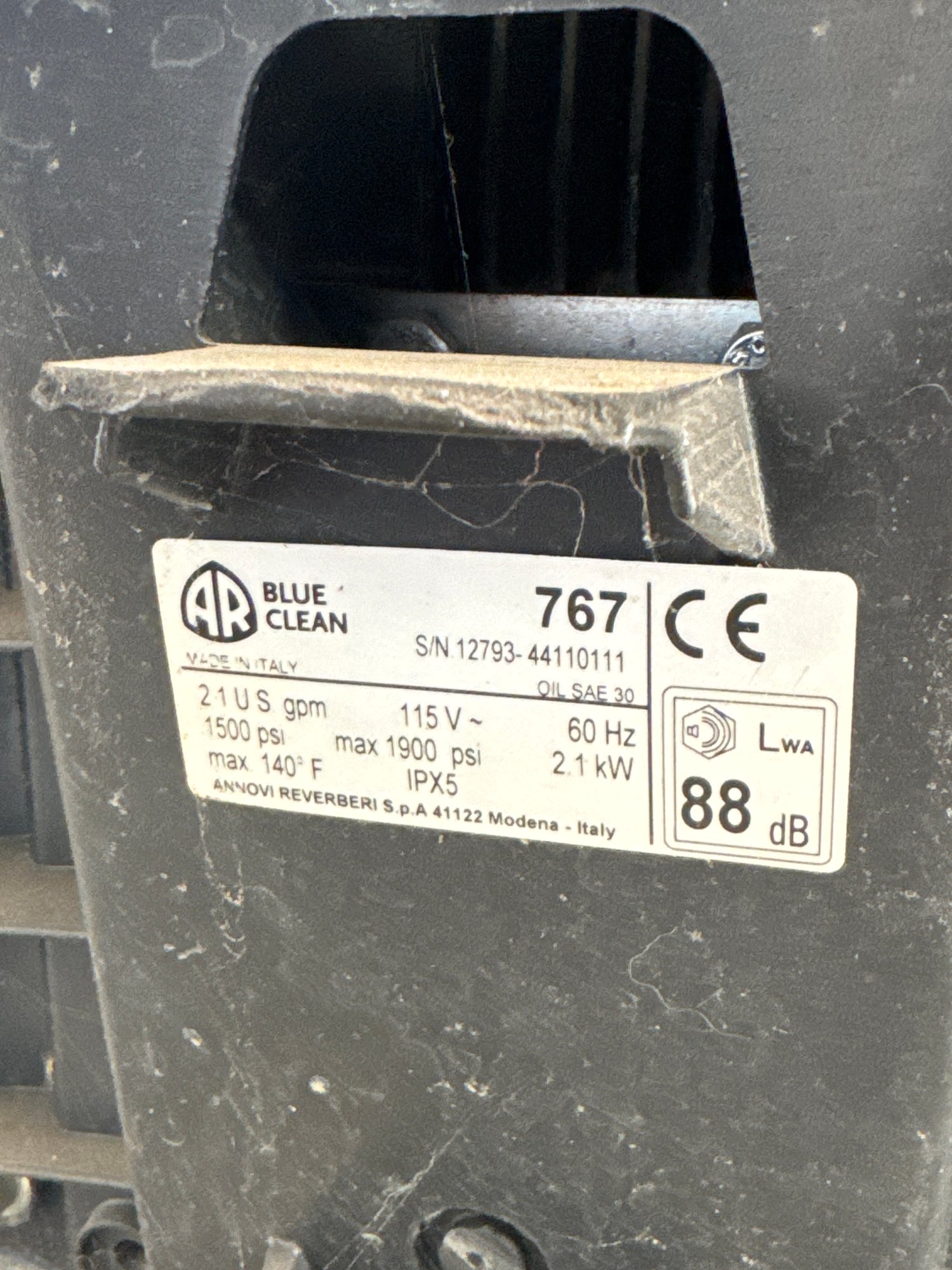 A powerful and compact AR Blue Clean 767 electric pressure washer, made in Italy. Featuring a maximum pressure of 1900 PSI and a flow rate of 2.1 gallons per minute, this pressure washer is perfect for tackling tough cleaning tasks around the home or workspace. With a durable design, it handles temperatures up to 140°F and is equipped with an efficient 2.1 kW motor.