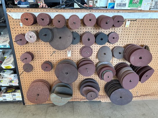 Large collection of assorted grinding and sanding discs in various sizes and grits. Suitable for metalworking, woodworking, and other finishing applications. Sold as a single lot.