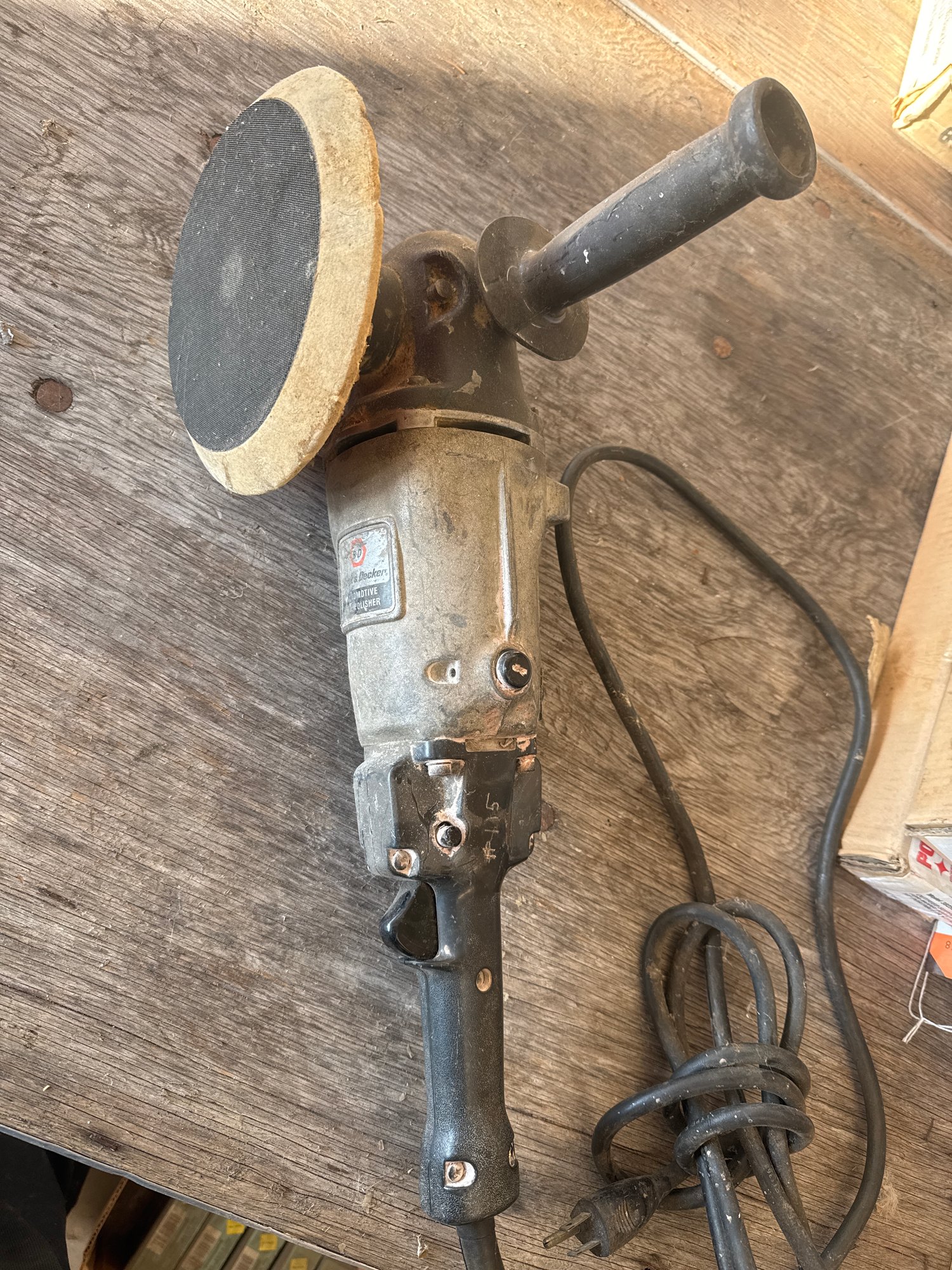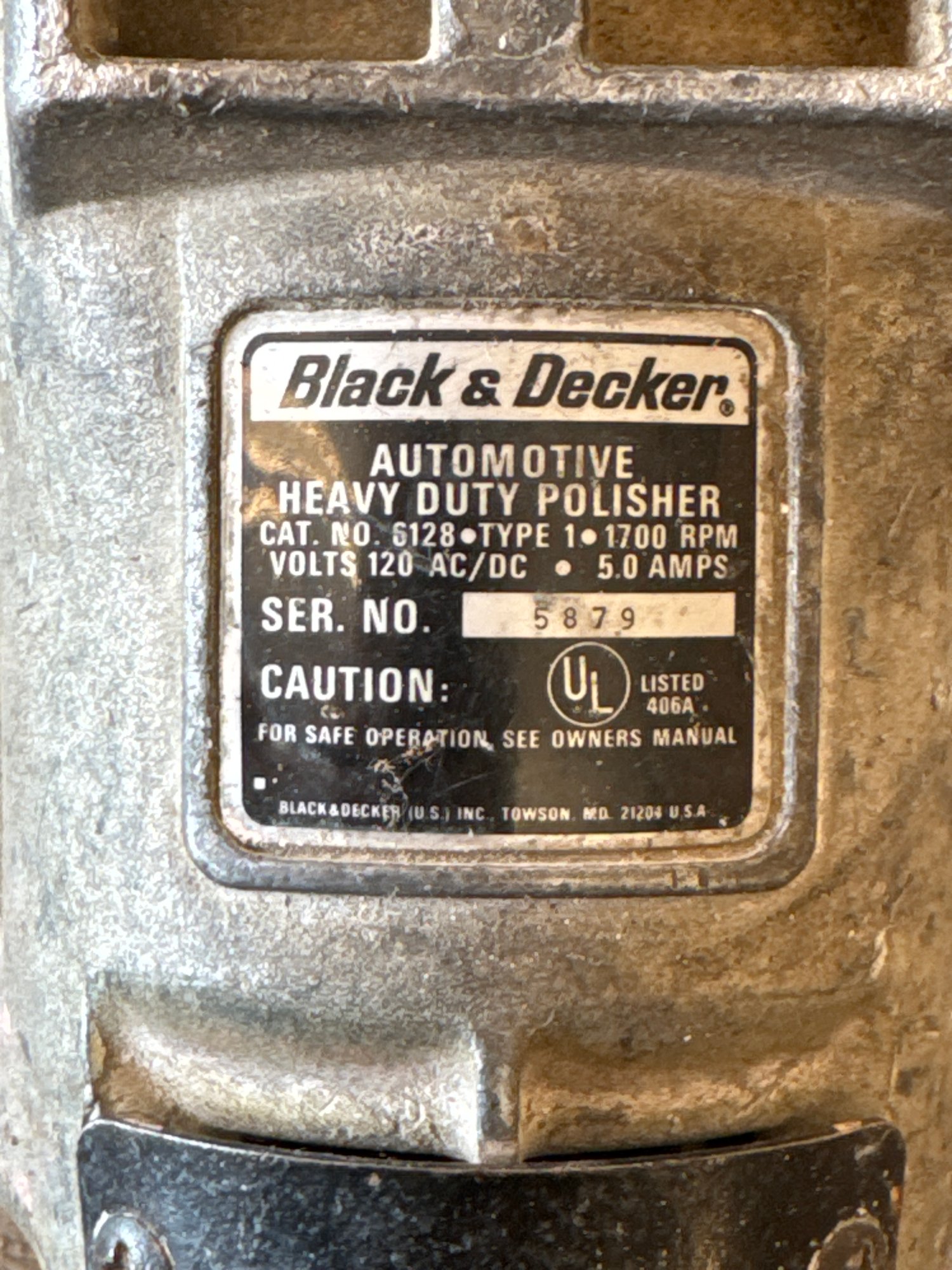 This Black & Decker 5128 heavy-duty automotive polisher features a 5.0-amp motor and a 1,700 RPM speed, making it ideal for professional automotive detailing and polishing. Built with a rugged metal body and ergonomic handle, it is designed for durability and long-term use. The tool shows visible signs of wear and age, including scratches and scuffs, but is functional and ready for a variety of polishing tasks.