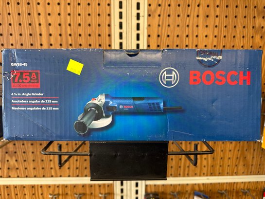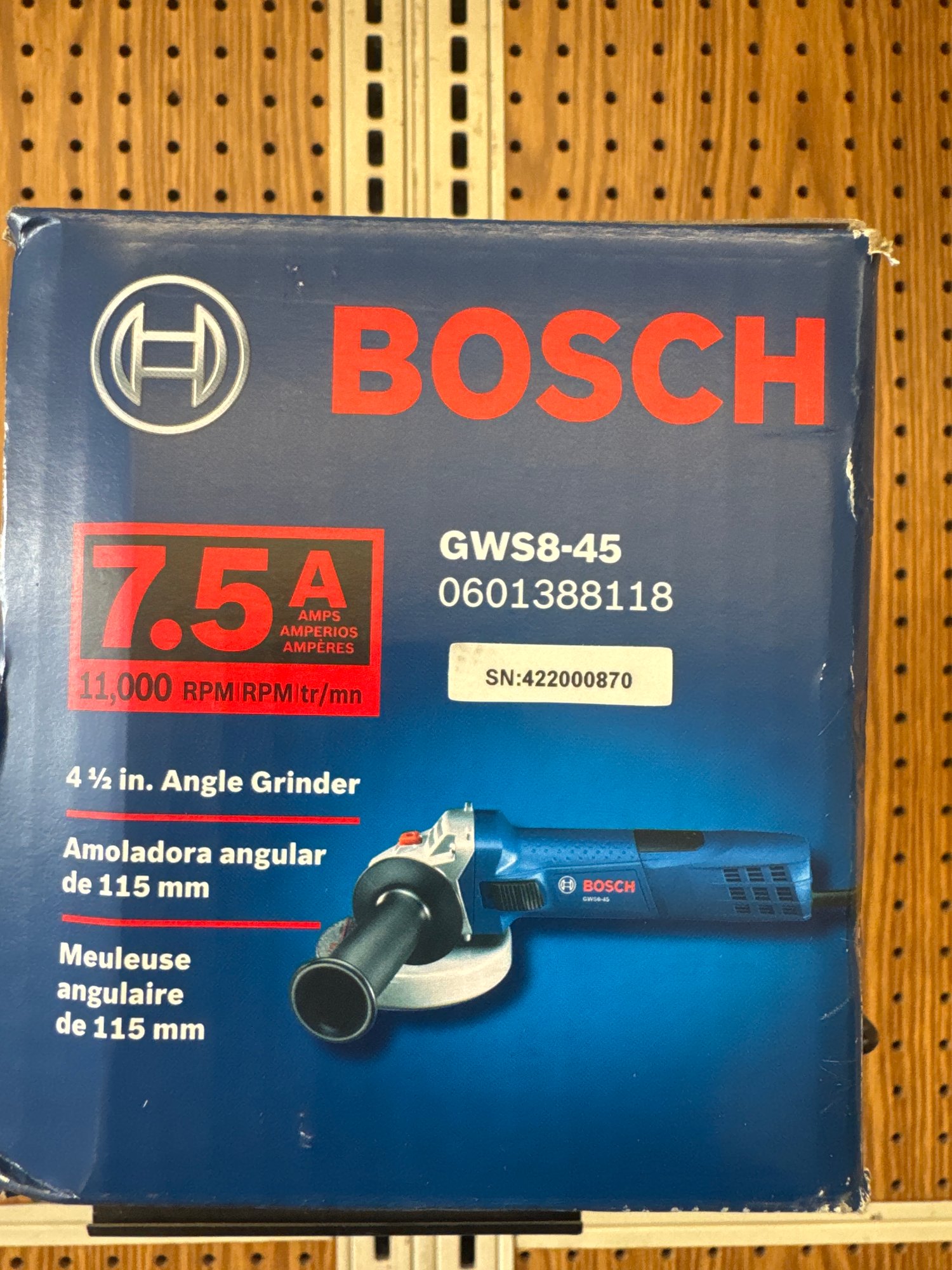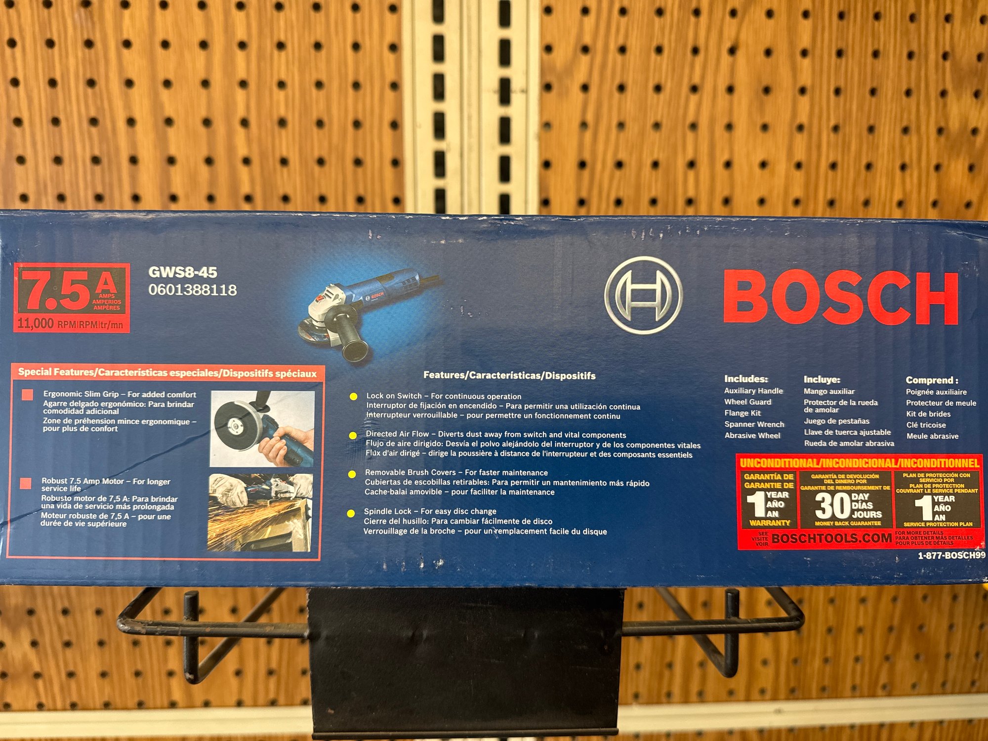 Bosch GWS8-45 4½-Inch Angle Grinder, featuring a 7.5-amp motor delivering 11,000 RPM for demanding projects. Ergonomic design for improved comfort and control. Includes a robust construction ensuring long-lasting performance.