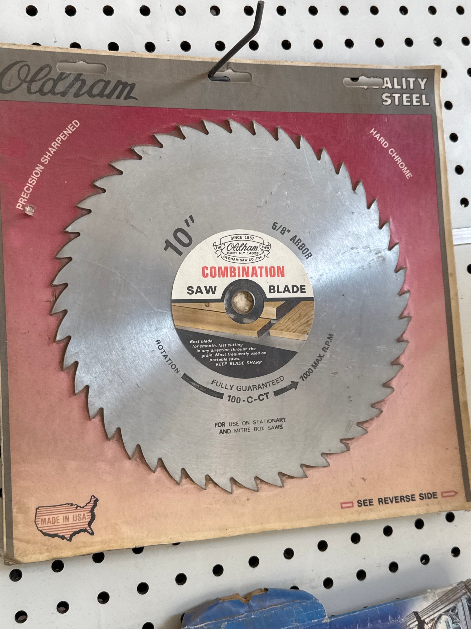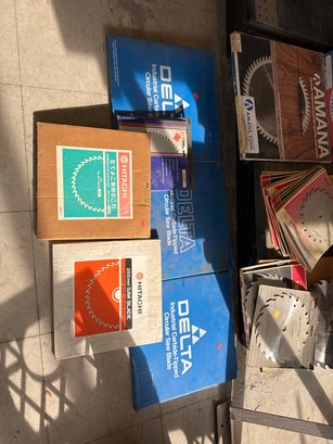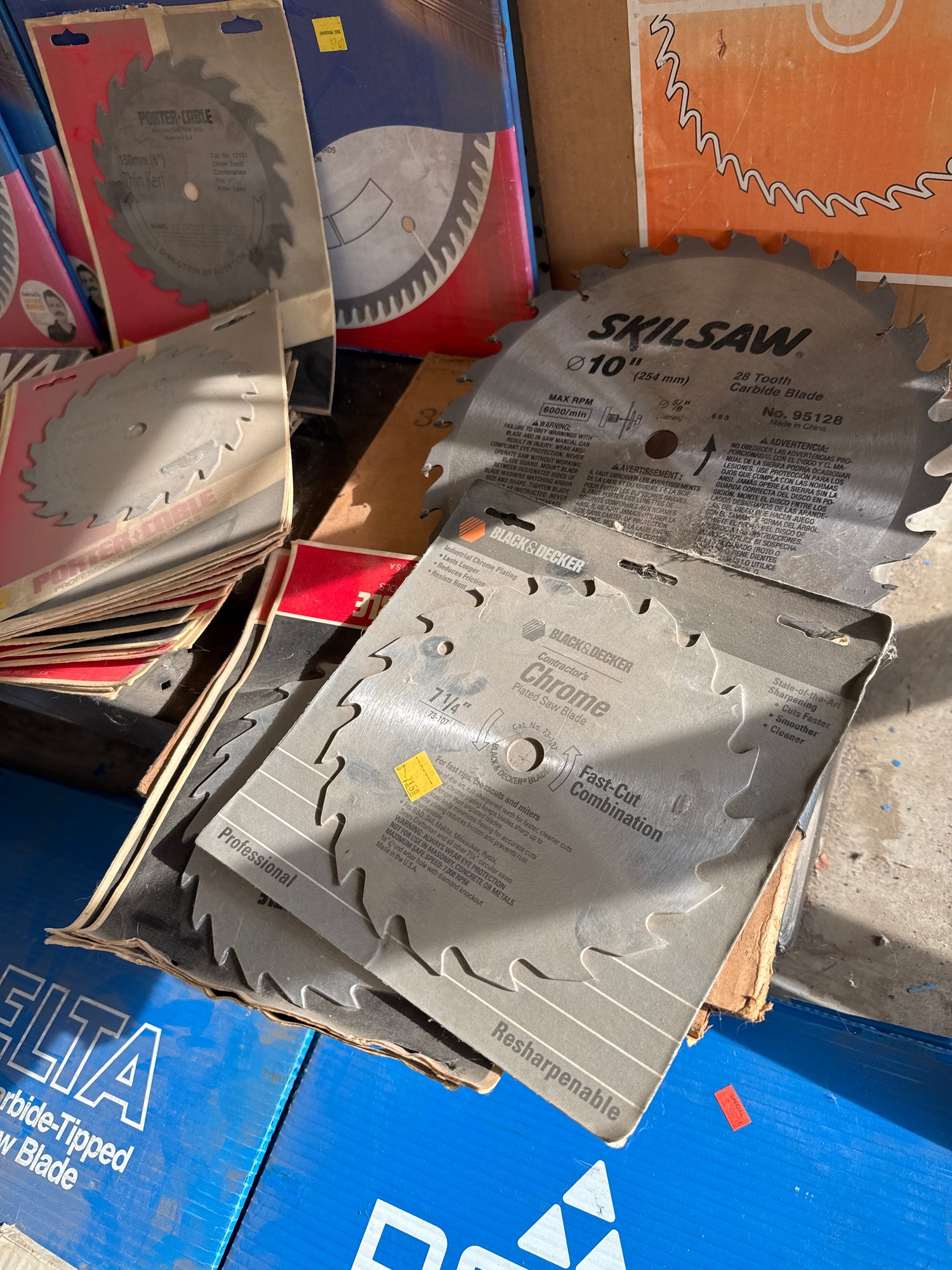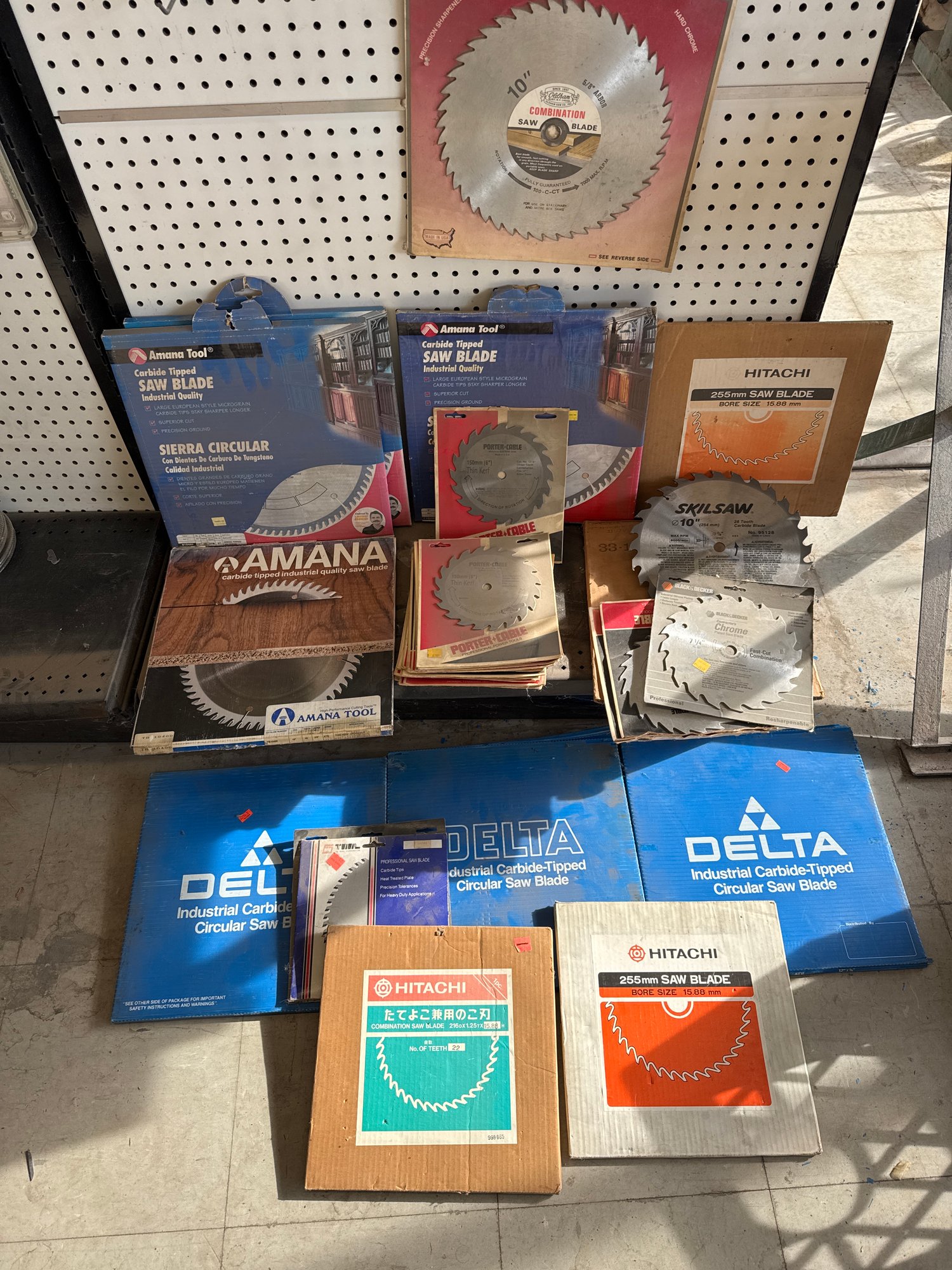 collection of circular saw blades from top brands including Amana Tool, Hitachi, Delta, Porter-Cable, and Oldham. The set includes both new and used blades with a variety of specifications, such as carbide-tipped and chrome-coated blades, ensuring optimal performance for professional and DIY projects. Perfect for woodworking, construction, or workshop needs, this collection offers premium quality and durability. Includes multiple sizes, including 10-inch and 255mm blades, and various tooth configurations.