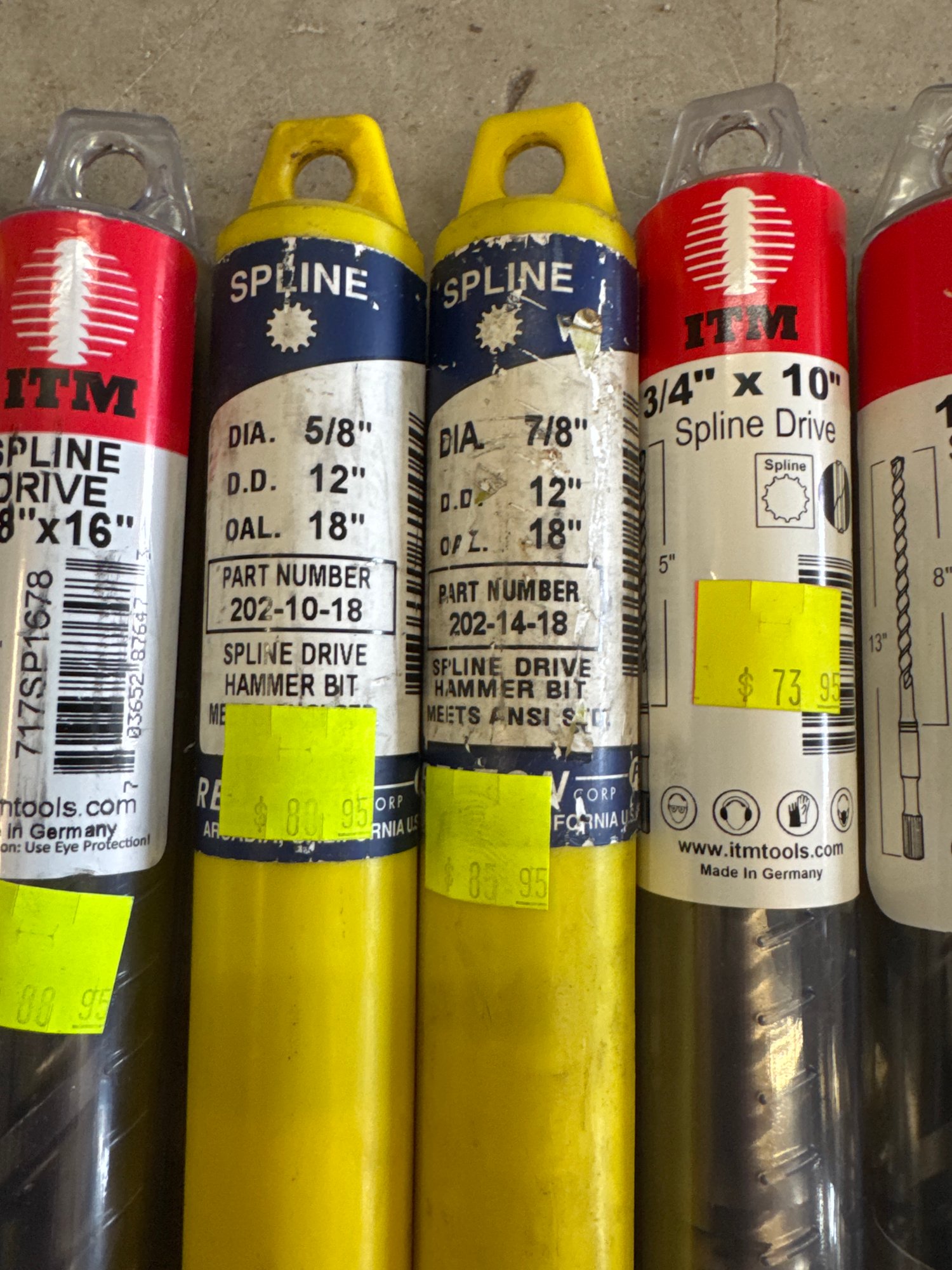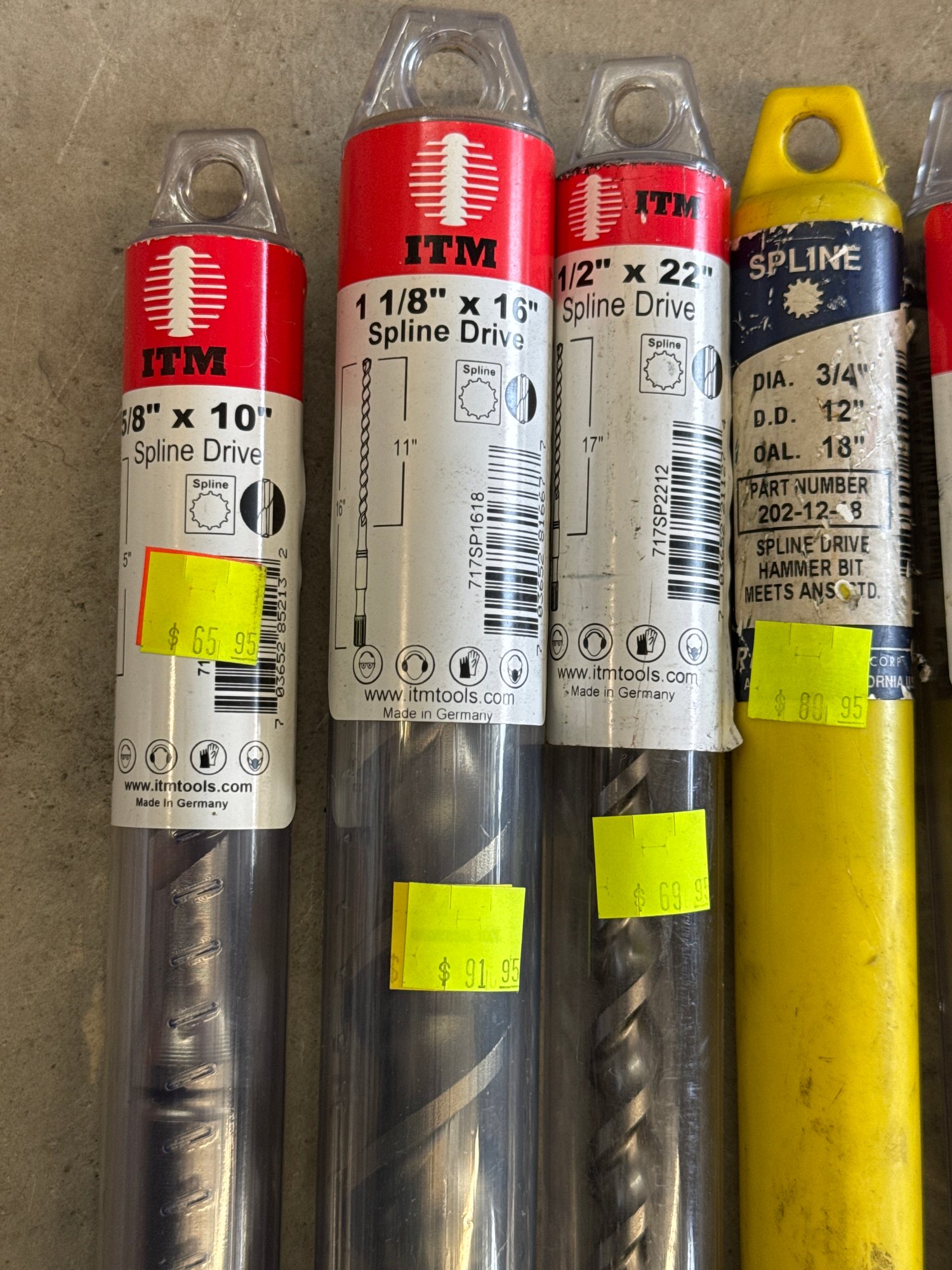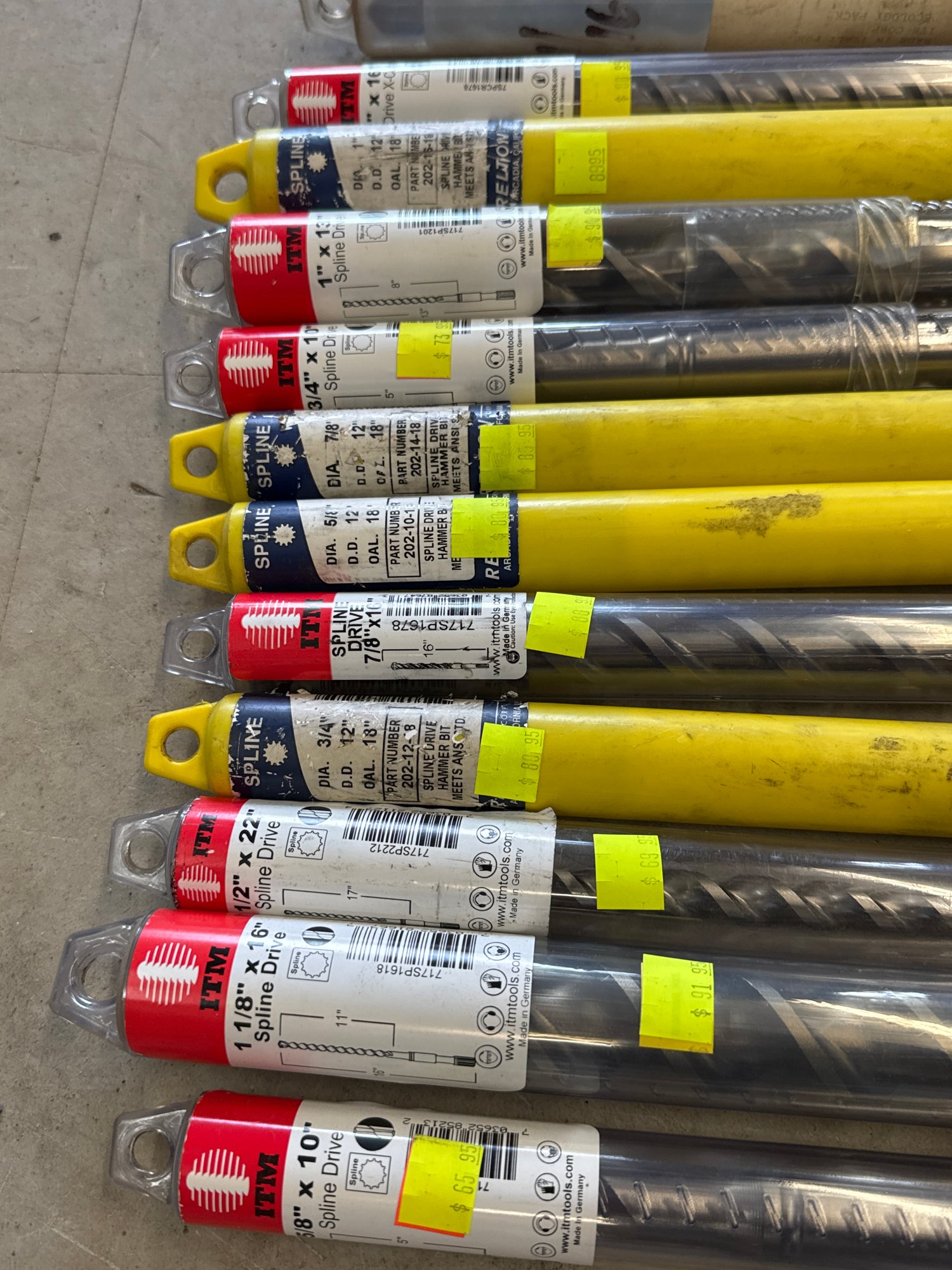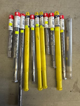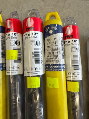 Assorted high-quality ITM and Spline Drive hammer drill bits, including various sizes and lengths. Ideal for masonry and construction applications, this lot features drill bits made in Germany and the USA. Includes unused and packaged items, with visible original price tags, ensuring excellent value for heavy-duty jobs.