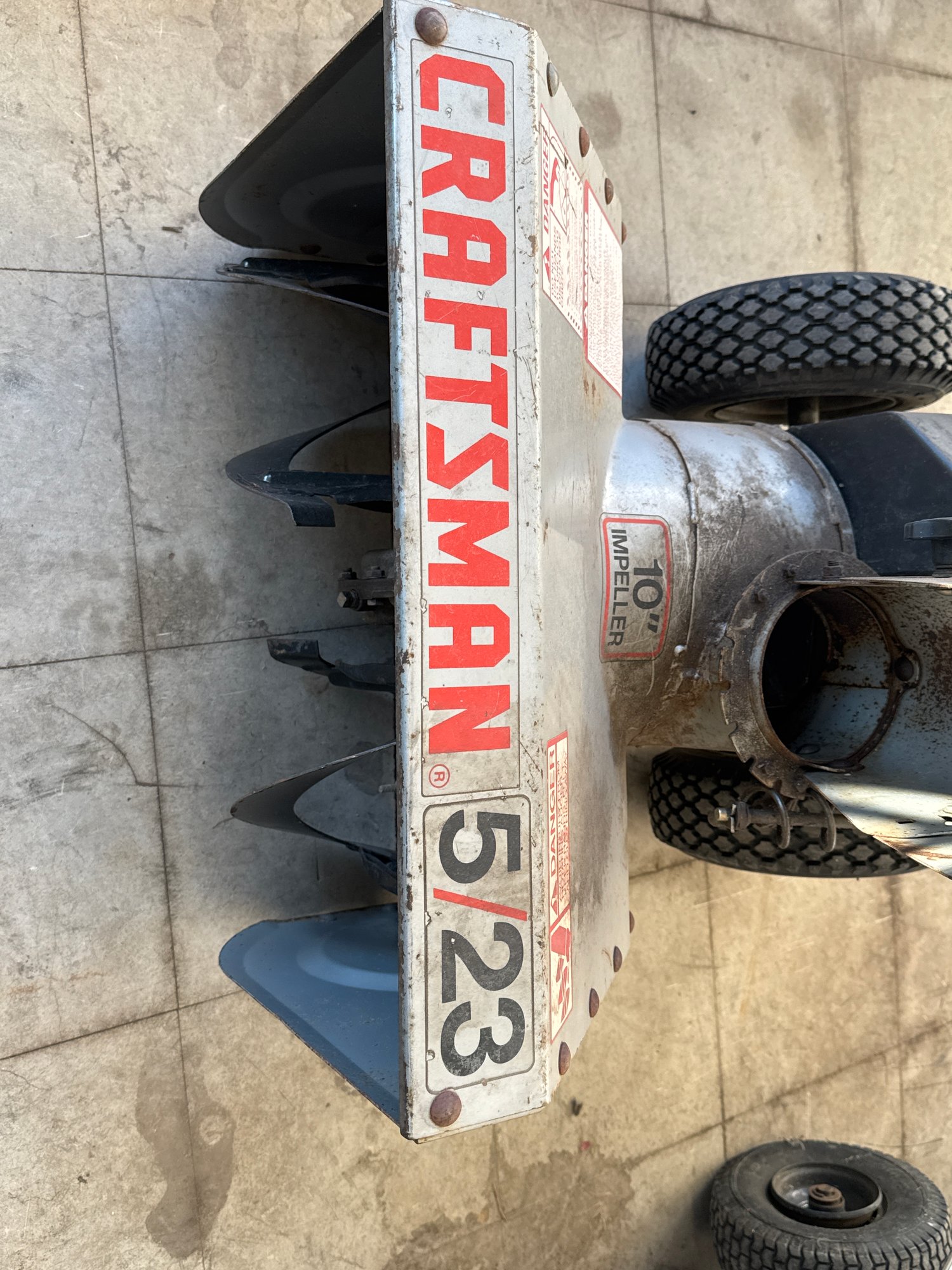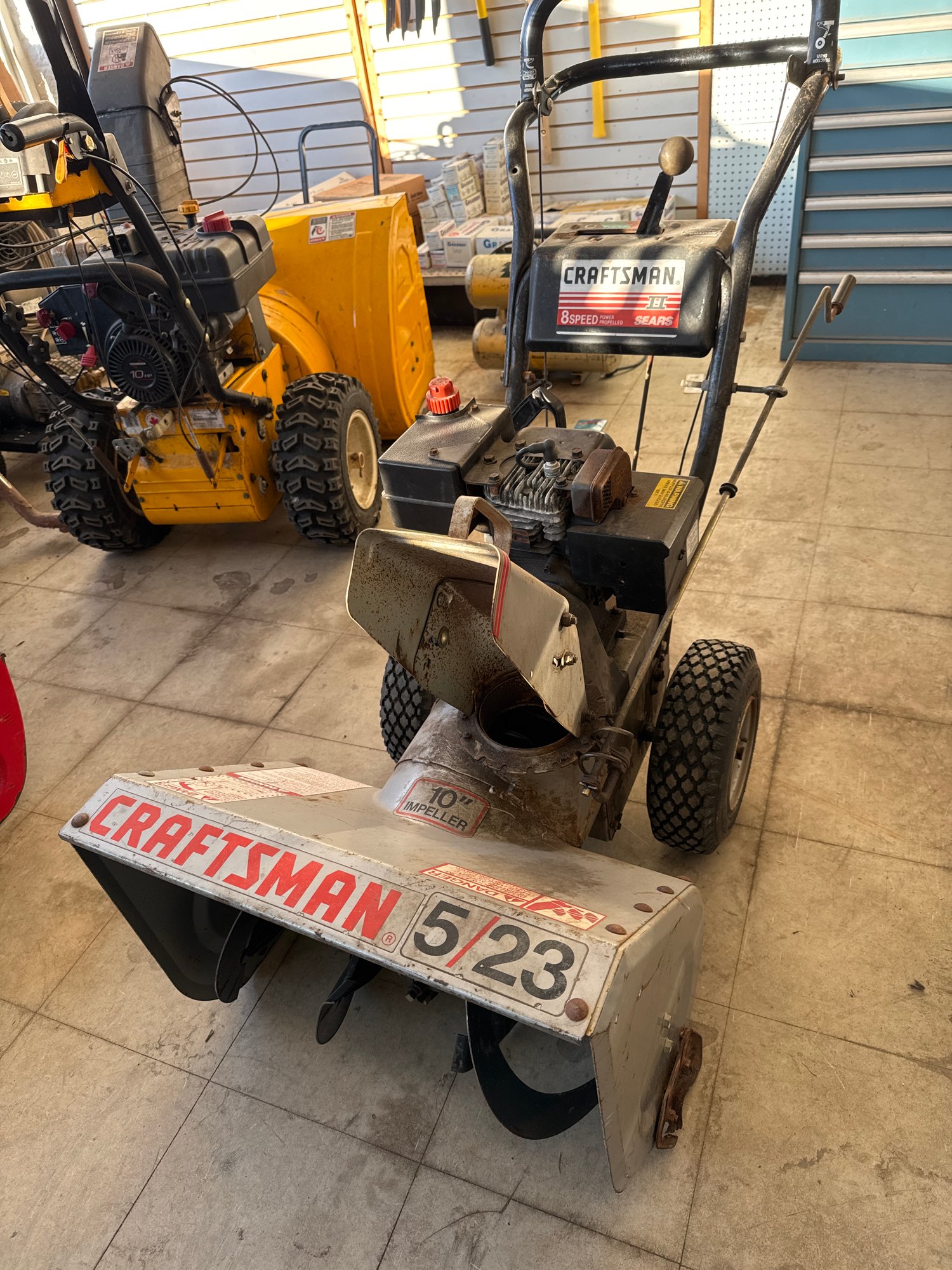 Craftsman II snowblower with an 8-speed power-propelled system, featuring a 5HP engine and a 23-inch clearing width. Equipped with a 10-inch impeller for efficient snow removal. Manufactured by Sears, this robust machine is ideal for clearing driveways and walkways in harsh winter conditions.