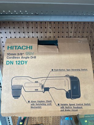 Hitachi 12V Cordless Angle Drill, model DN 12DY, designed for precision and versatility in tight spaces. The 10mm (3/8") chuck makes it perfect for detailed drilling and fastening tasks, while the cordless design offers maximum mobility and convenience. Comes in its original packaging