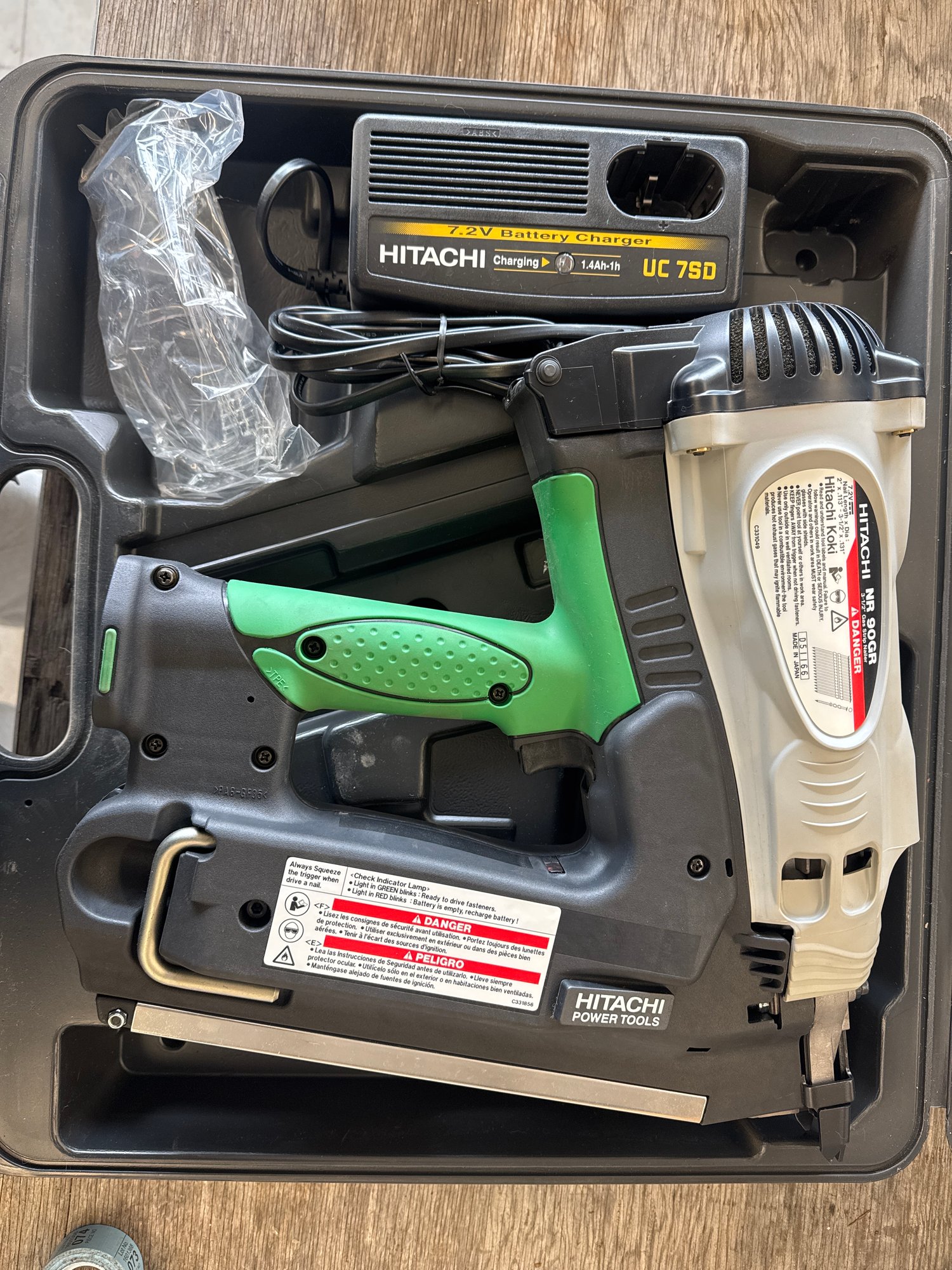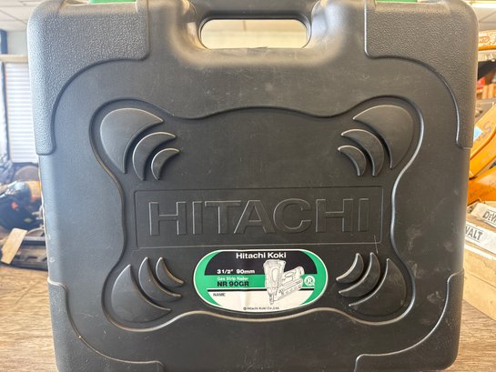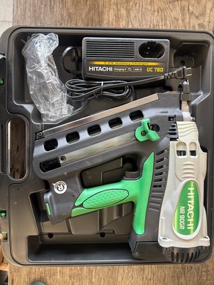 This Hitachi NR90GR gas-powered framing nailer offers unmatched portability and performance for framing projects. It includes the 7.2V battery charger and operates with gas cartridges, delivering efficient nailing without cords or compressors. The set is in working condition and stored in a durable carrying case. Ideal for construction and renovation work.