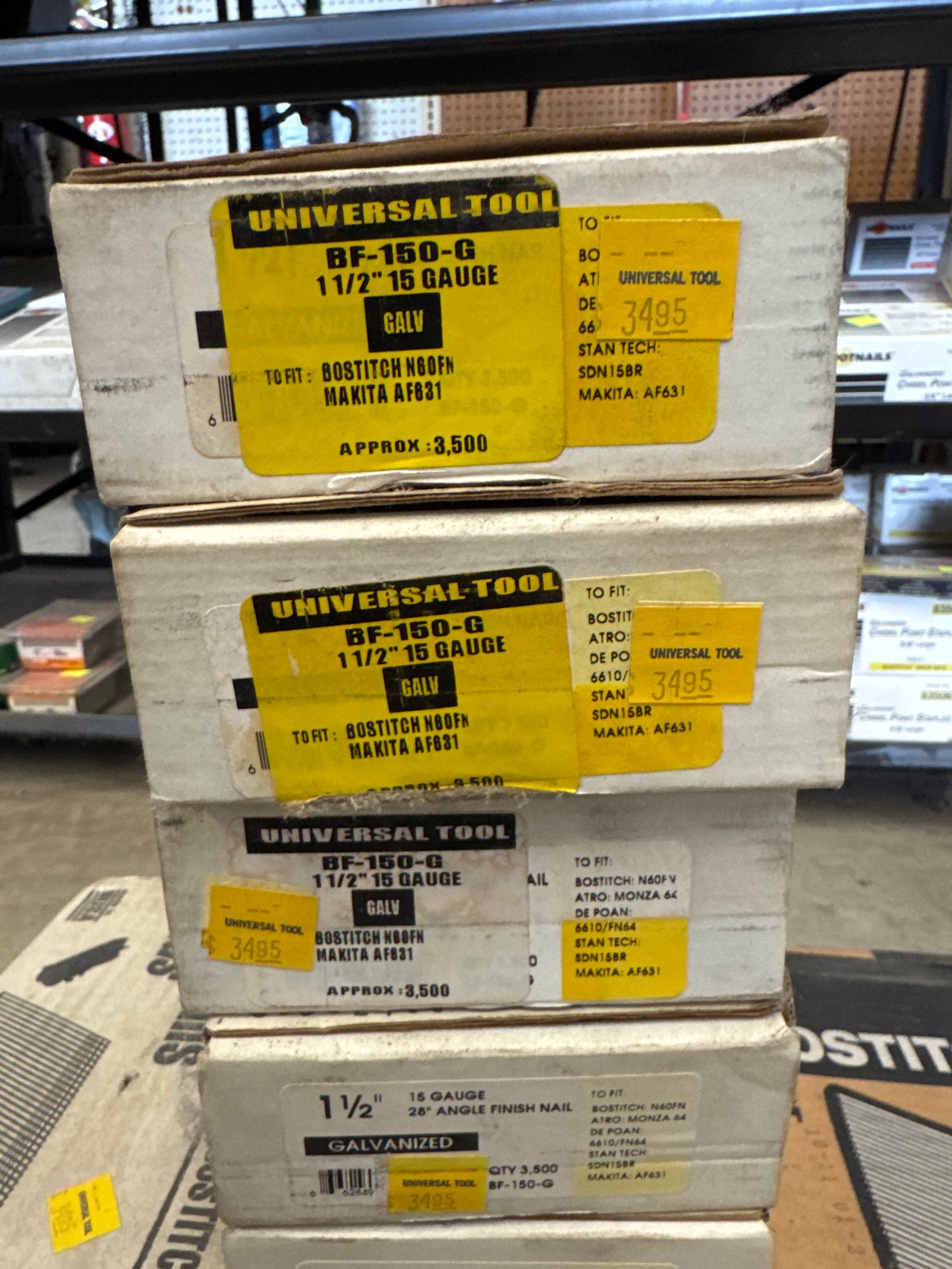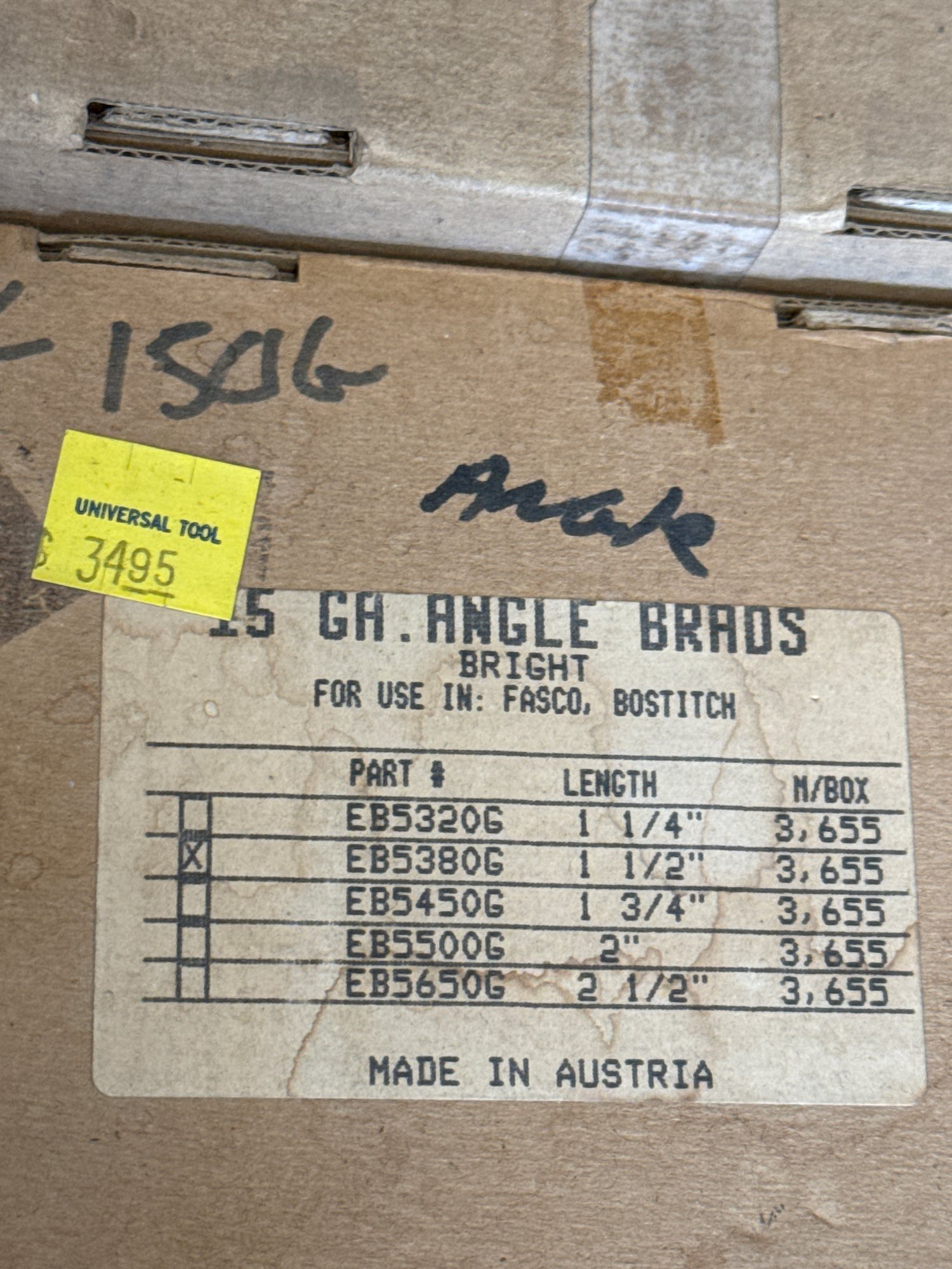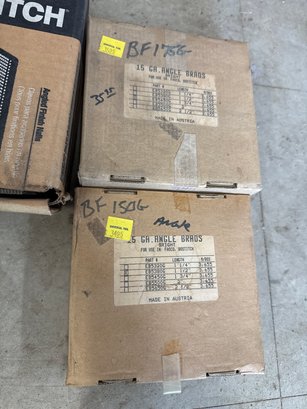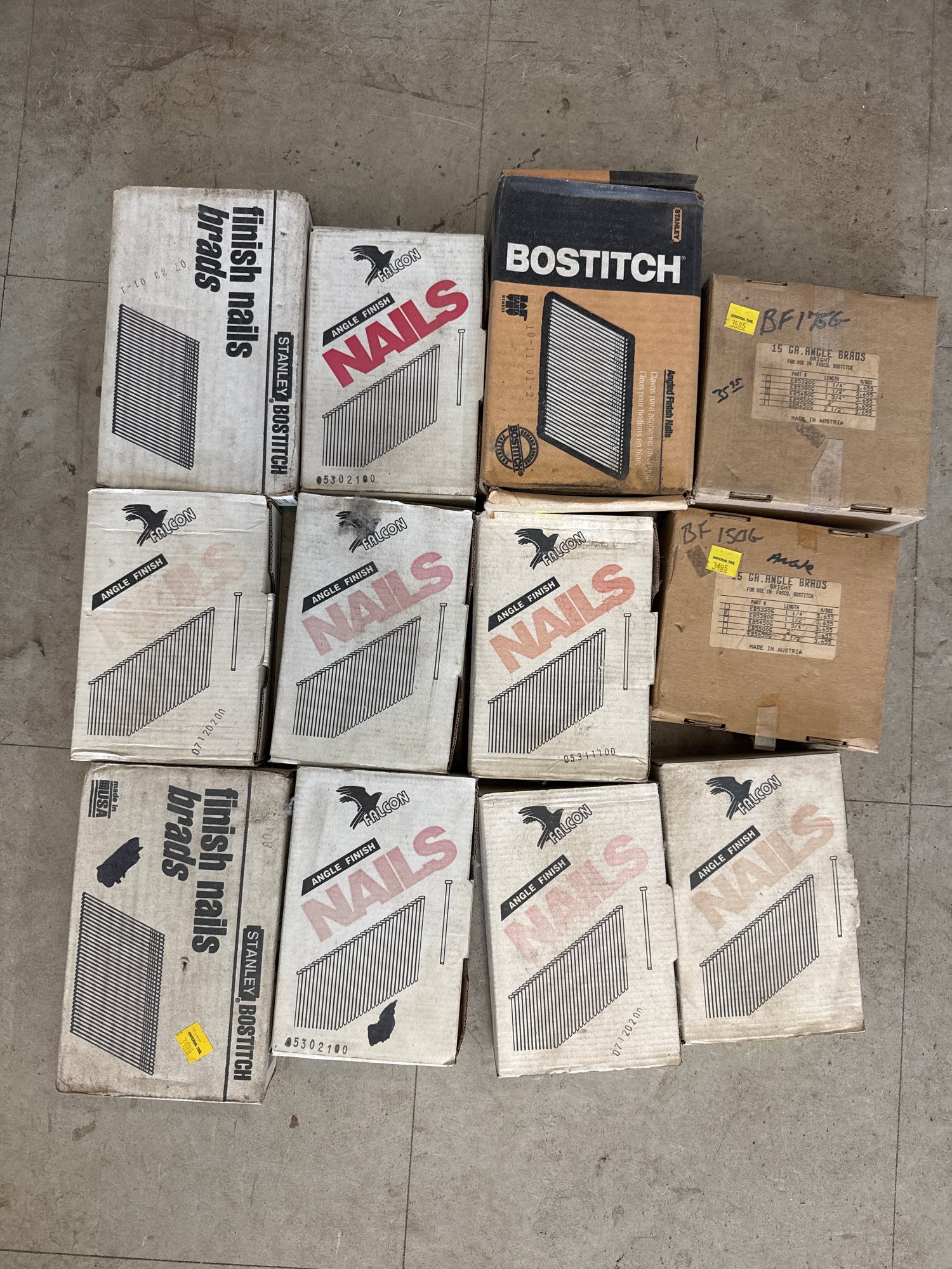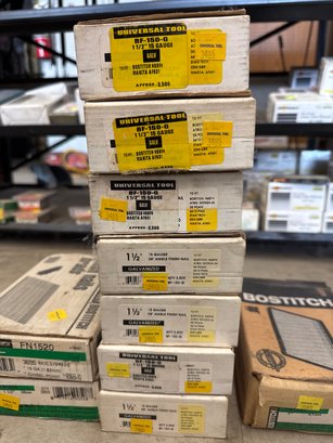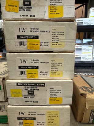 This auction lot features a comprehensive selection of finish nails and brads, ideal for a variety of woodworking and construction projects. The lot includes a variety of brands such as Bostitch, Universal Tool, and Falcon, with sizes ranging from 1-1/4 inch to 2 inches in length. The nails are primarily 15-gauge angle finish nails, with galvanized and stainless steel options for durability and corrosion resistance. Quantities per box range from 3,500 to 4,000, ensuring an ample supply for professional or DIY needs. This assortment is perfect for finish carpentry, trim work, or cabinet making. All items are in original packaging and appear unused.