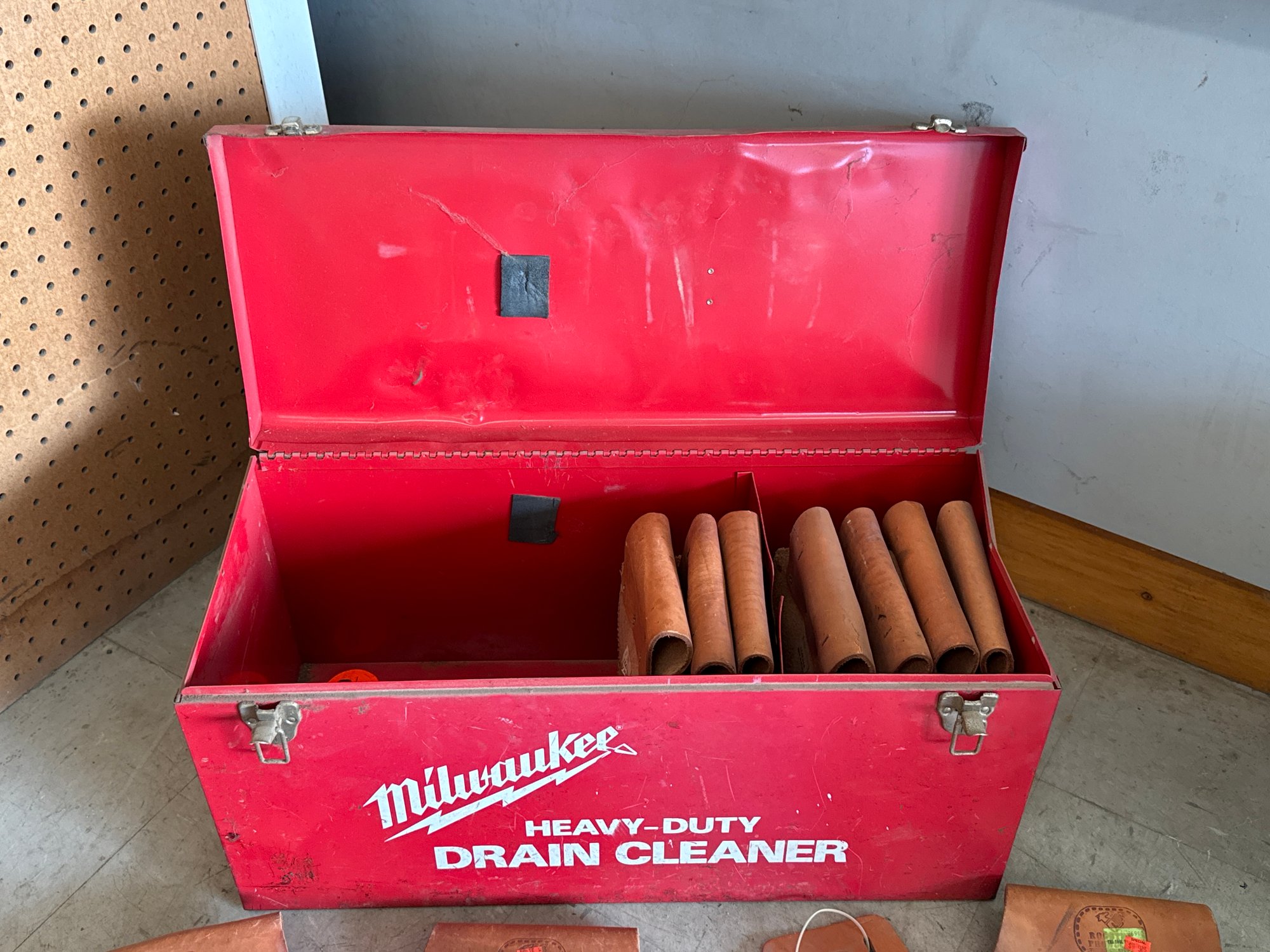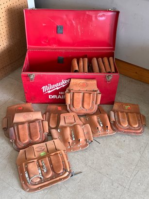 Milwaukee heavy-duty storage box, accompanied by a set of high-quality tool pouches. The red Milwaukee box is ideal for organizing and storing plumbing tools or equipment, while the tool pouches offer multiple compartments for tools and accessories, making them perfect for tradespeople or DIY enthusiasts. The pouches are durable and well-crafted, designed for comfort and efficiency on the job site