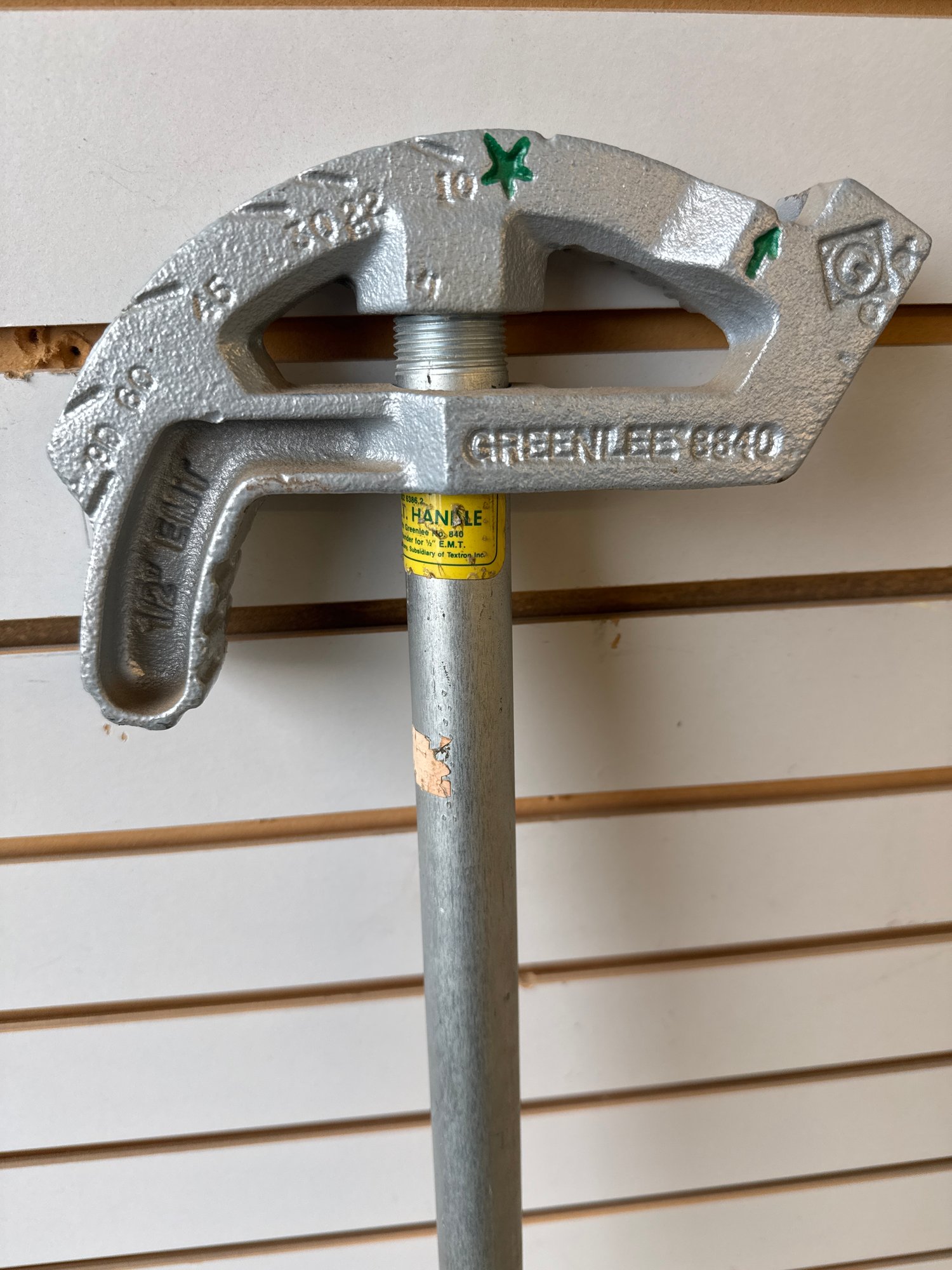 Greenlee Model 840 Conduit Bender, designed for 1/2" EMT pipes. This durable and precise tool ensures smooth bends with consistent angles, featuring clear markings for easy alignment and an ergonomic handle for comfortable use. Ideal for electricians and contractors working on installation and repair projects.