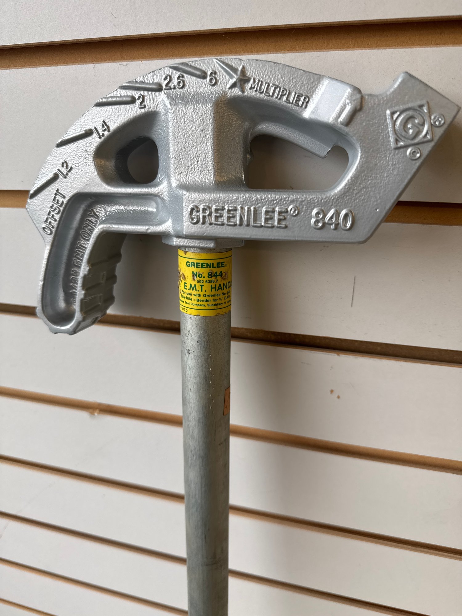 Greenlee Model 840 Conduit Bender, designed for 1/2" EMT pipes. This durable and precise tool ensures smooth bends with consistent angles, featuring clear markings for easy alignment and an ergonomic handle for comfortable use. Ideal for electricians and contractors working on installation and repair projects.