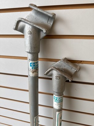 Two Greenlee conduit benders with handles, designed for bending 1/2" and 3/4" EMT conduit. Made from durable cast aluminum for precise bends and long-lasting performance. Perfect for electricians and construction professionals