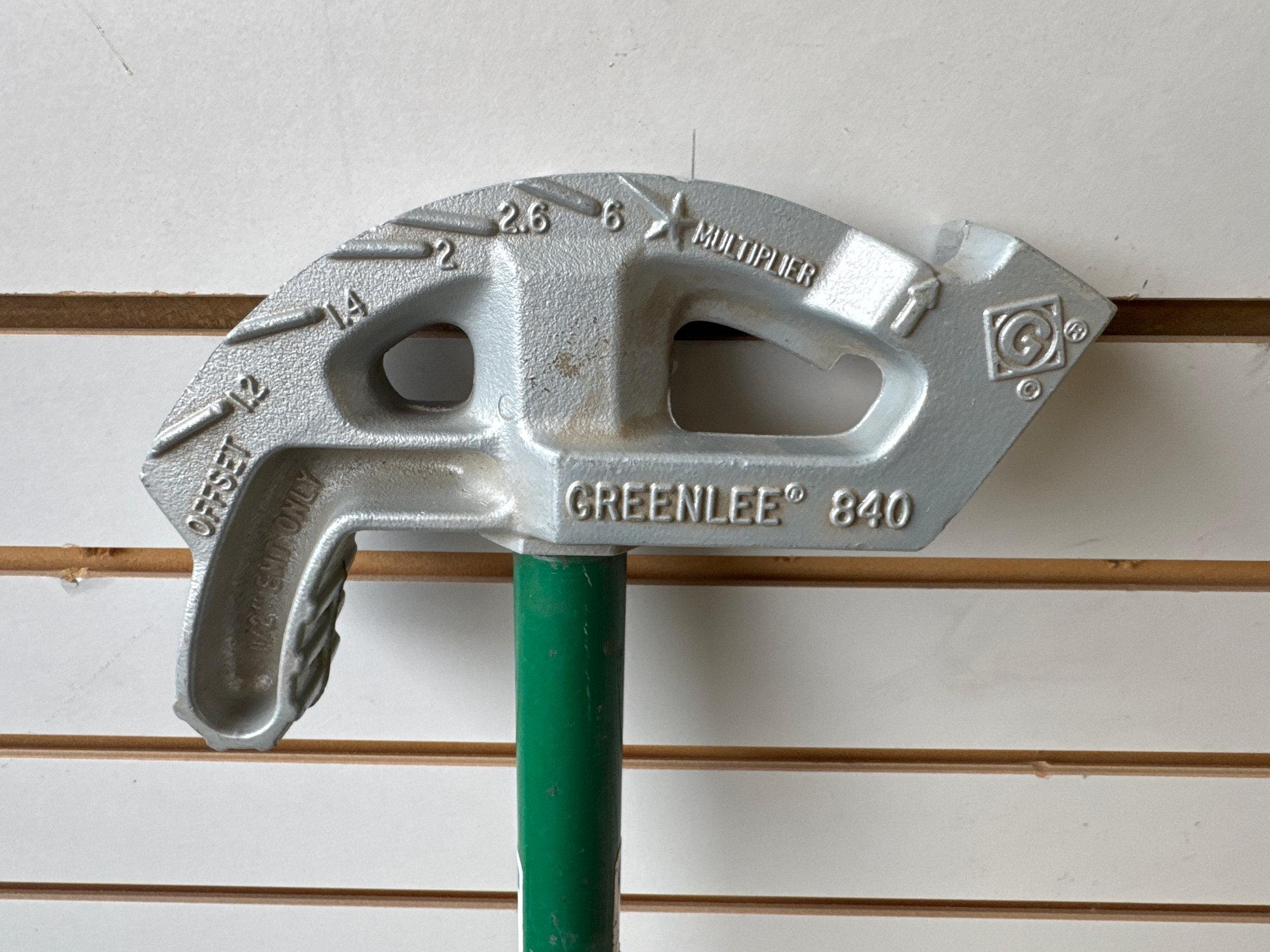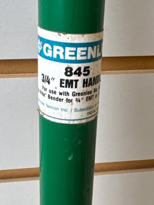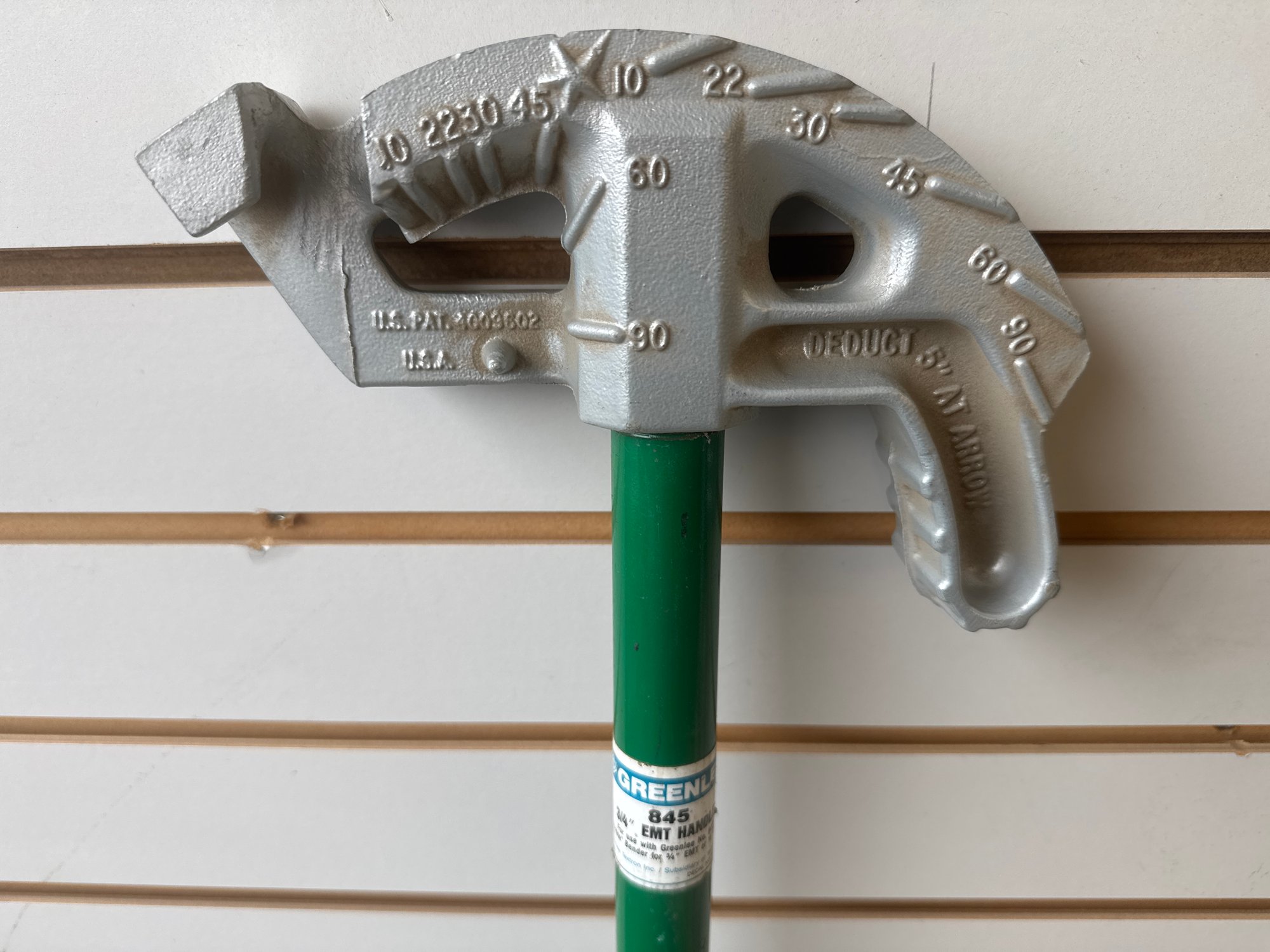 A Greenlee 845 EMT Conduit Pipe Bender, ideal for bending 3/4-inch EMT conduits. Made of durable aluminum and mounted on a sturdy green handle, this tool is perfect for electricians and construction professionals.