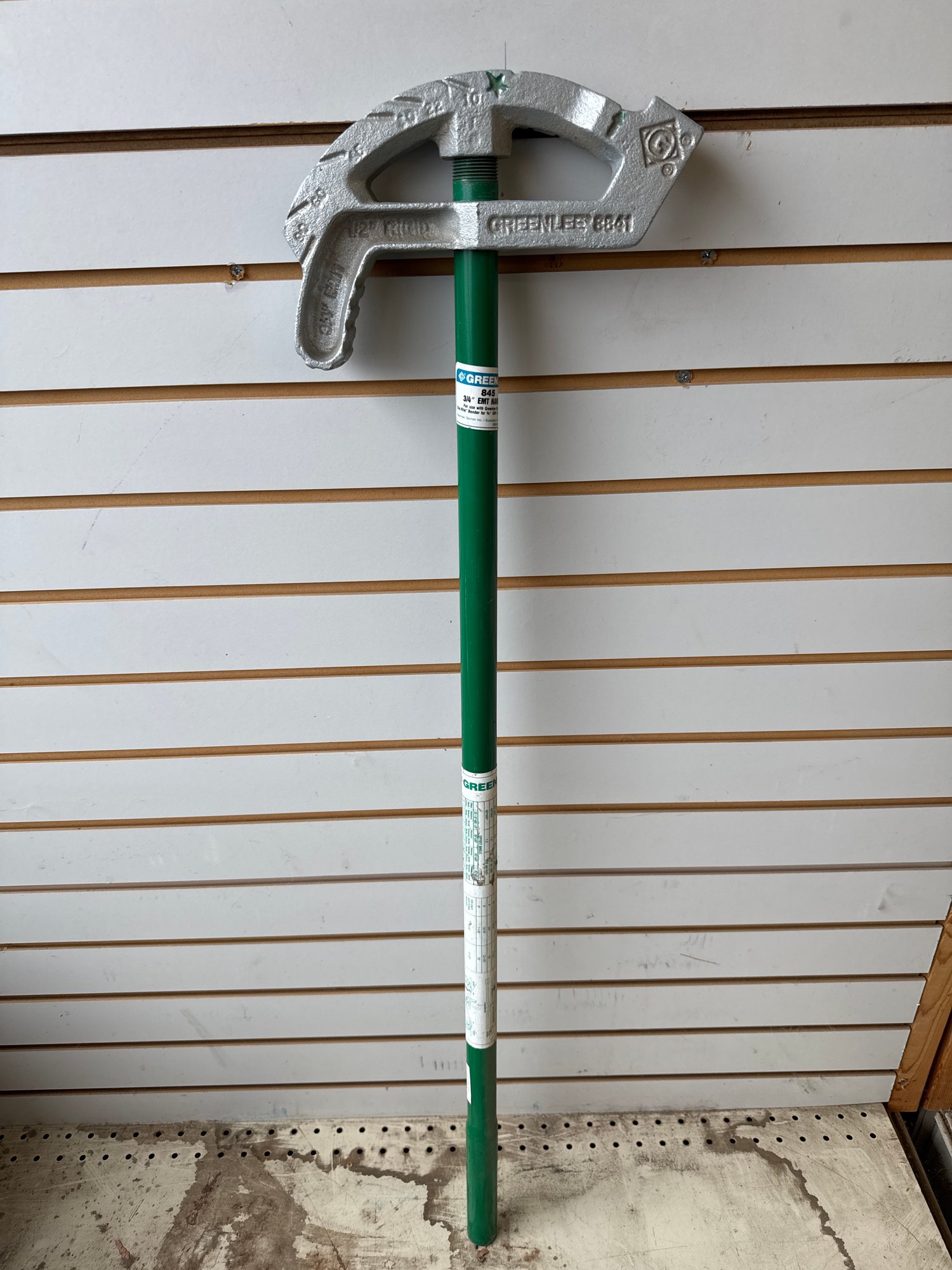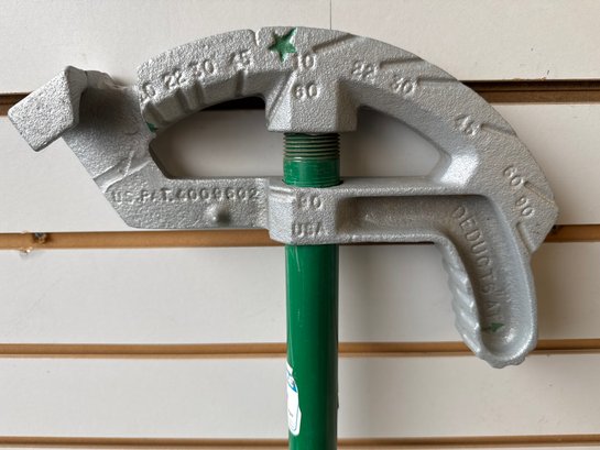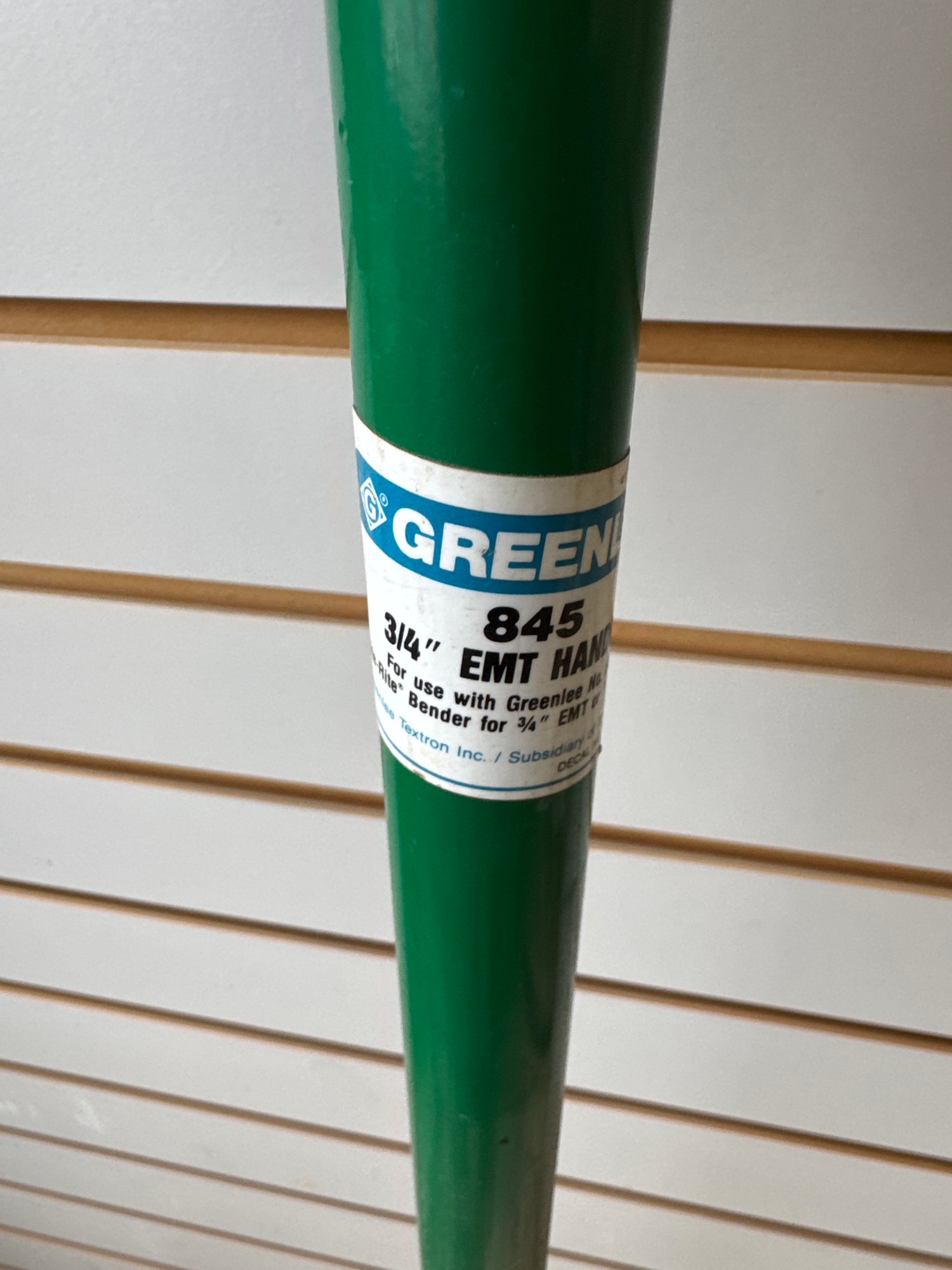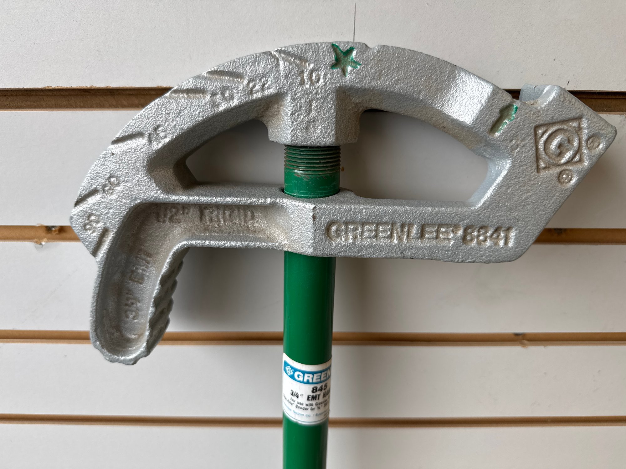 A Greenlee 845 EMT Conduit Pipe Bender, ideal for bending 3/4-inch EMT conduits. Made of durable aluminum and mounted on a sturdy green handle, this tool is perfect for electricians and construction professionals.