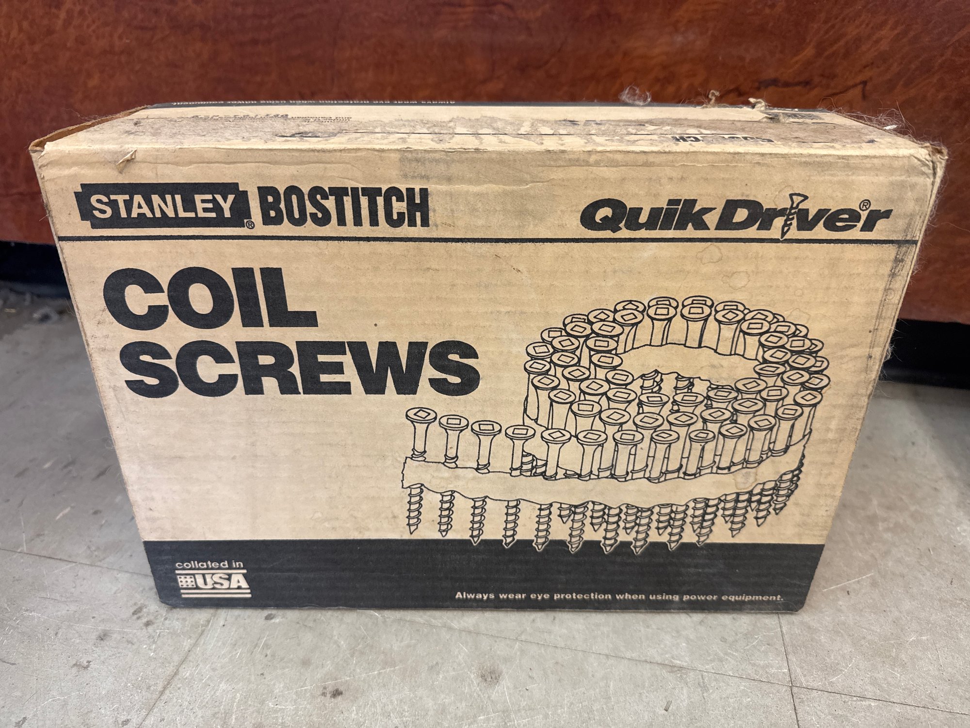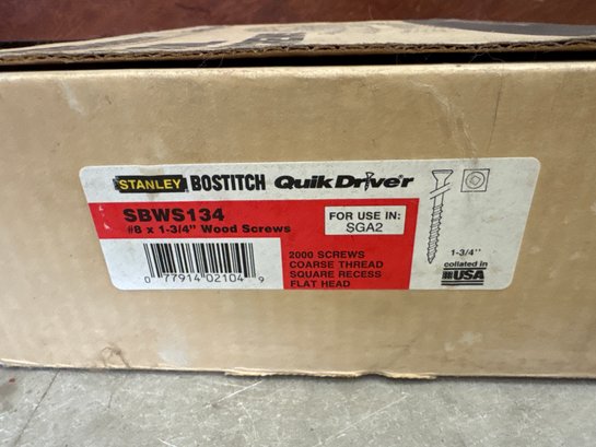 A box of Stanley Bostitch QuickDriver SBWS134 coil wood screws. These screws are #8 with a length of 1-3/4", featuring coarse thread, square recess, and a flat head. Designed for use with SGA2 systems, they are ideal for professional woodworking and construction projects. The box contains 2,000 screws, collated for efficient use and made in the USA.