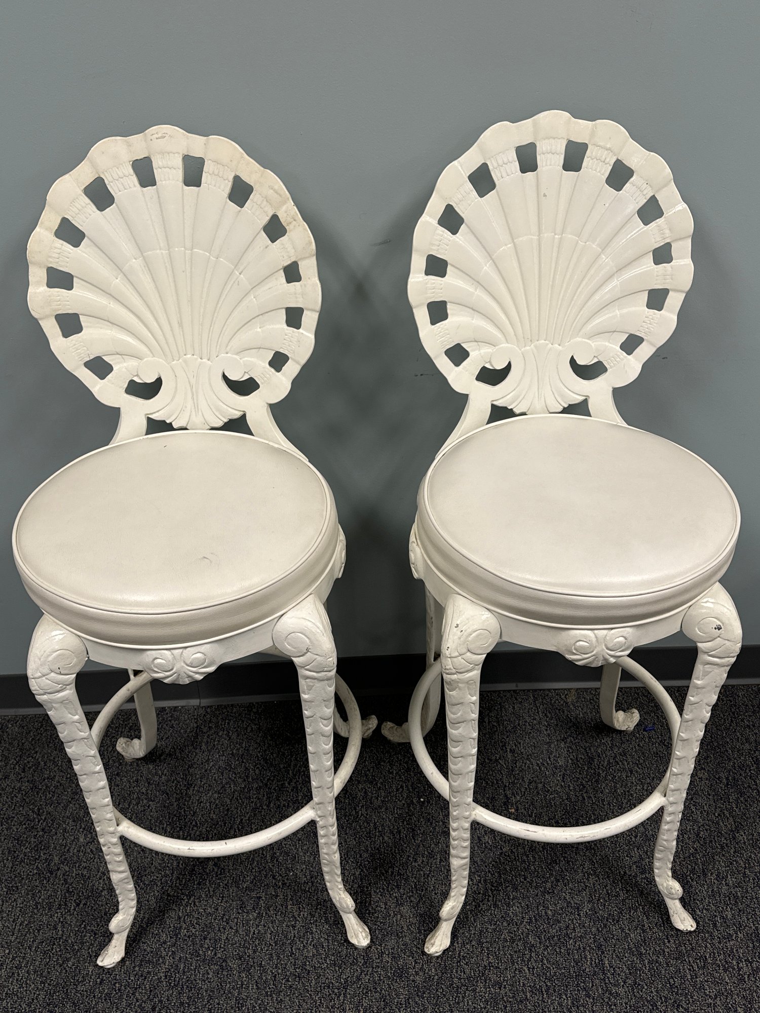 Vintage Cast Iron Shell Back Bar Stool with Upholstered Seat