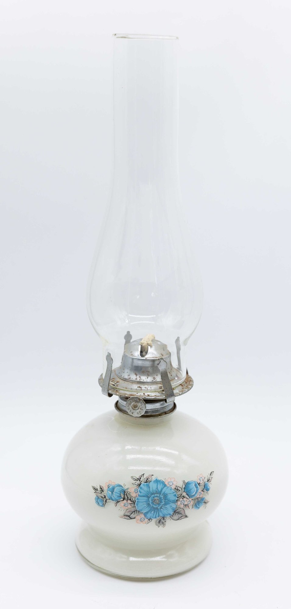 Vintage White Glass With Blue Floral Pattern Oil Lamp