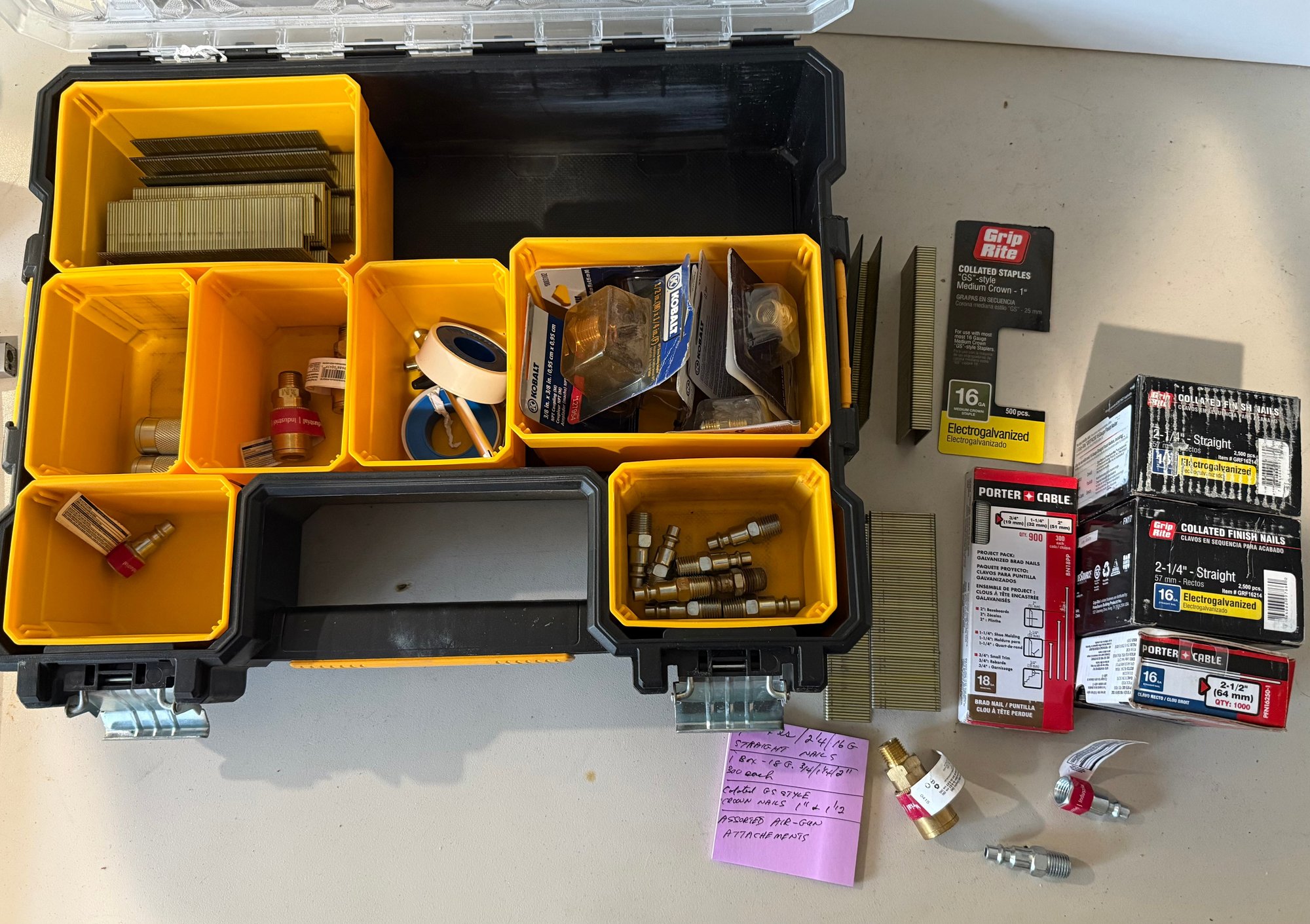 two boxes 2/4 16 G straight nails, one box ATG 3/4/, 1 1/4, 2 inch - 300 each, collated GS style crown nails 1 inch and one and a half inch, assorted air gun attachments