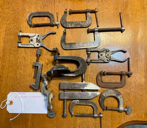 12 Clamps, small size, unique. Antique tools for. Antique tools some marked from Cincinnati and chicago . And a Magic Vulcanizer
