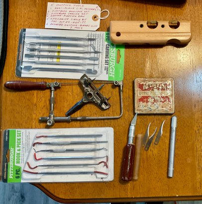 Radi plane L. A. Mathers company. Pittsburgh Hook and pick set. Pittsburgh carving set. Antique piercing saw. Otis and Smith circlebit, patent October 24, 1865. Assorted cutting blades with two tools.
