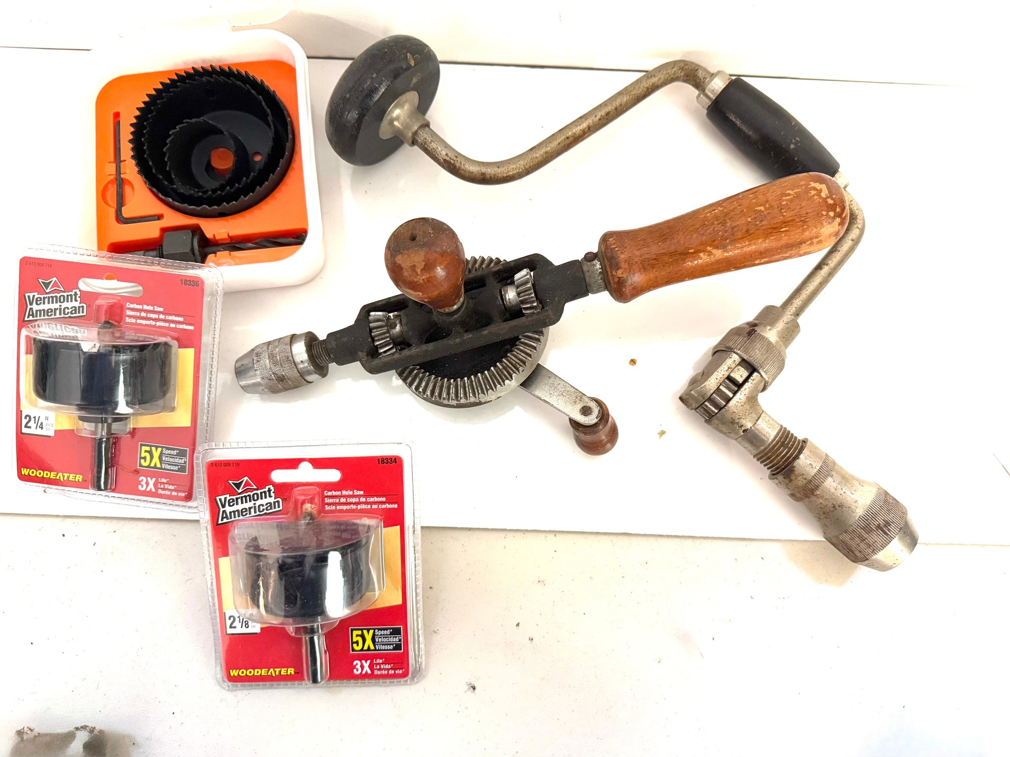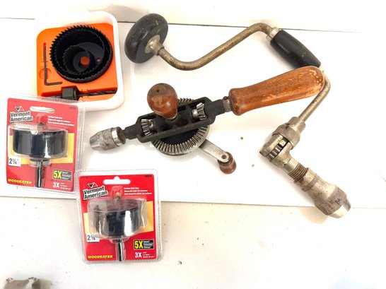 Bit brace and hand drill. Includes 3 Hole saws.