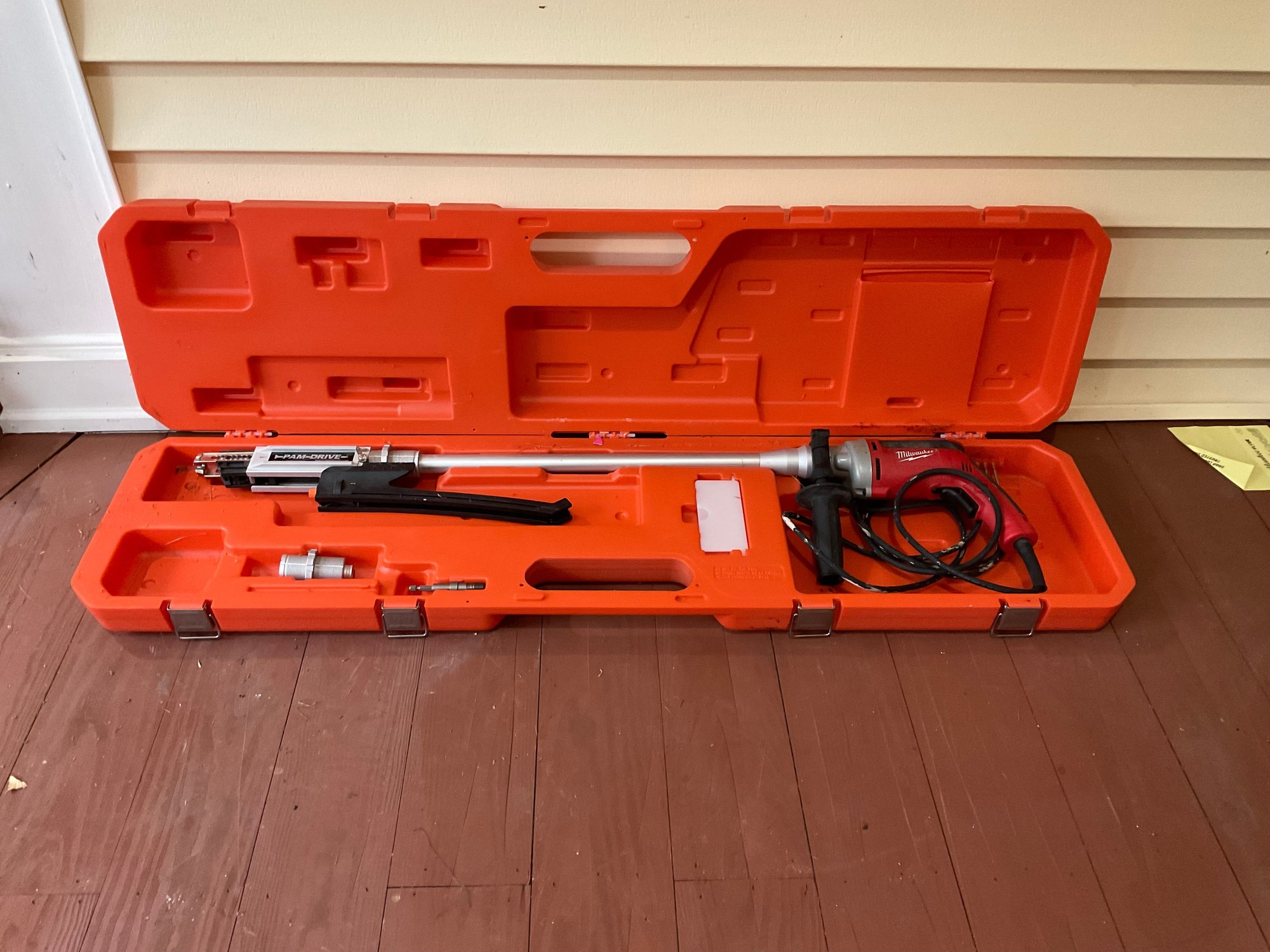 Milwaukee electric tool for floor installation. Used on one job for laying of 750 square feet of floor. Using collated screws makes it easy for floors or sheet rock ceilings. No bending and ladders once ceiling is tacked up.