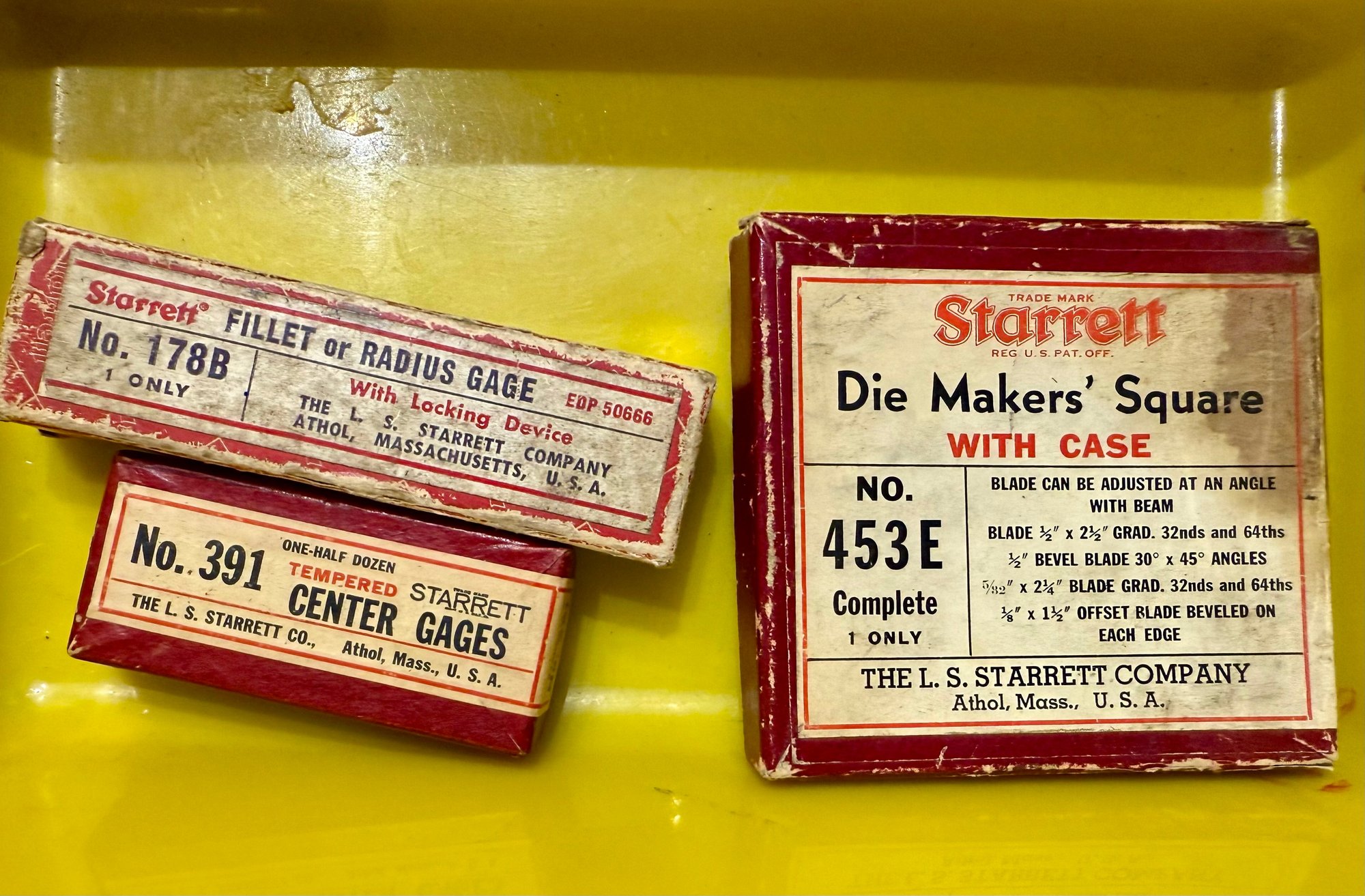 Hard to Find collectables. Starrett vintage gages in original boxes. Square in Box and vinyl case. Athol, MA, collectible antiques.