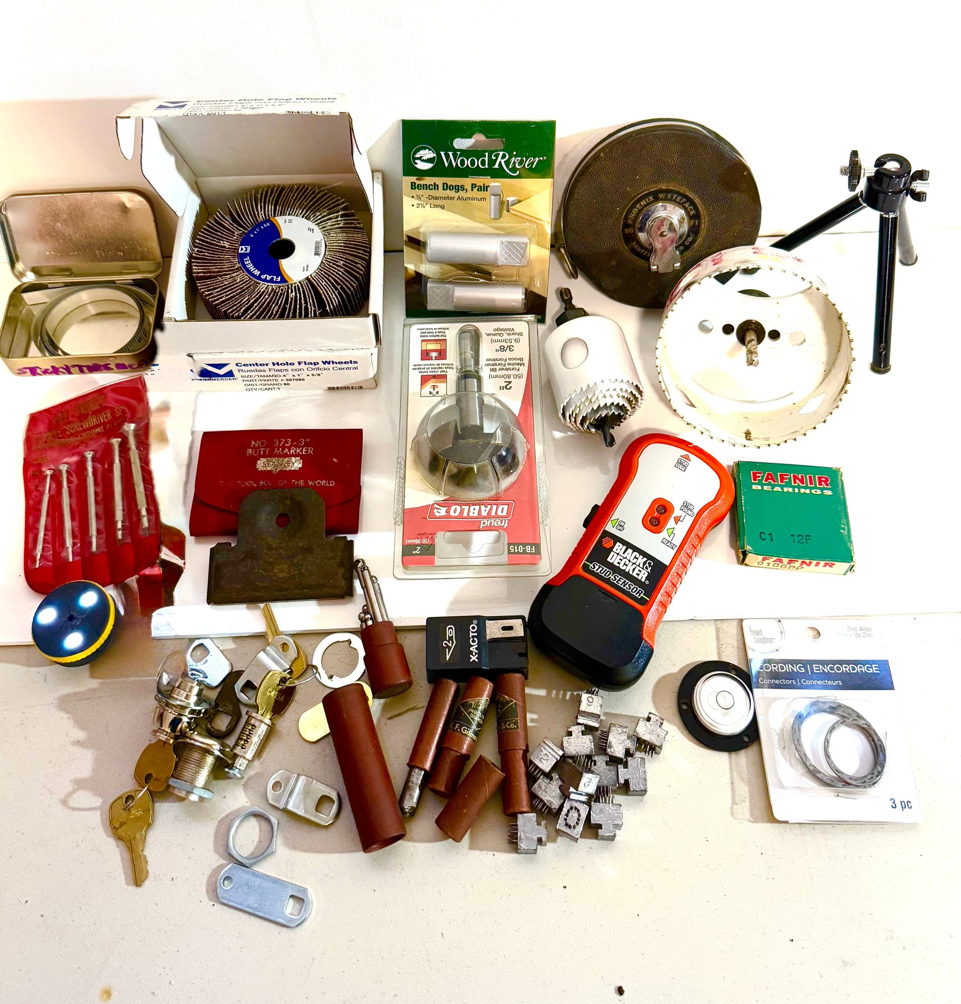 See photos, measuring tape, Gilmore Industrial Diamond, hole saw, lock inset with keys, studfinder, Fafnir Bearing in box