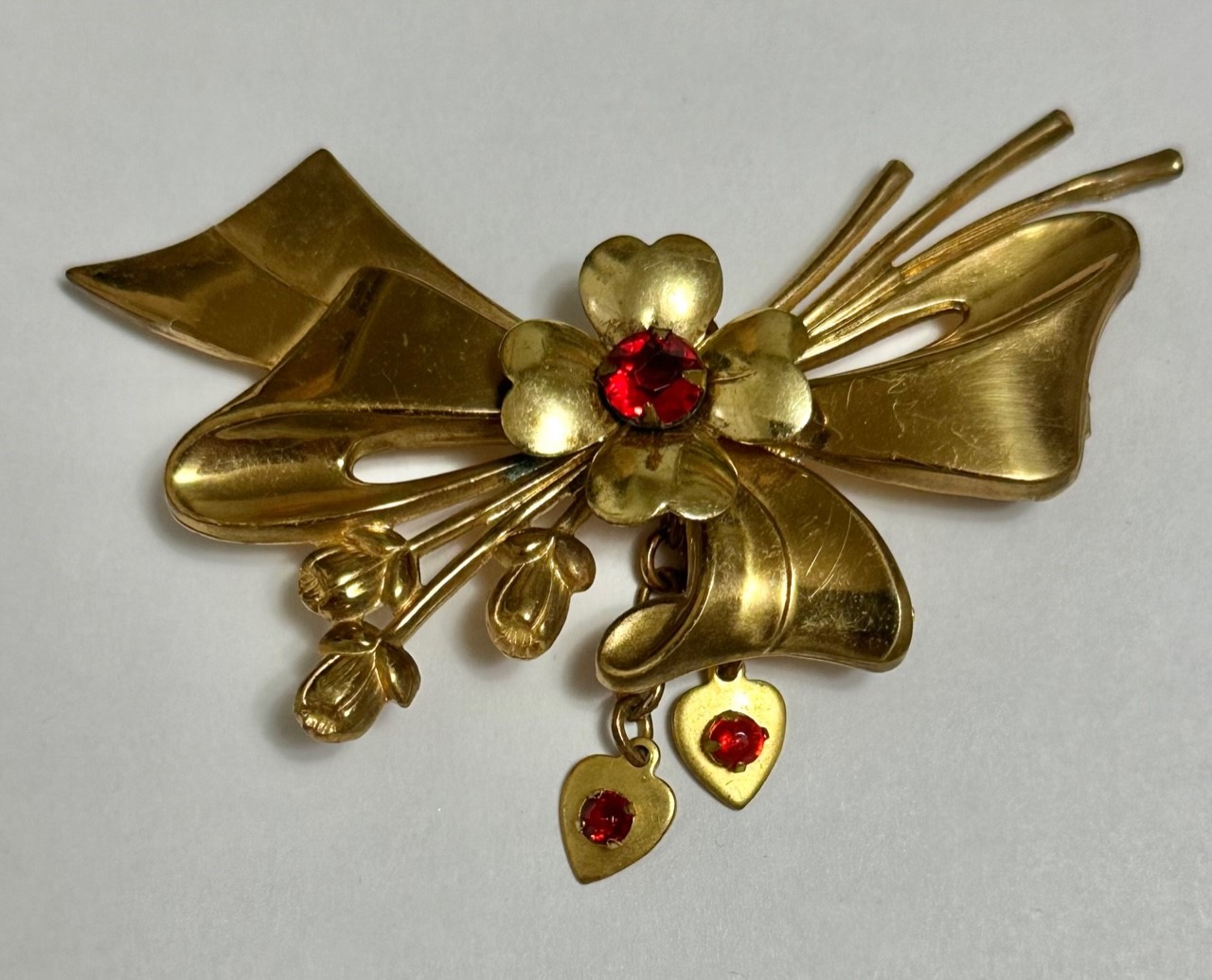 Vintage bow pin with red rhinestones