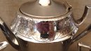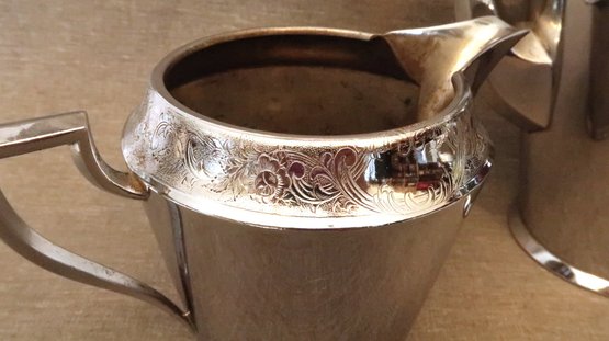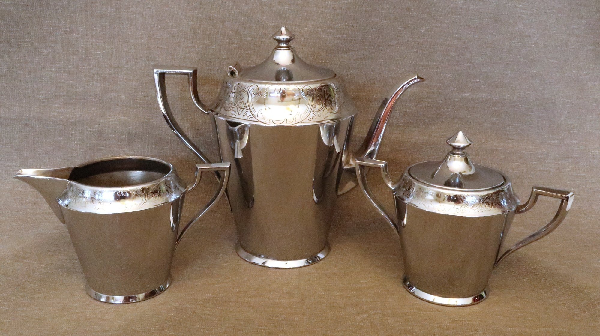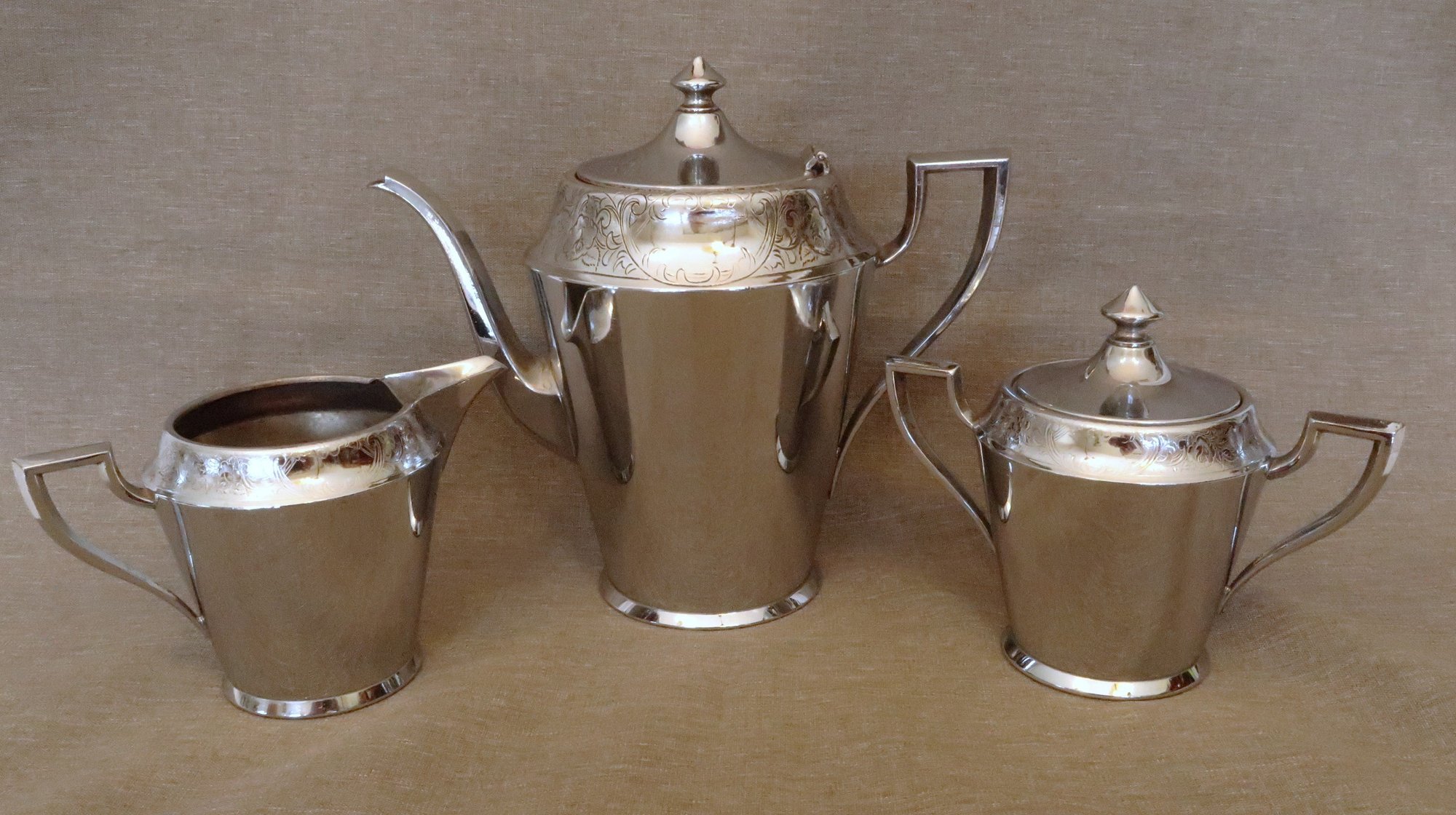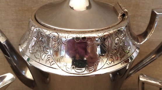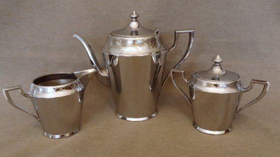 Includes a teapot/coffee pot, a cream pitcher, and a covered sugar bowl