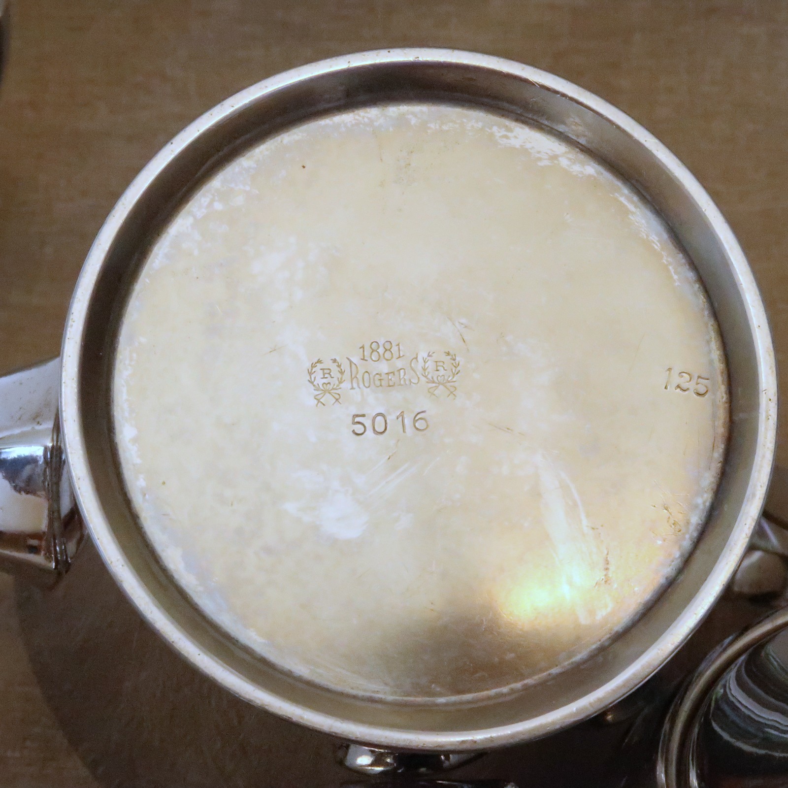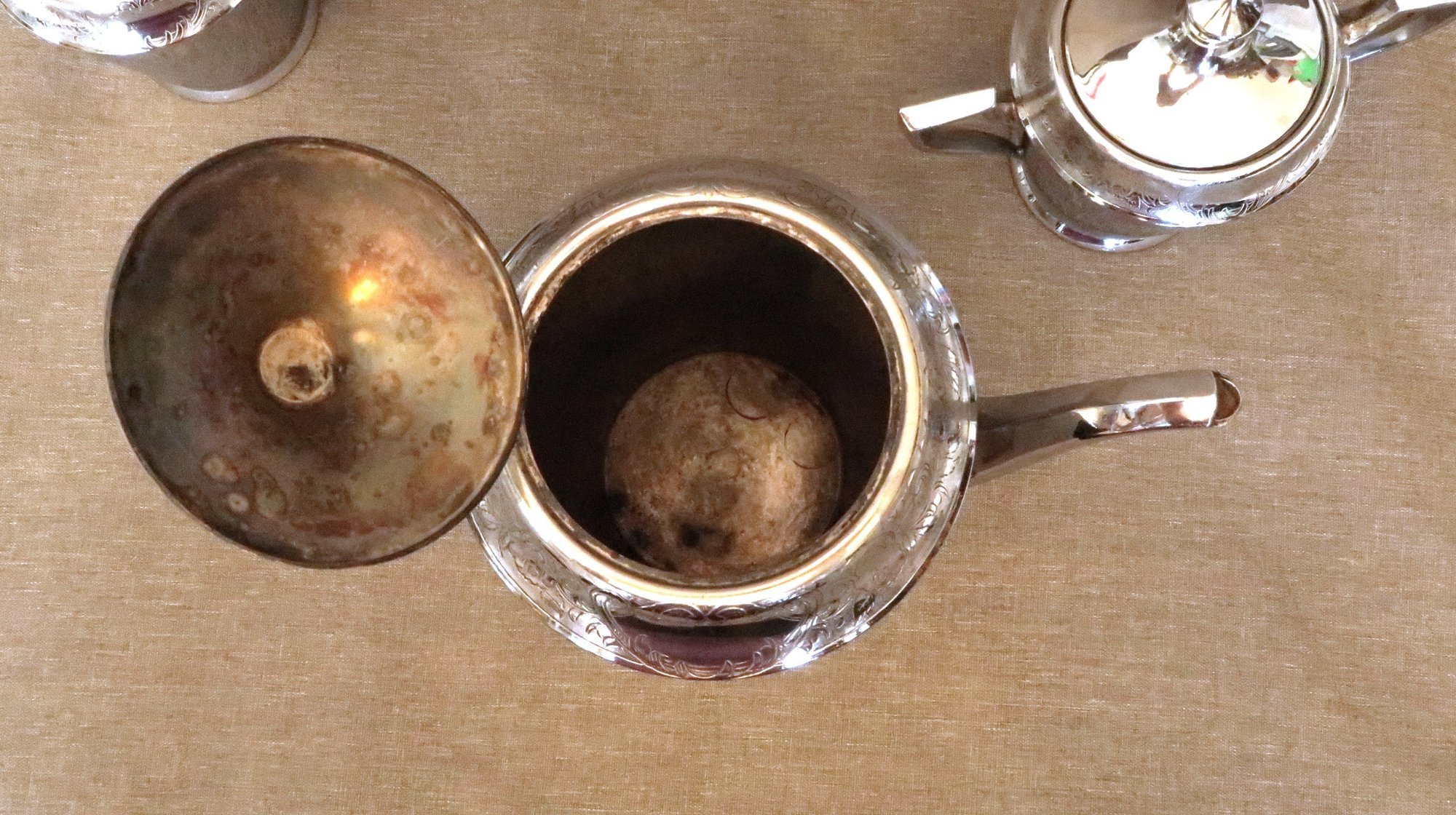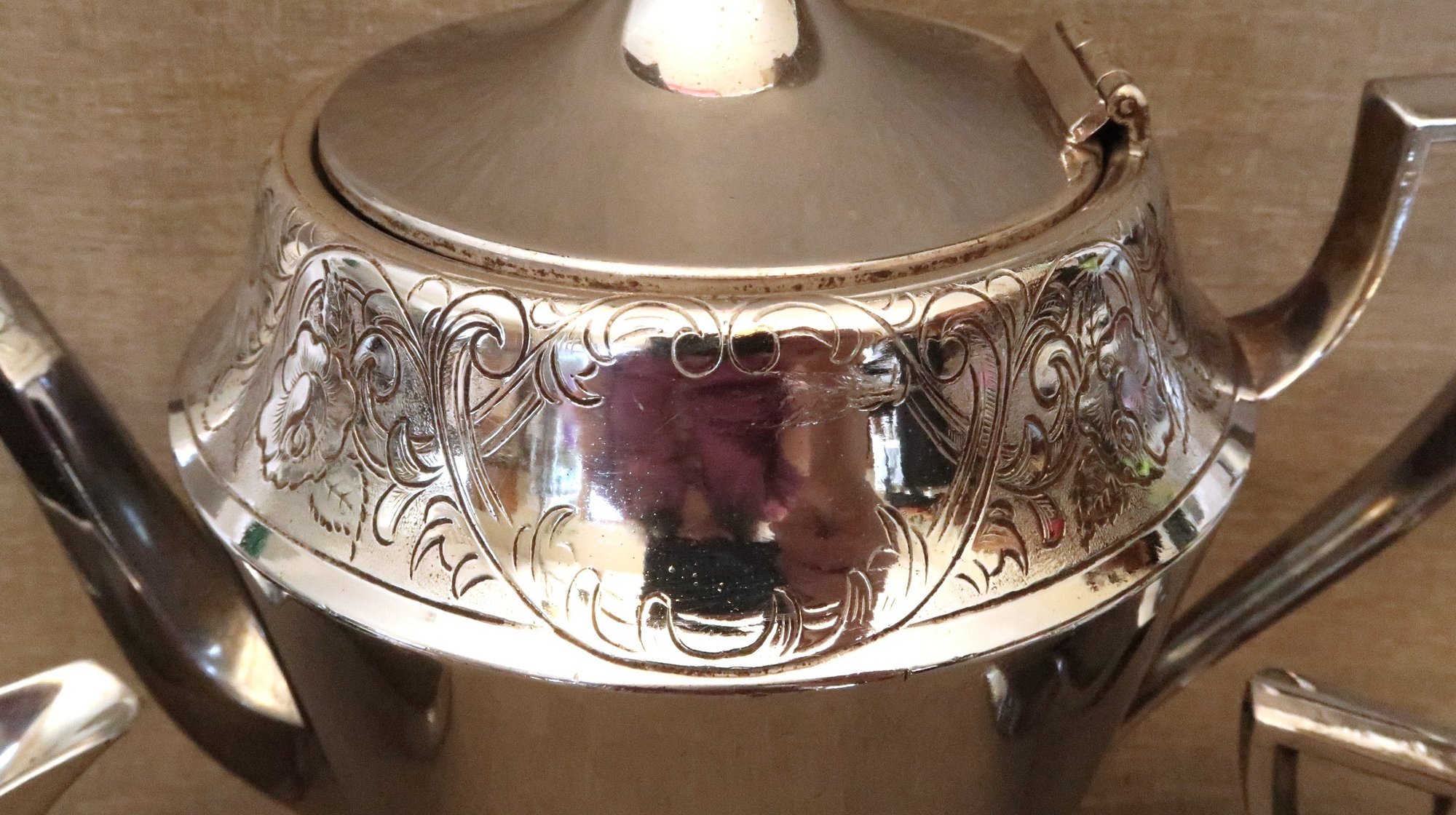 Includes a teapot/coffee pot, a cream pitcher, and a covered sugar bowl